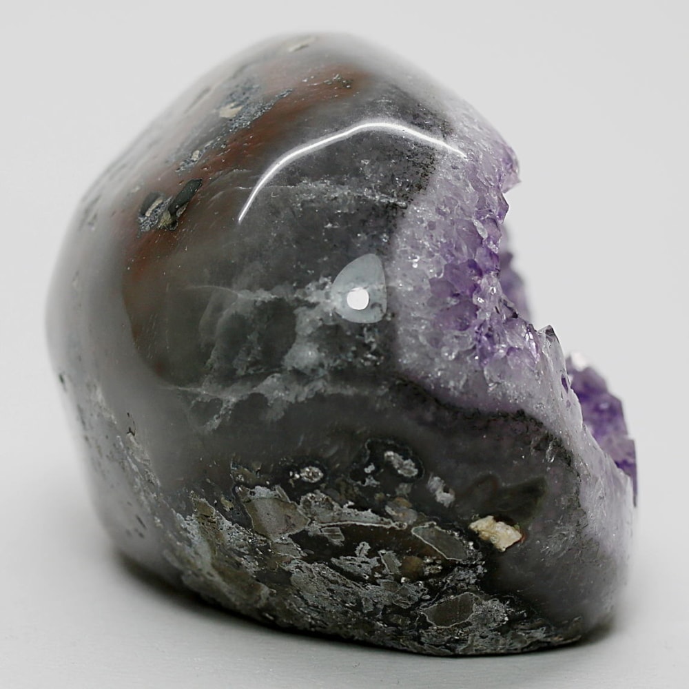 口を大きく開け、まるで微笑んでいるかのような形状を持つアメジストジオードは「笑口(わらいぐち)」と呼ばれ、古くから縁起の良い形として親しまれてきました。