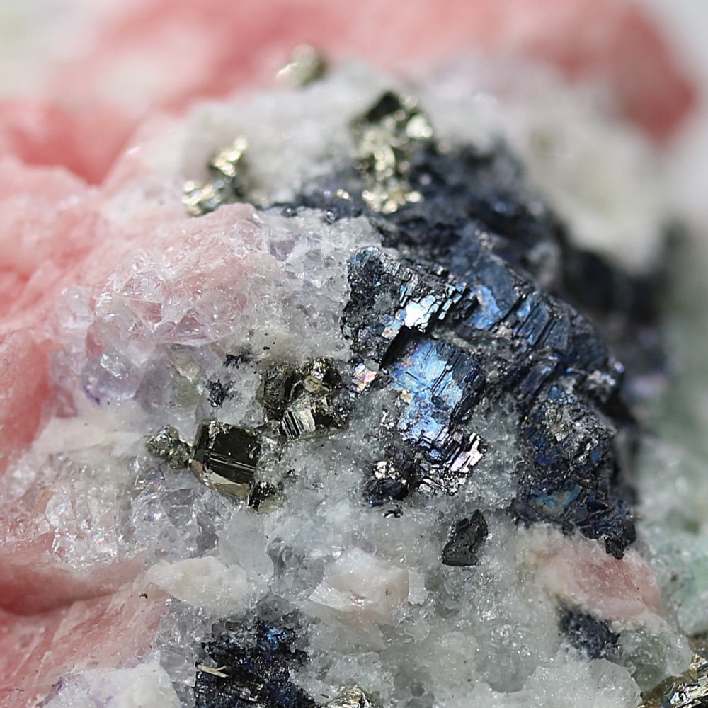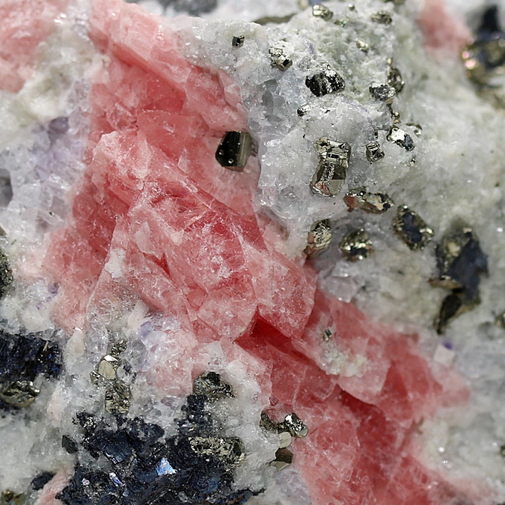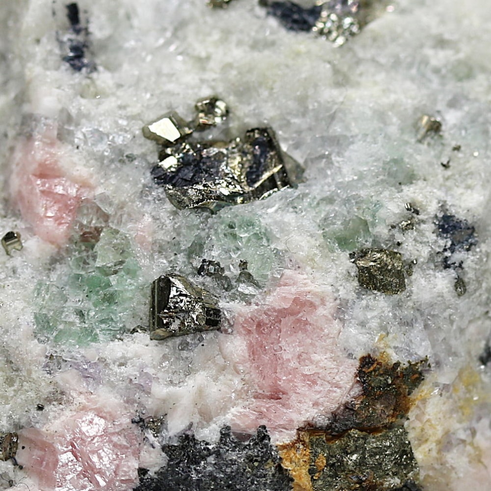 母岩にはインカローズだけでなく、フローライト(蛍石)やパイライト(黄鉄鉱)が共生しており、自然が生み出した複雑で奥行きのある景観を形成しています。