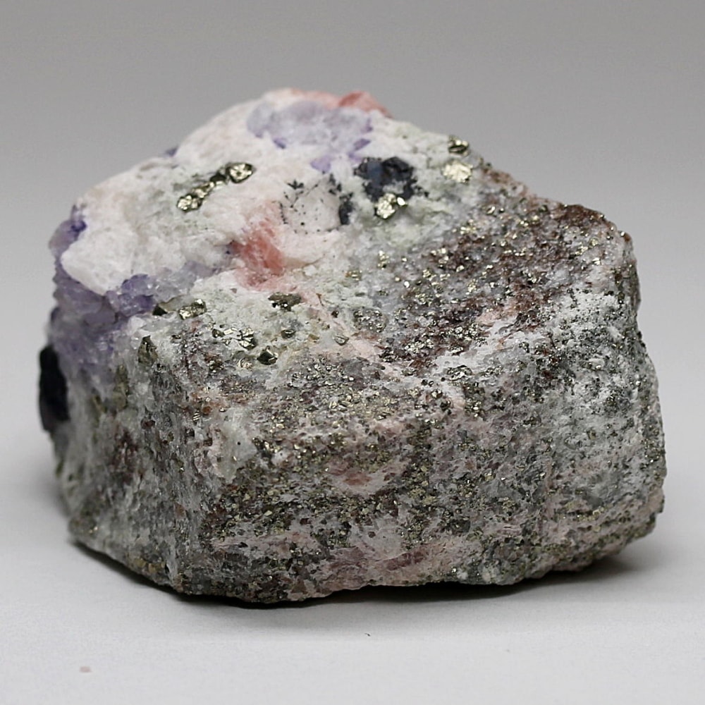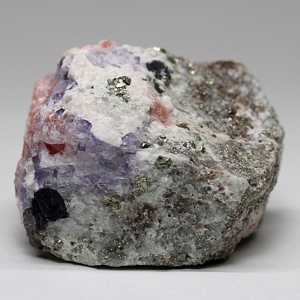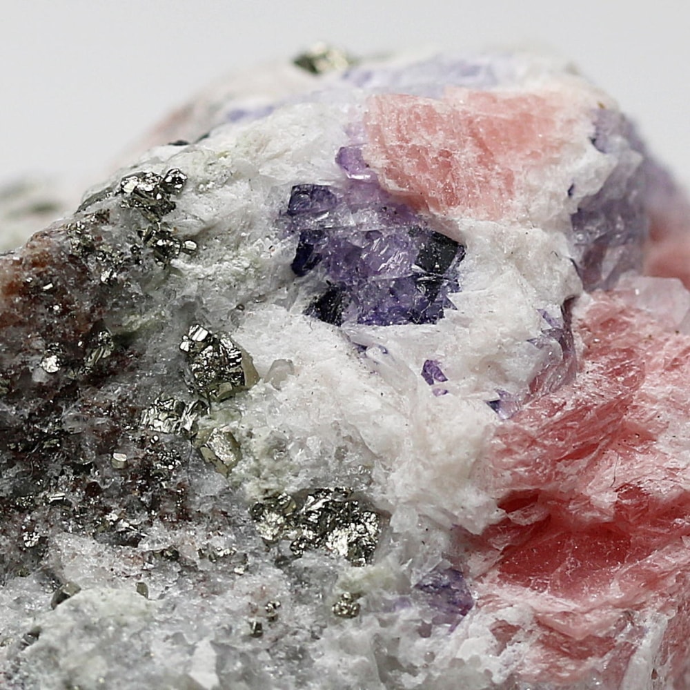 母岩にはインカローズだけでなく、フローライト(蛍石)やパイライト(黄鉄鉱)が共生しており、自然が生み出した複雑で奥行きのある景観を形成しています。