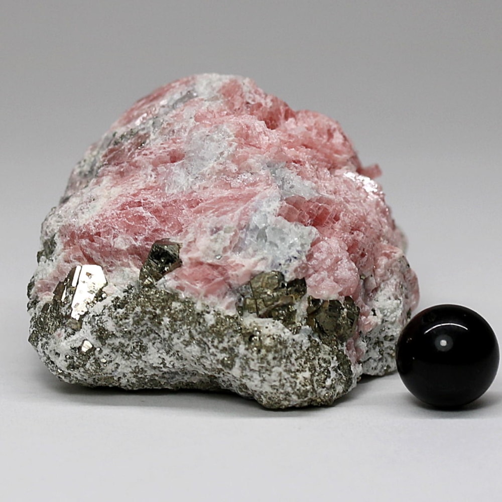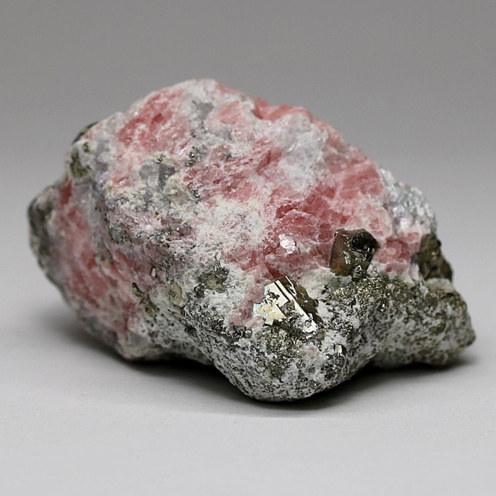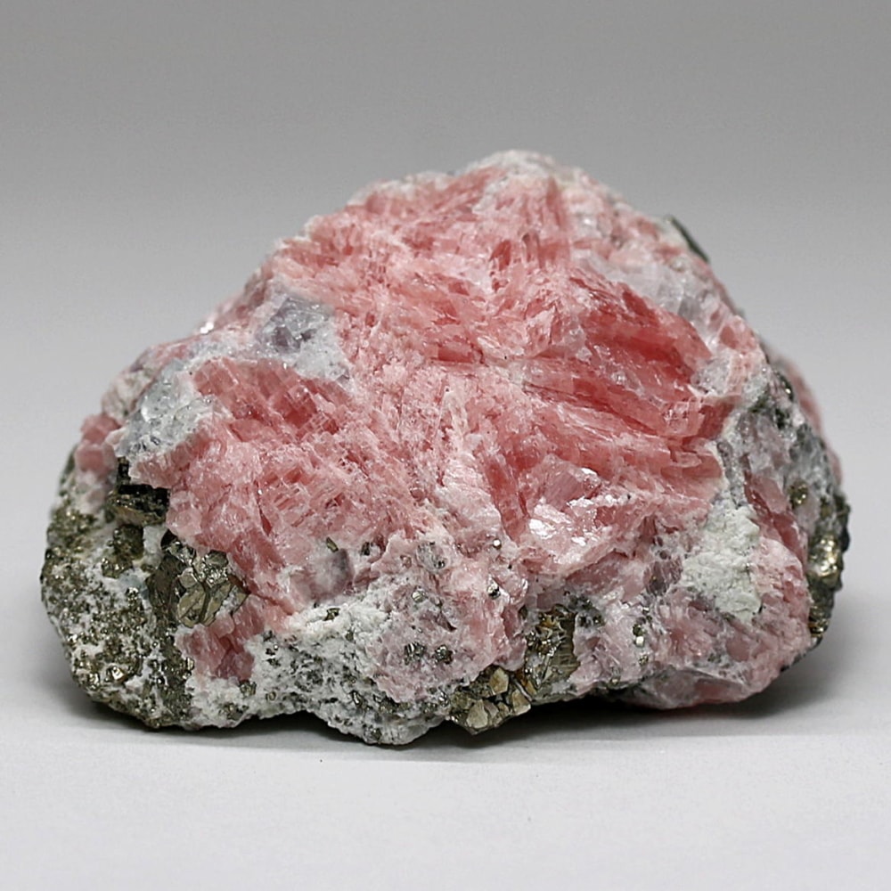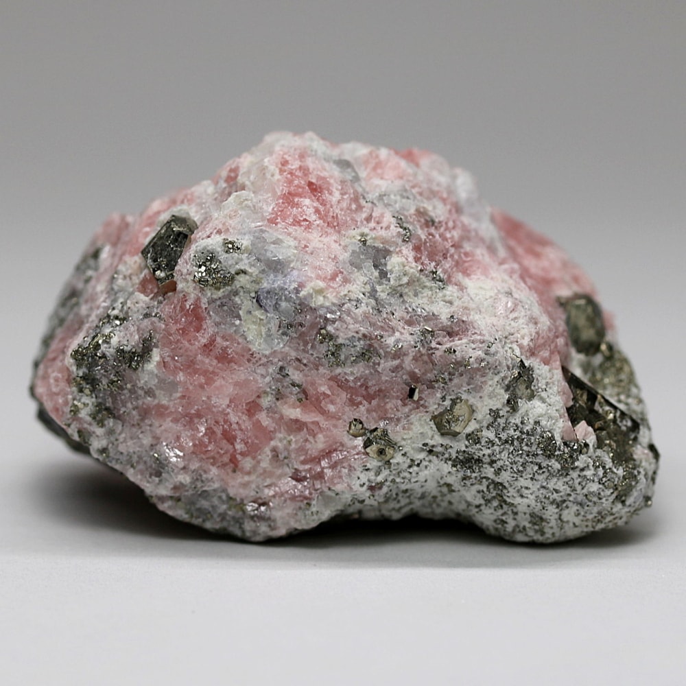 インカローズ結晶原石(ロードクロサイト)/微フローライト&パイライト共生(総重量83.2g)
