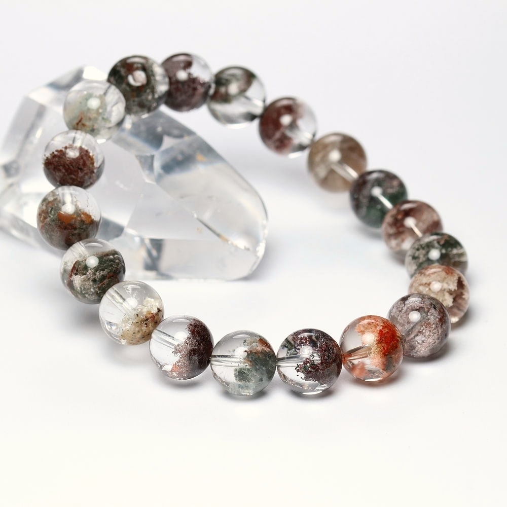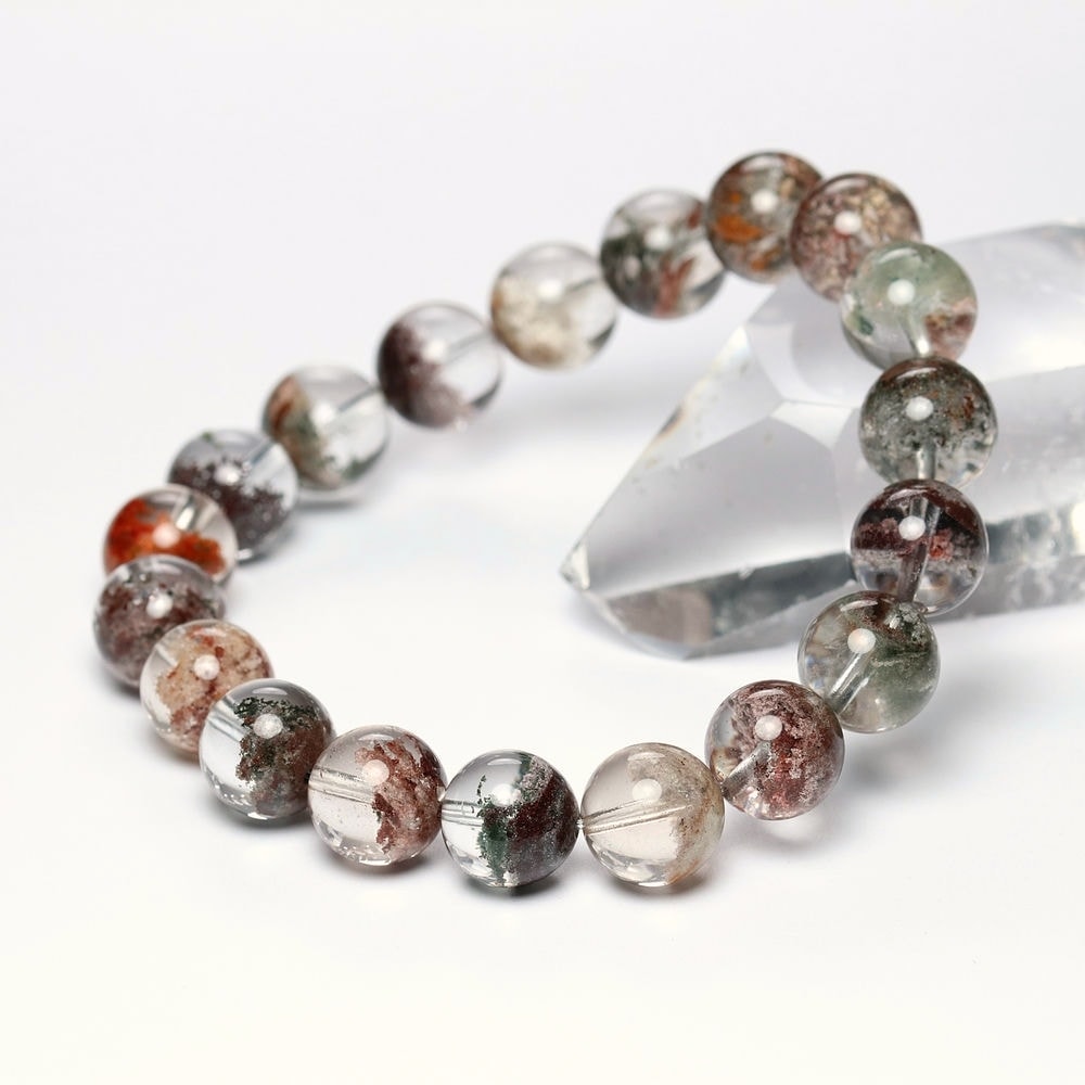 様々な成分や鉱物が透明度高い水晶内部に閉じ込められた、貴重な高品質ミックスガーデンクォーツブレスレットでございます。