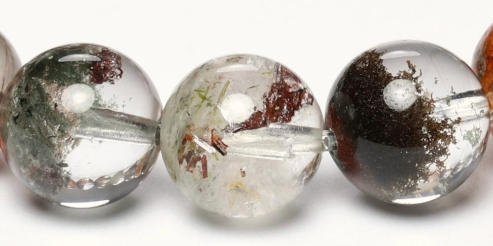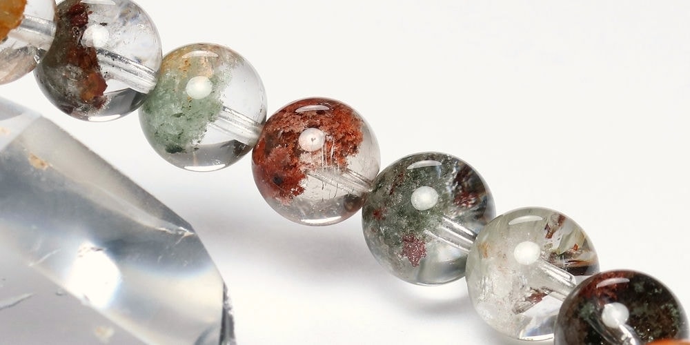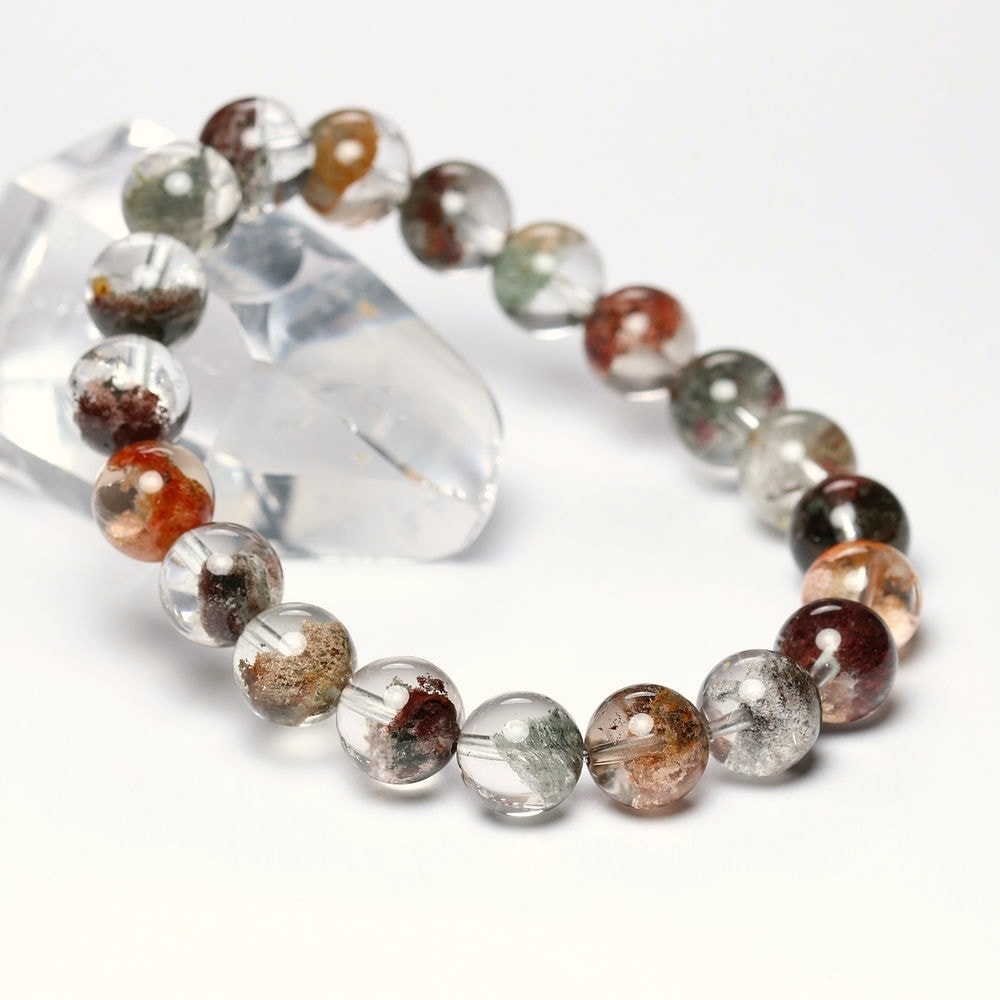 様々な成分や鉱物が透明度高い水晶内部に閉じ込められた、貴重な高品質ミックスガーデンクォーツブレスレットでございます。