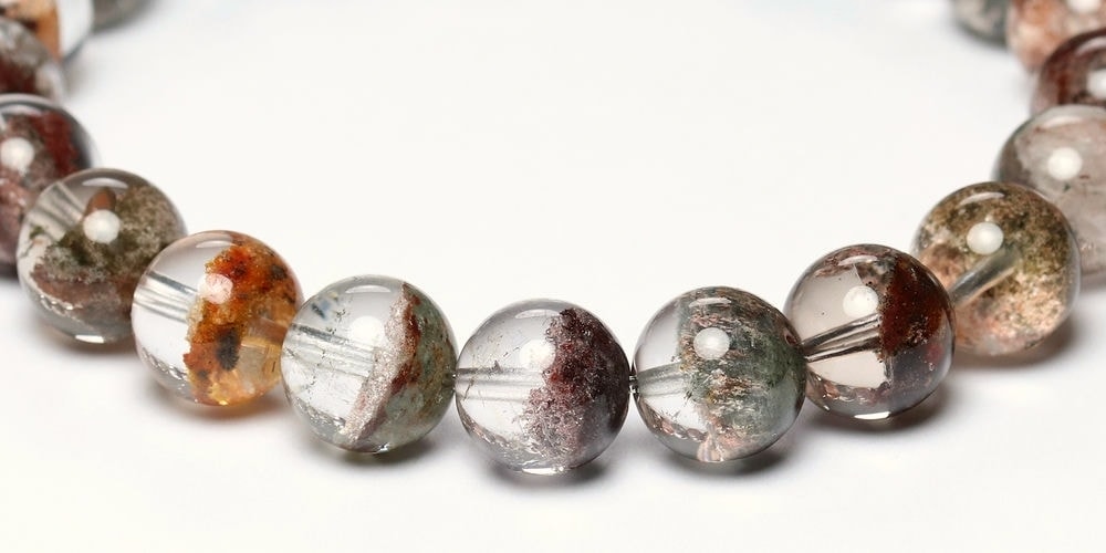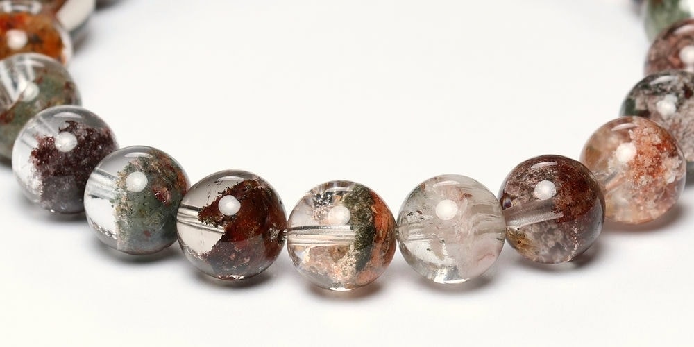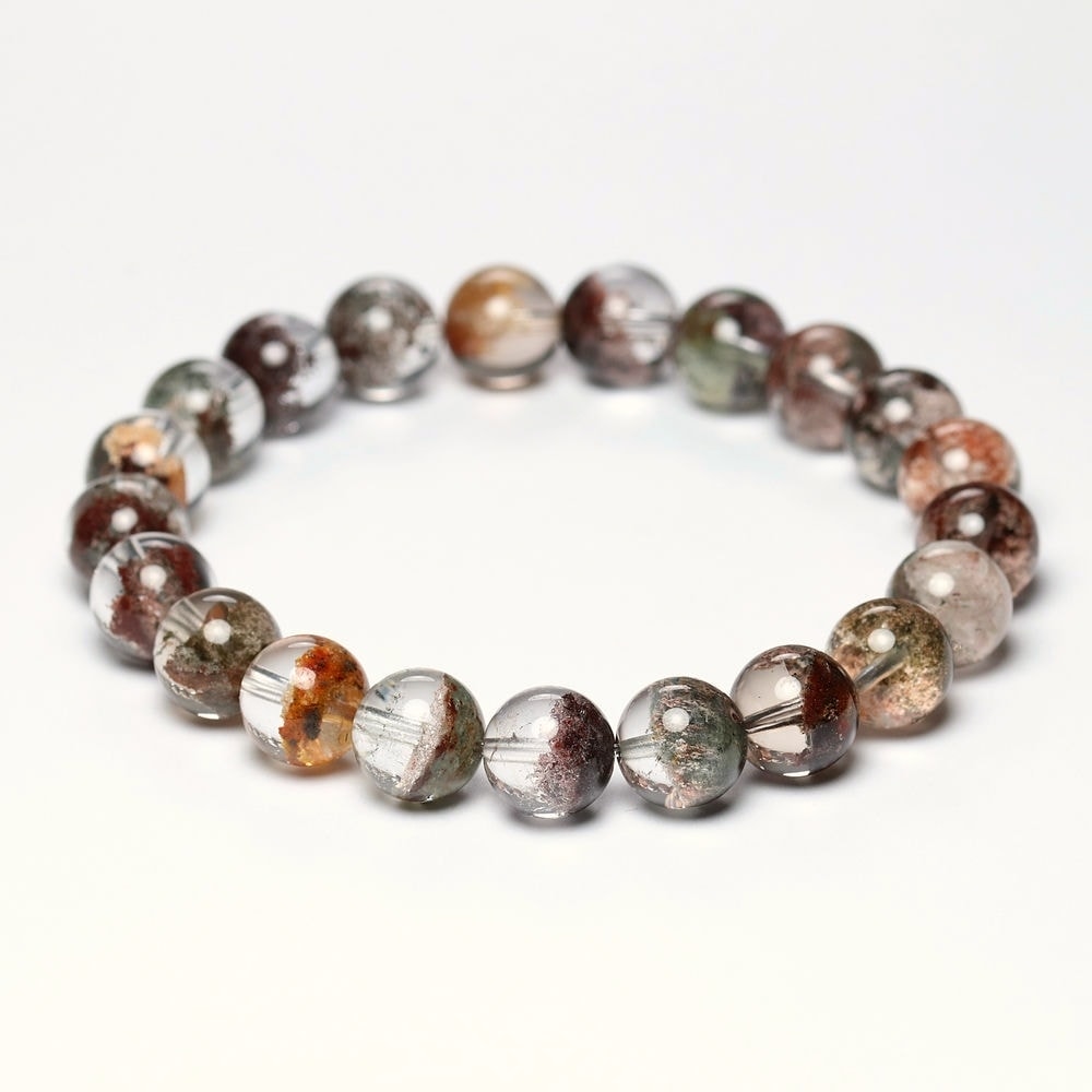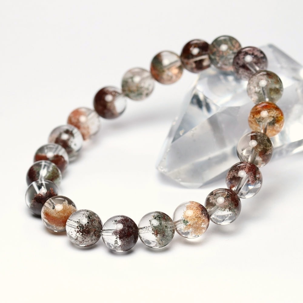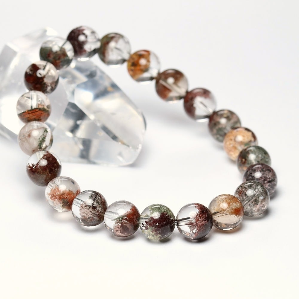 様々な成分や鉱物が透明度高い水晶内部に閉じ込められた、貴重な高品質ミックスガーデンクォーツブレスレットでございます。