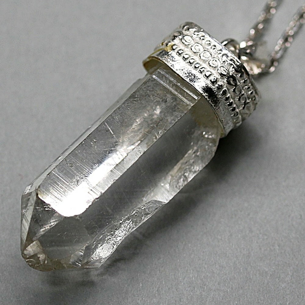 ペンダント加工は、水晶が持つ自然な表情や透明感を損なわないよう、ひとつひとつ丁寧にハンドメイドで仕立てております。