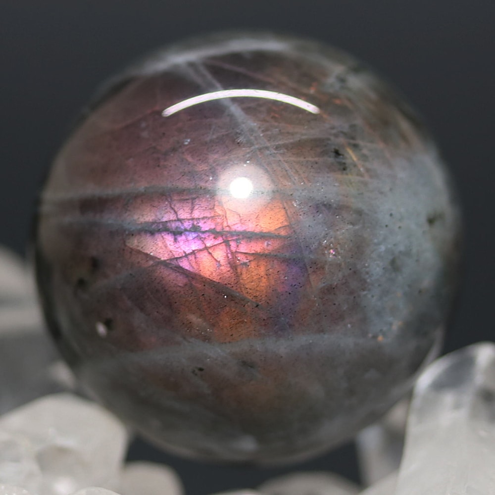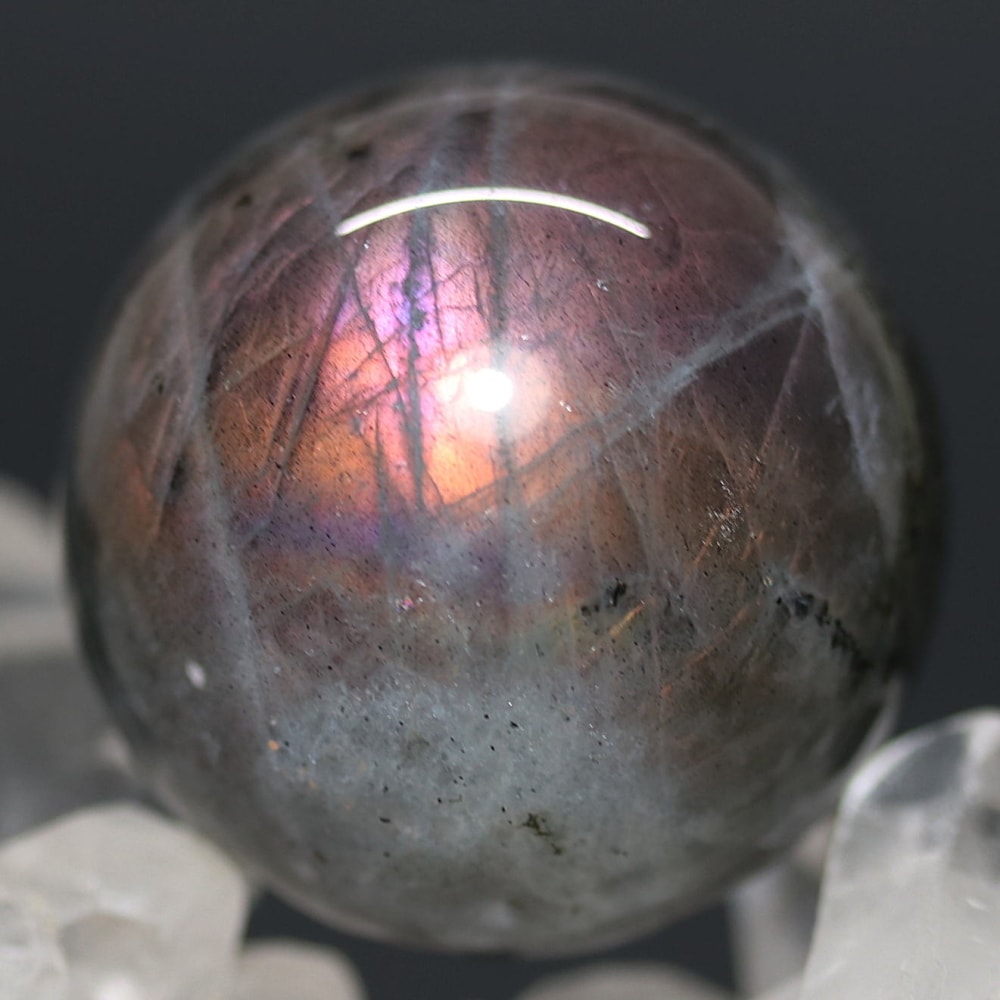 ピンクやパープルのラブラドレッセンスが現れた天然ラブラドライト原石を削り磨き上げた、ラブラドライト丸玉(スフィア)でございます。