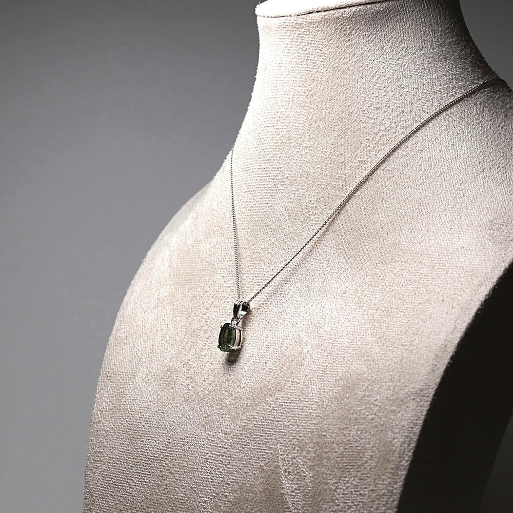 特異な起源を持つモルダバイトは、持ち主の意識を高め、不要な流れを断ち切り、新たなステージへ導く石と云われています。中でもペンダントは心臓に近い位置で身に着けることで、そのエネルギーを穏やかに受け取りやすいとされ、直感力や決断力を高めたい時のお守りとして選ばれることが多い存在です。
