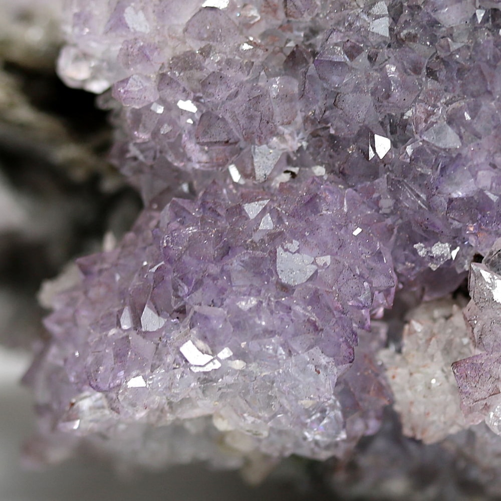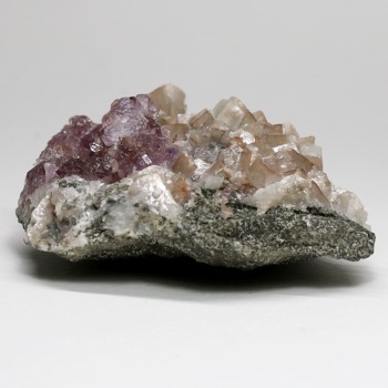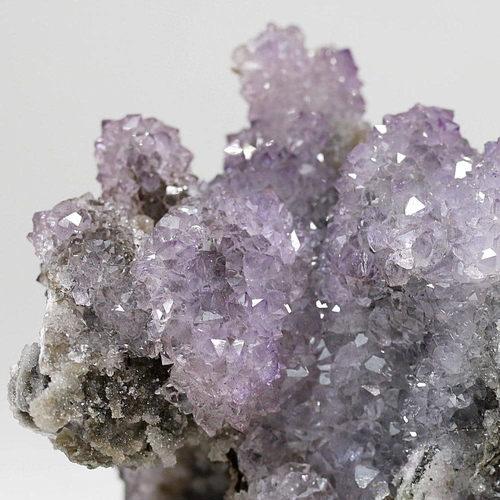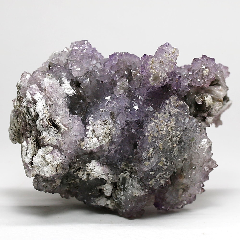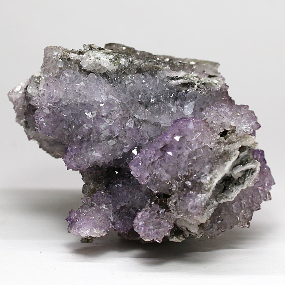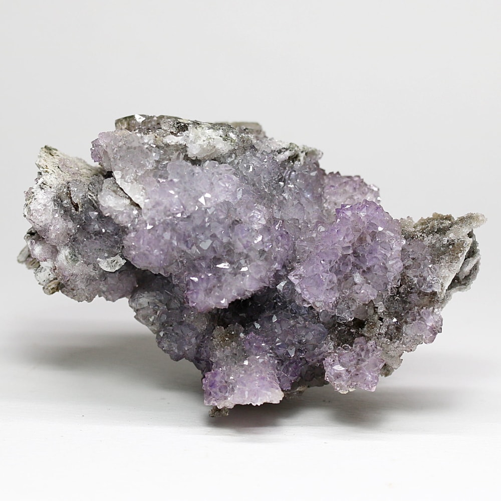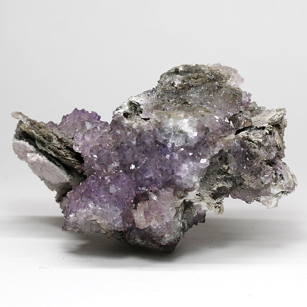 さらに、こちらのクラスターにはレピドクロサイトがインクルージョン。紫色の結晶に赤みを帯びた斑点状の模様が、鉱物の奥深さを感じさせる表情を添えています。