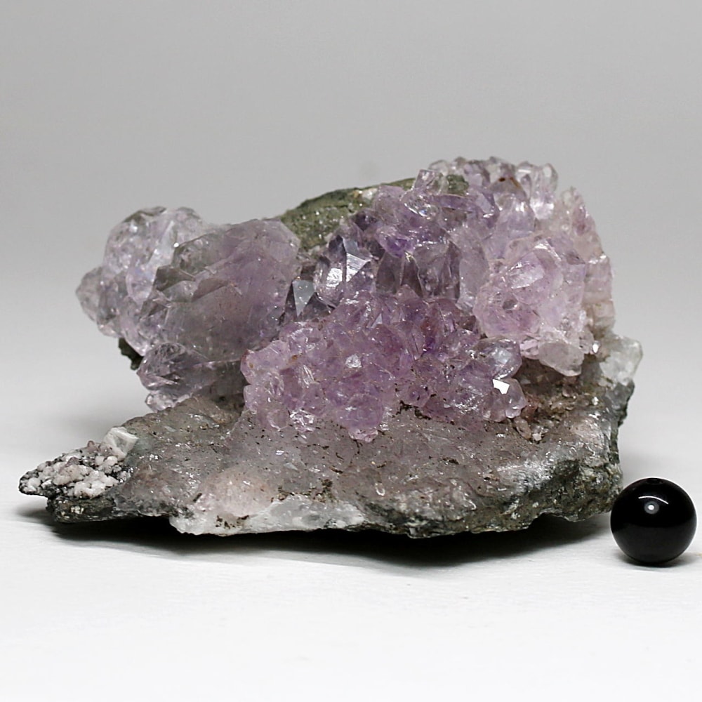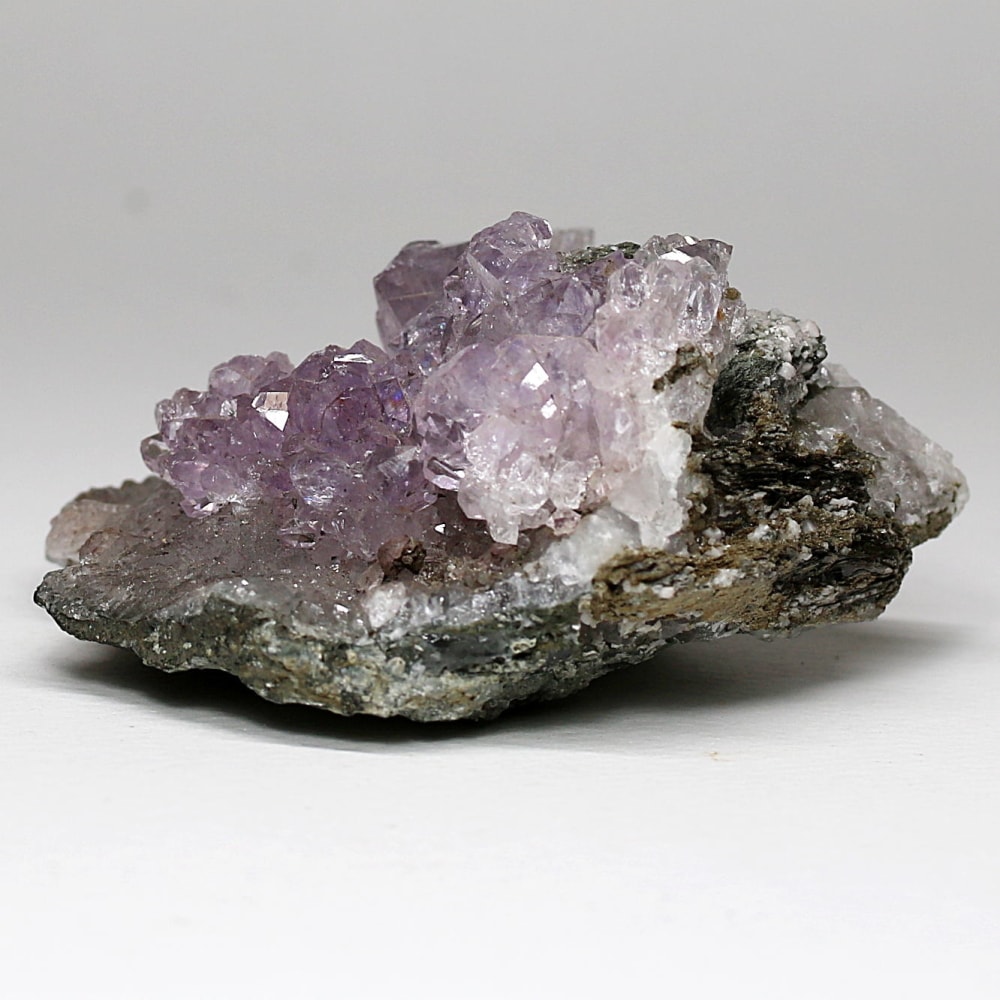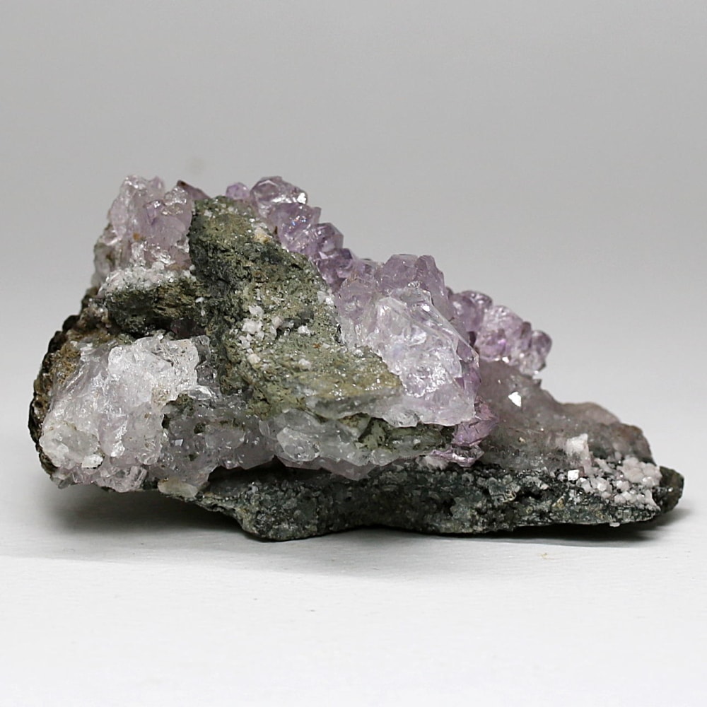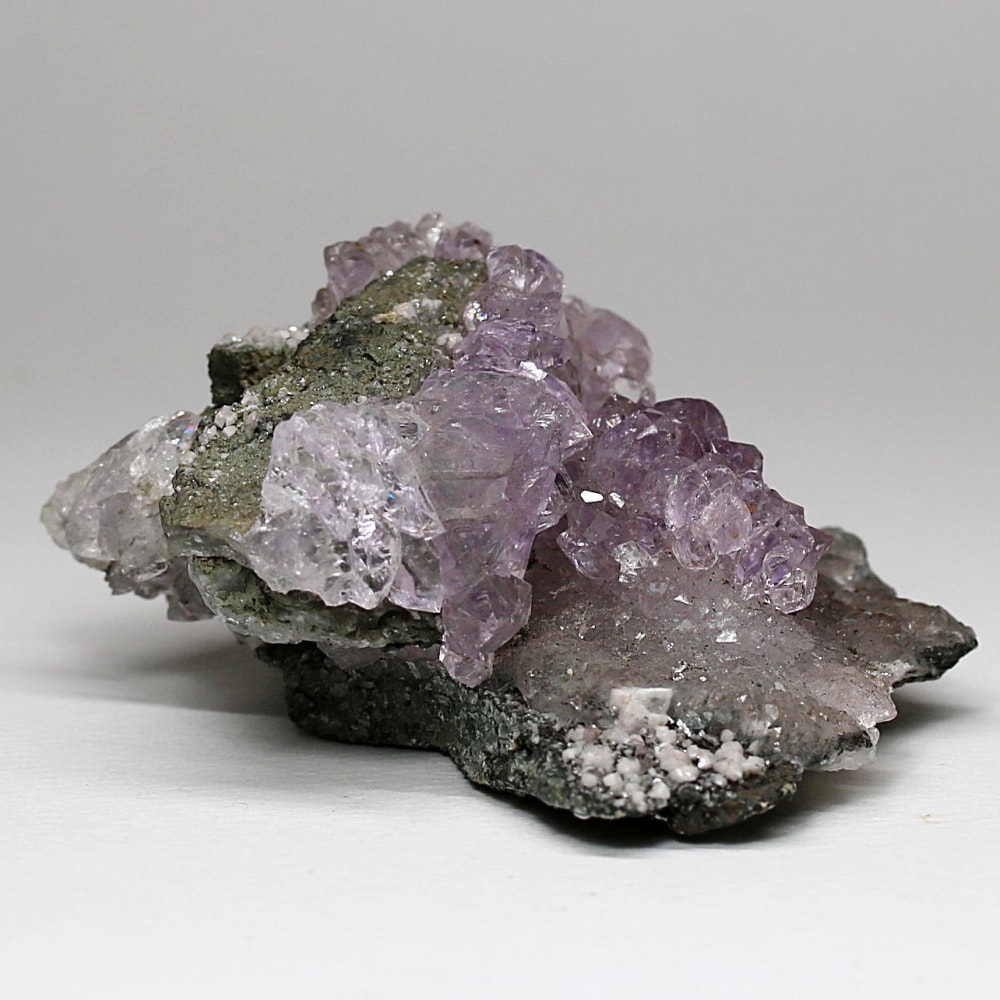 カルール産アメジストエレスチャルは、紫水晶としての気品ある色調と、荒々しくも情報量の多い結晶構造が共存する点が大きな魅力です。整った美しさではなく、地中での激しい環境変化をそのまま刻み込んだかのような造形は、ひとつとして同じ姿を持たず、まさに自然が生み出した一点物の鉱物標本と云えるでしょう。