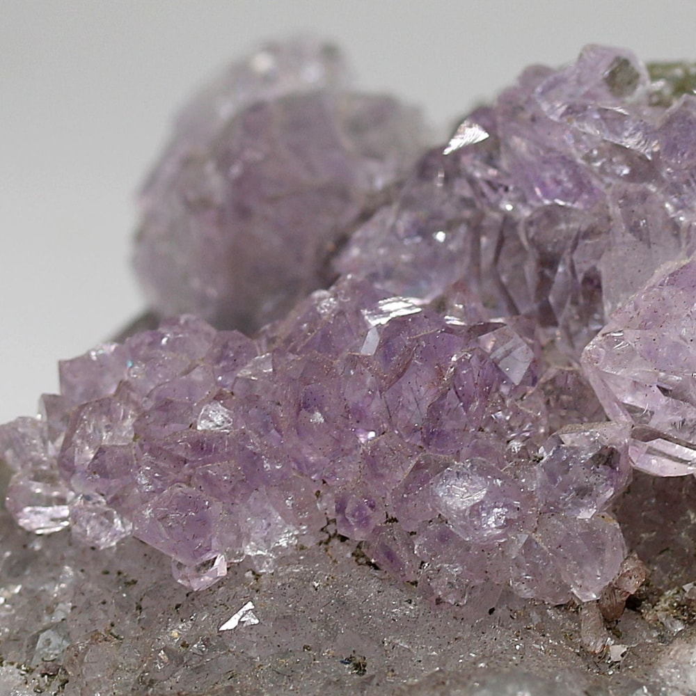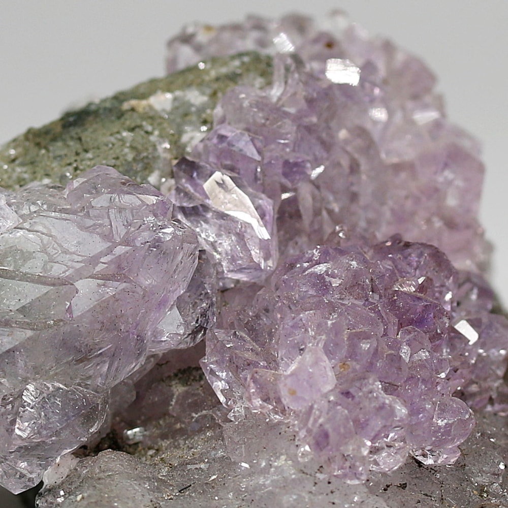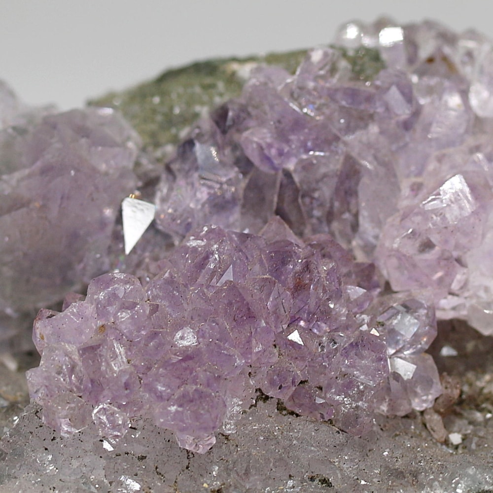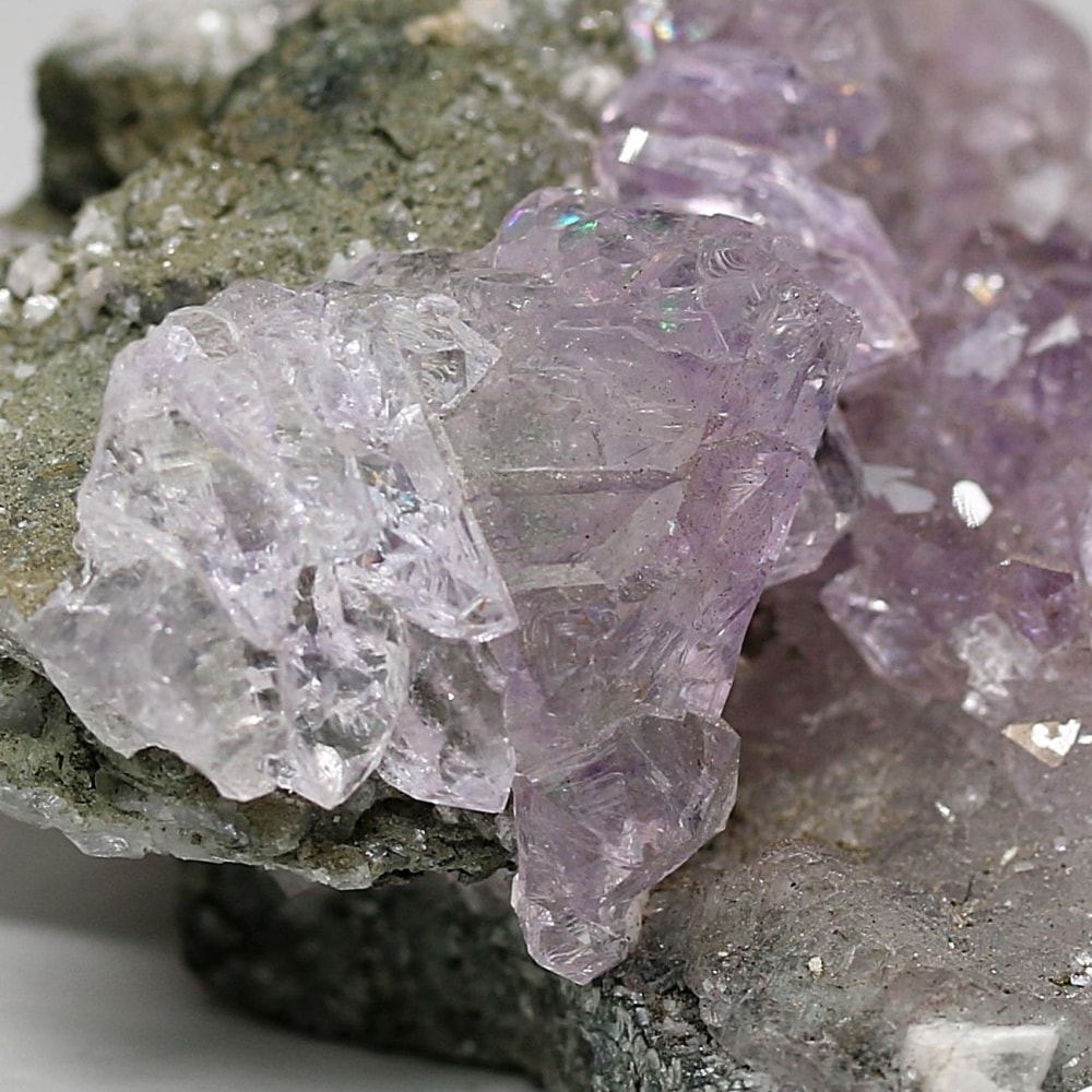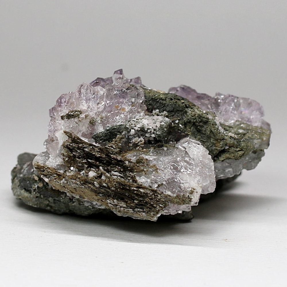 さらに、こちらのクラスターにはマイカの薄片が見られ、光の角度によって独特の反射を見せるとともに、レピドクロサイトのインクルージョンによる赤みを帯びた斑点状の模様が、結晶に異質な地層感と鉱物の奥深さを感じさせる表情を添えています。