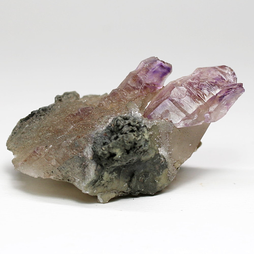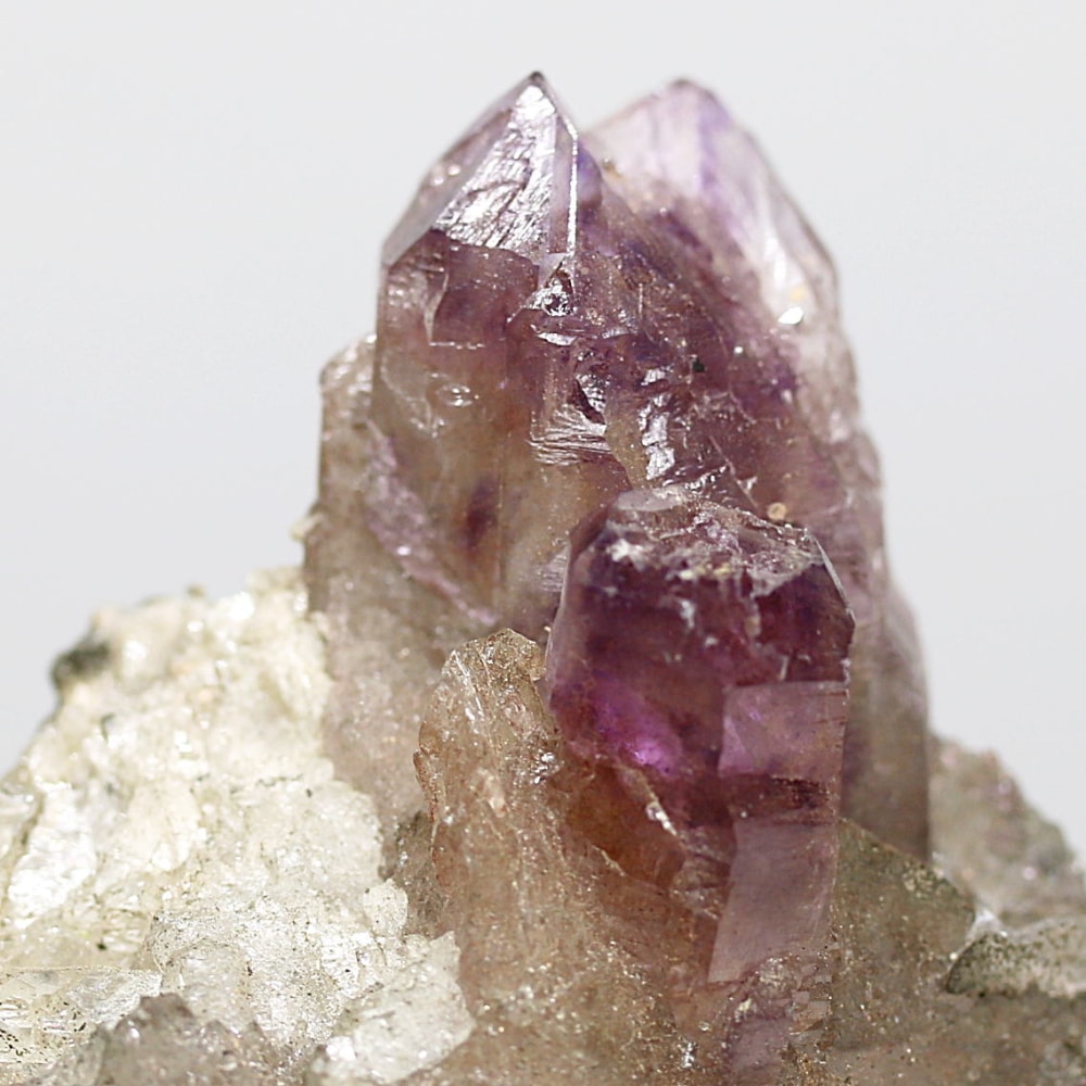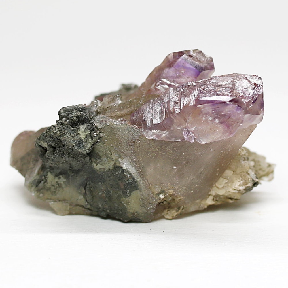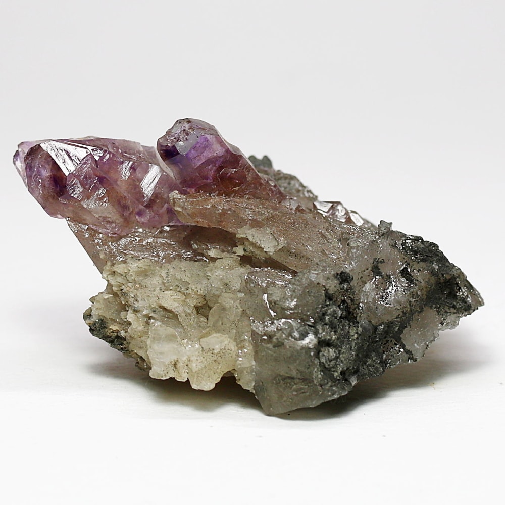 さらに、こちらのクラスターではクォーツが母岩となり、その上にアメジストが形成されています。アメジストエレスチャル特有の複雑な結晶構造に抜け感をもたらし、結晶美に奥行きある表情を添えています。