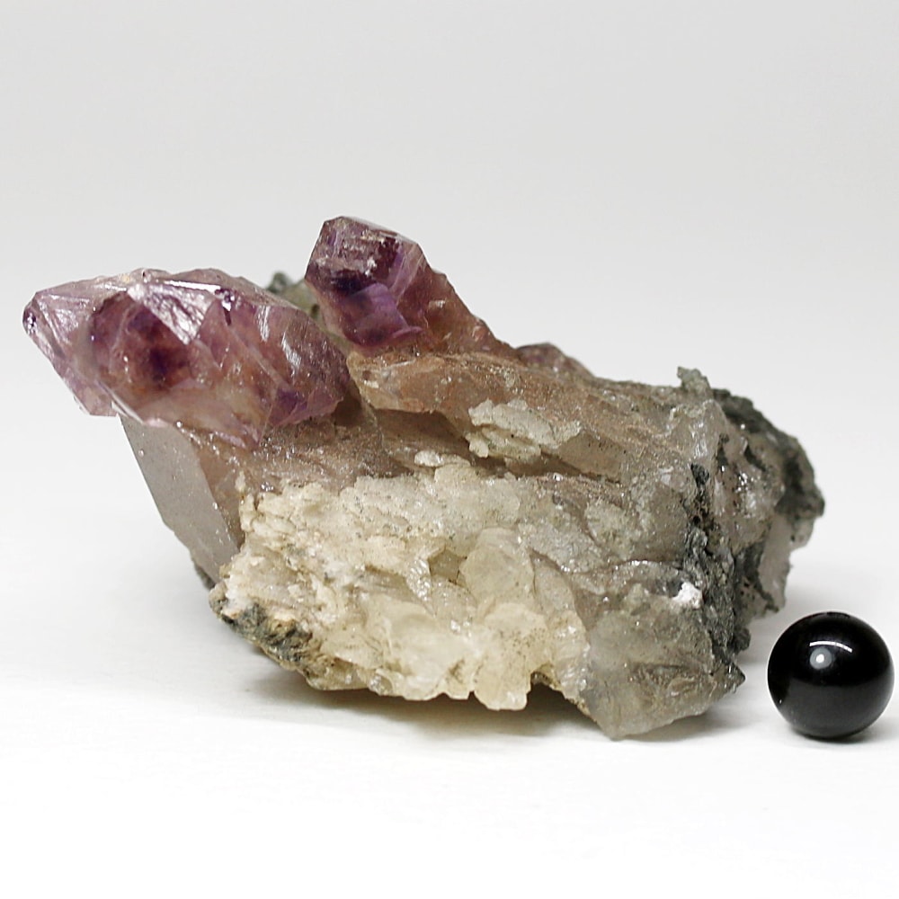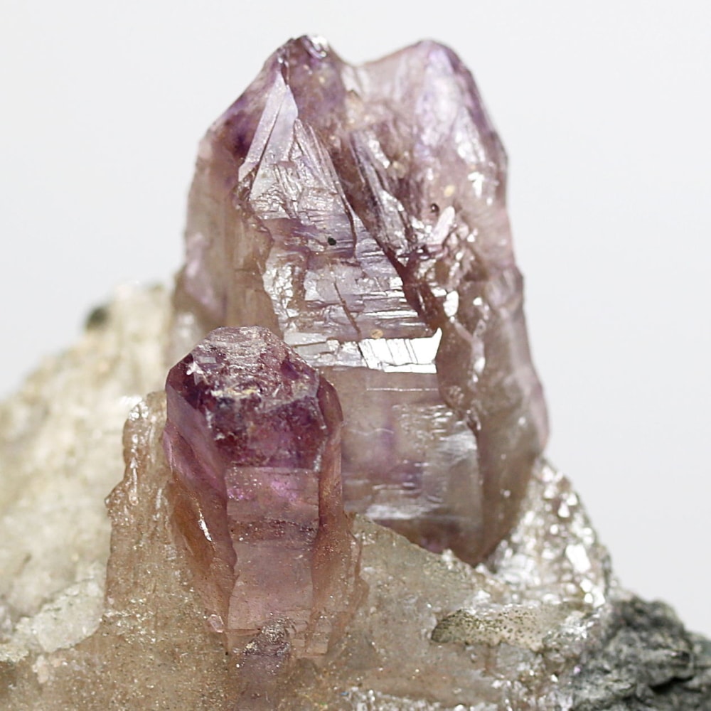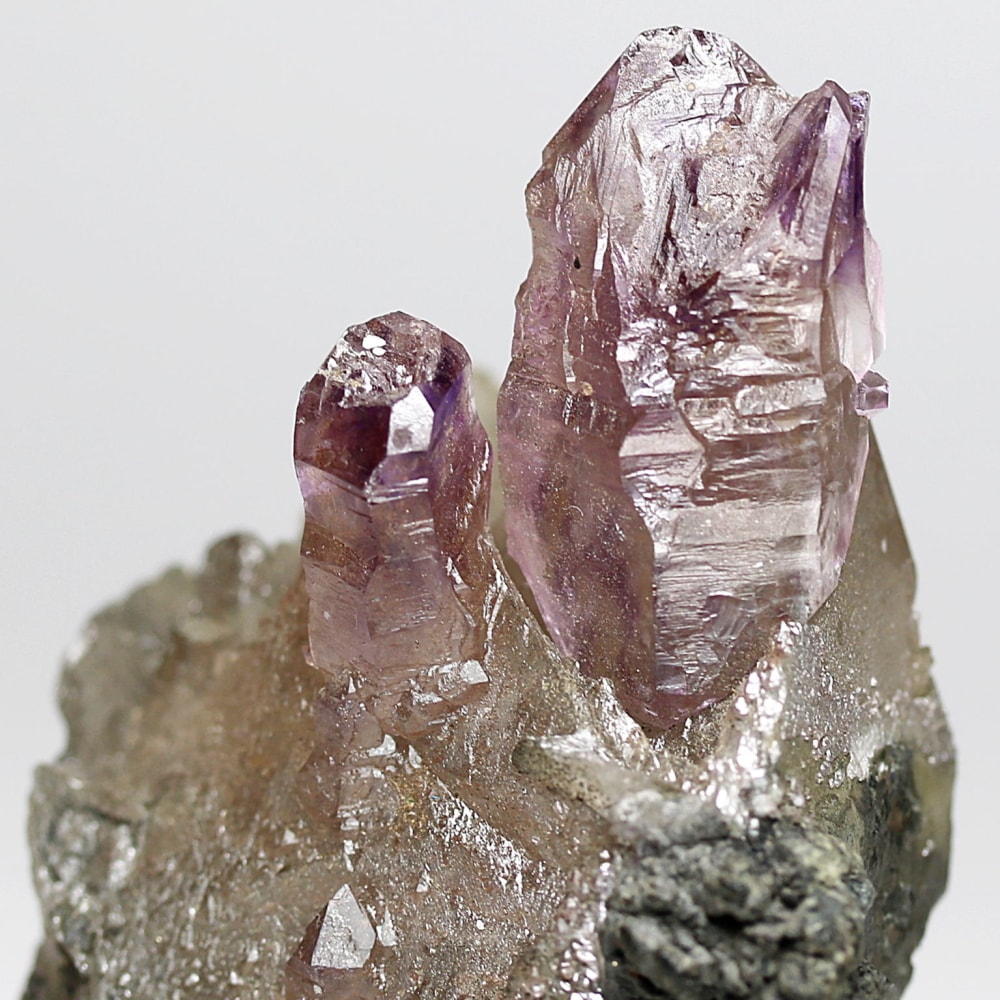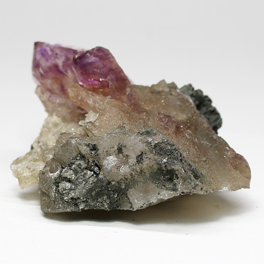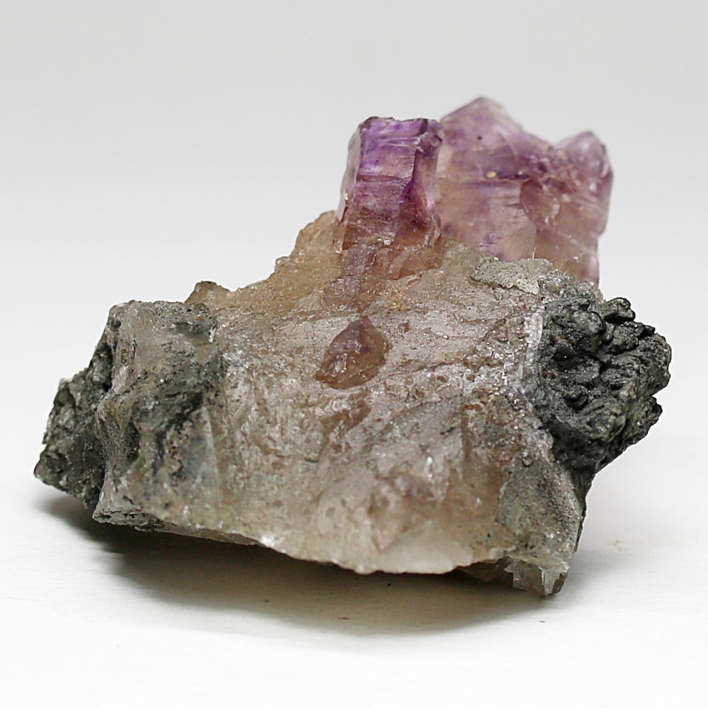 さらに、こちらのクラスターではクォーツが母岩となり、その上にアメジストが形成されています。アメジストエレスチャル特有の複雑な結晶構造に抜け感をもたらし、結晶美に奥行きある表情を添えています。