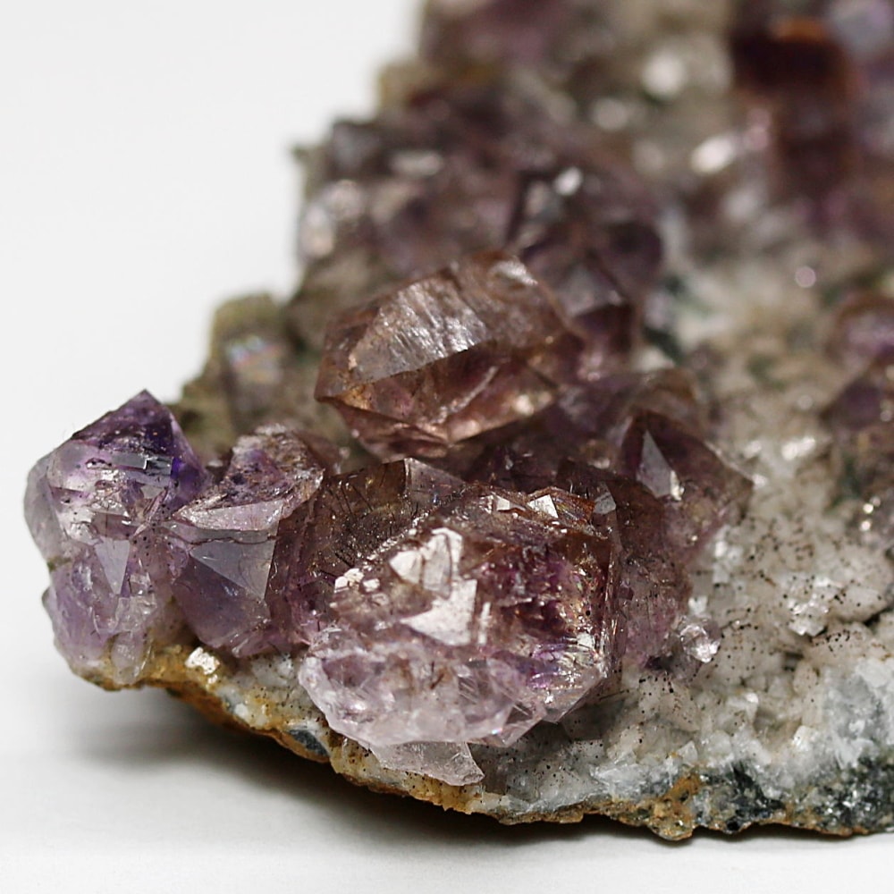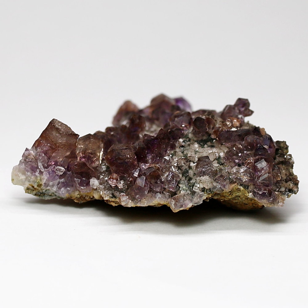カルール産アメジストエレスチャルは、紫水晶としての気品ある色調と、荒々しくも情報量の多い結晶構造が共存する点が大きな魅力です。整った美しさではなく、地中での激しい環境変化をそのまま刻み込んだかのような造形は、ひとつとして同じ姿を持たず、まさに自然が生み出した一点物の鉱物標本と云えるでしょう。