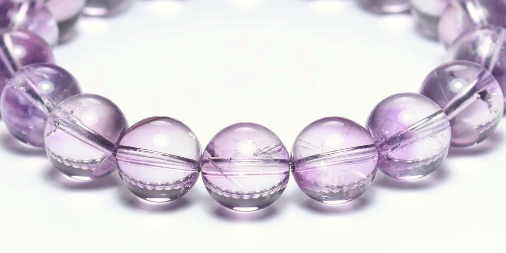 水晶の中にアメジストのファントムが見られる大変珍しいタイプのブレスレットでございます。