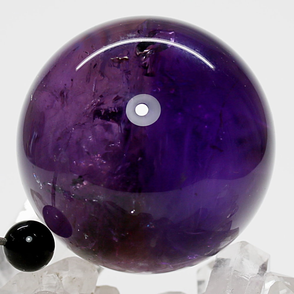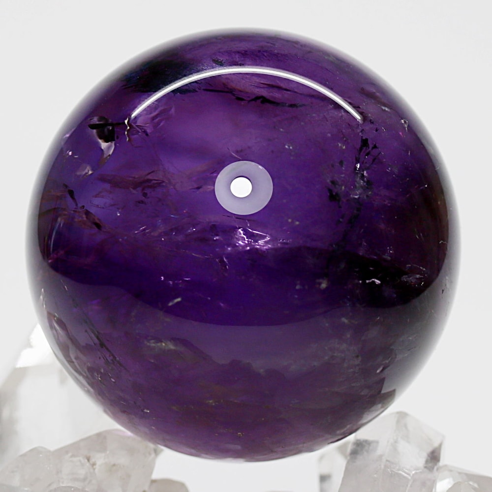 また、アメジストは癒しの水晶と云われており、紫色が持つ不安を和らげる心理的作用に加え、スピリチュアルな分野では「青」の浄化性と「赤」の陽エネルギーを併せ持つ石と伝えられています。深みある紫色の丸玉からは、そうしたアメジストならではの魅力を存分に感じていただけることでしょう。