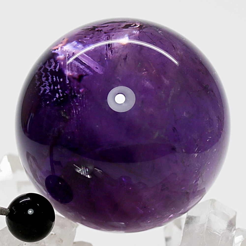 また、アメジストは癒しの水晶と云われており、紫色が持つ不安を和らげる心理的作用に加え、スピリチュアルな分野では「青」の浄化性と「赤」の陽エネルギーを併せ持つ石と伝えられています。深みある紫色の丸玉からは、そうしたアメジストならではの魅力を存分に感じていただけることでしょう。