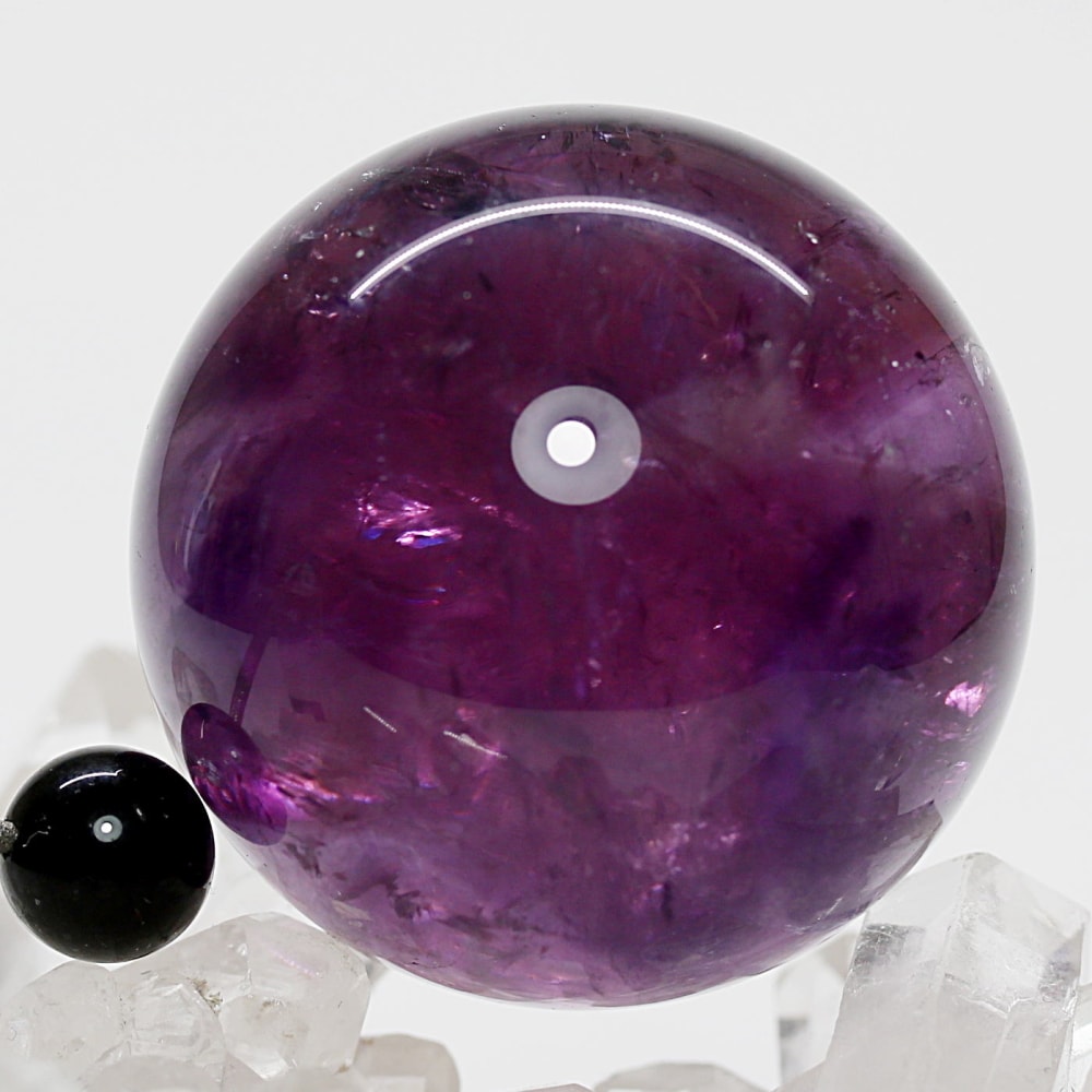 また、アメジストは癒しの水晶と云われており、紫色が持つ不安を和らげる心理的作用に加え、スピリチュアルな分野では「青」の浄化性と「赤」の陽エネルギーを併せ持つ石と伝えられています。深みある紫色の丸玉からは、そうしたアメジストならではの魅力を存分に感じていただけることでしょう。