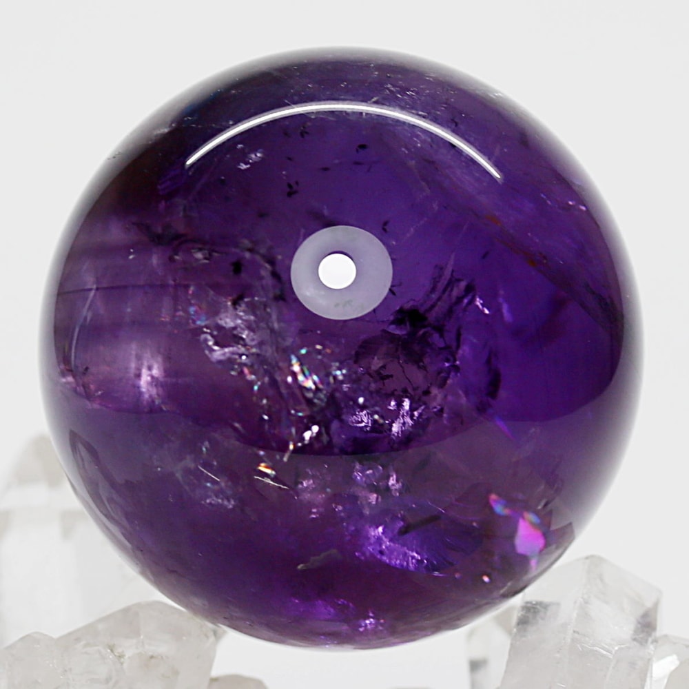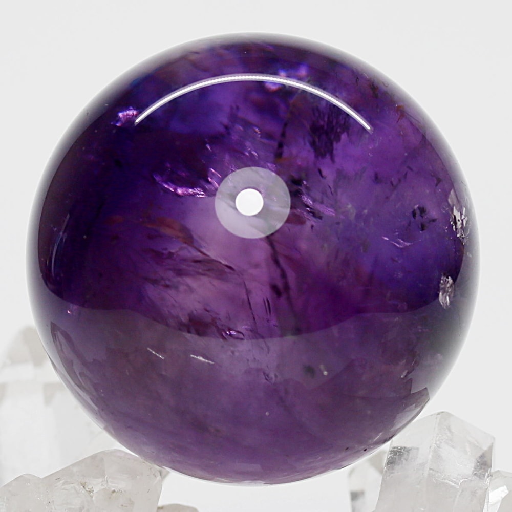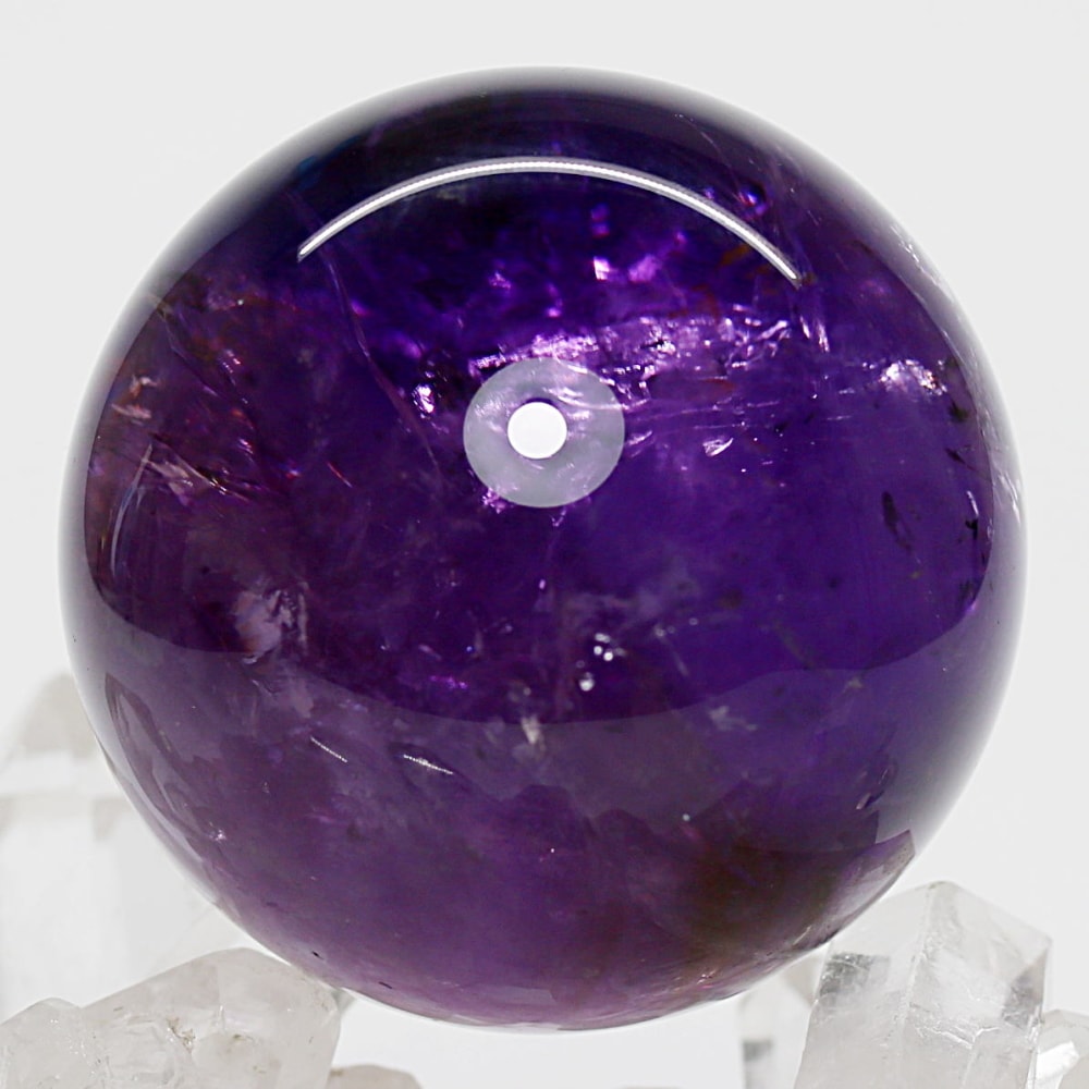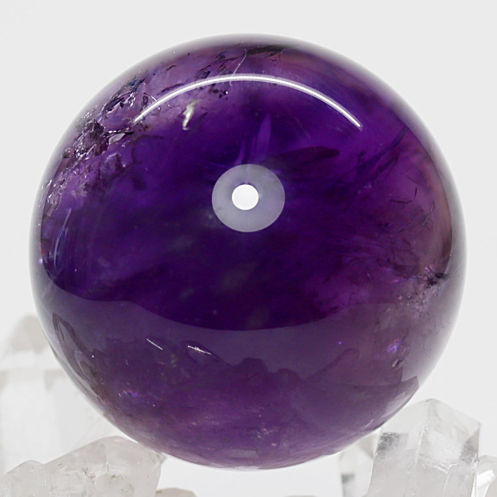 また、アメジストは癒しの水晶と云われており、紫色が持つ不安を和らげる心理的作用に加え、スピリチュアルな分野では「青」の浄化性と「赤」の陽エネルギーを併せ持つ石と伝えられています。深みある紫色の丸玉からは、そうしたアメジストならではの魅力を存分に感じていただけることでしょう。