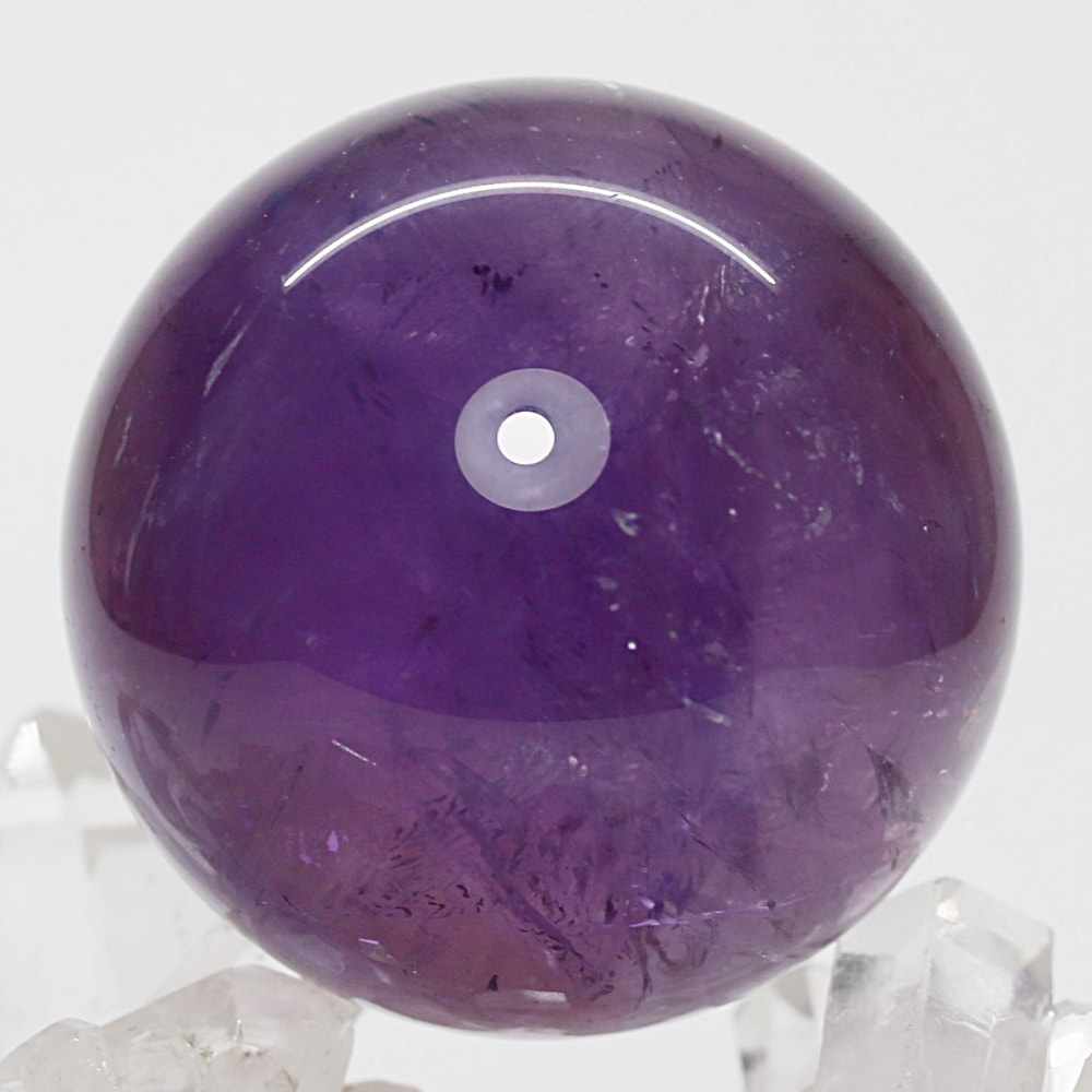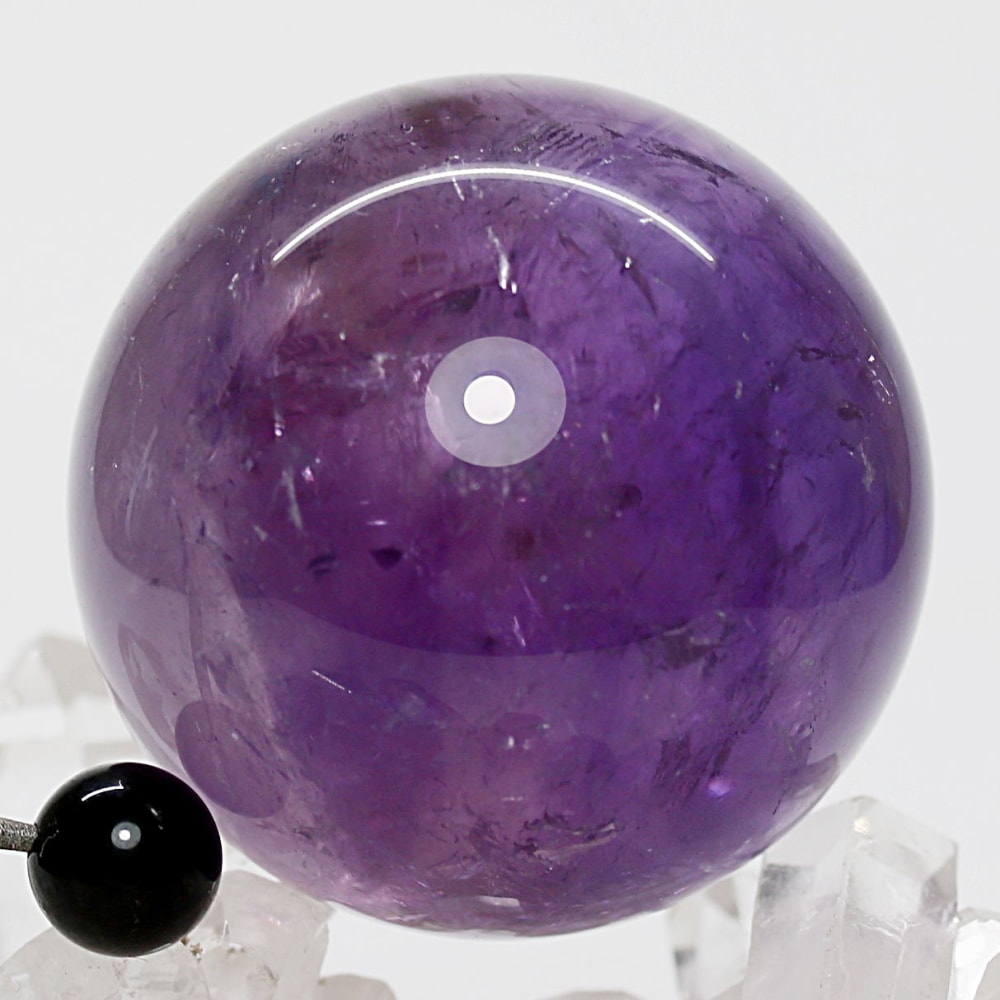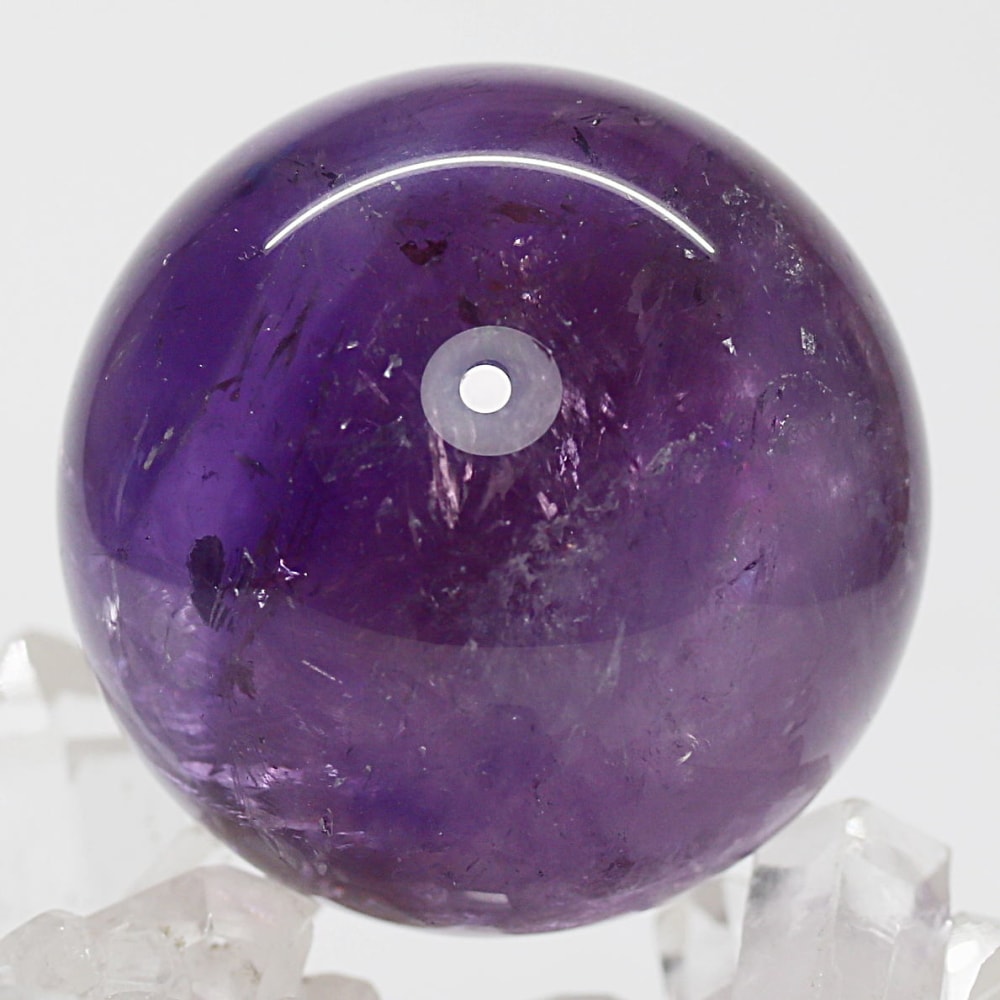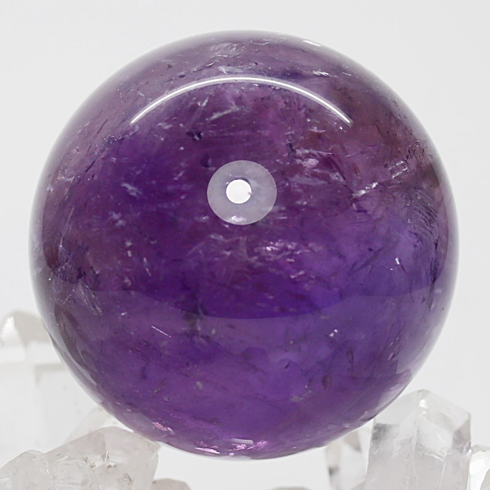 また、アメジストは癒しの水晶と云われており、紫色が持つ不安を和らげる心理的作用に加え、スピリチュアルな分野では「青」の浄化性と「赤」の陽エネルギーを併せ持つ石と伝えられています。深みある紫色の丸玉からは、そうしたアメジストならではの魅力を存分に感じていただけることでしょう。