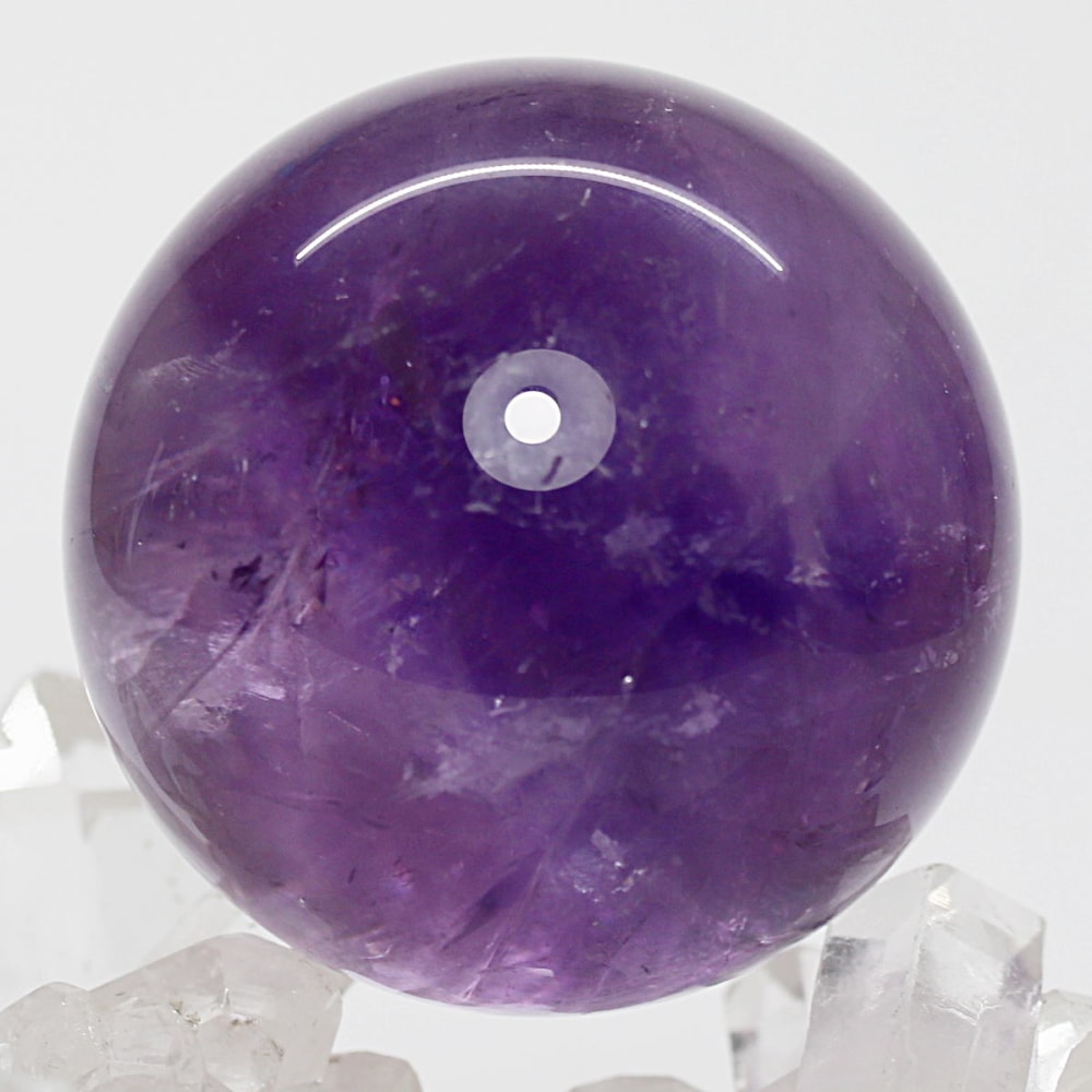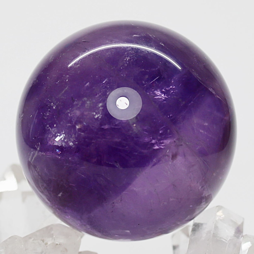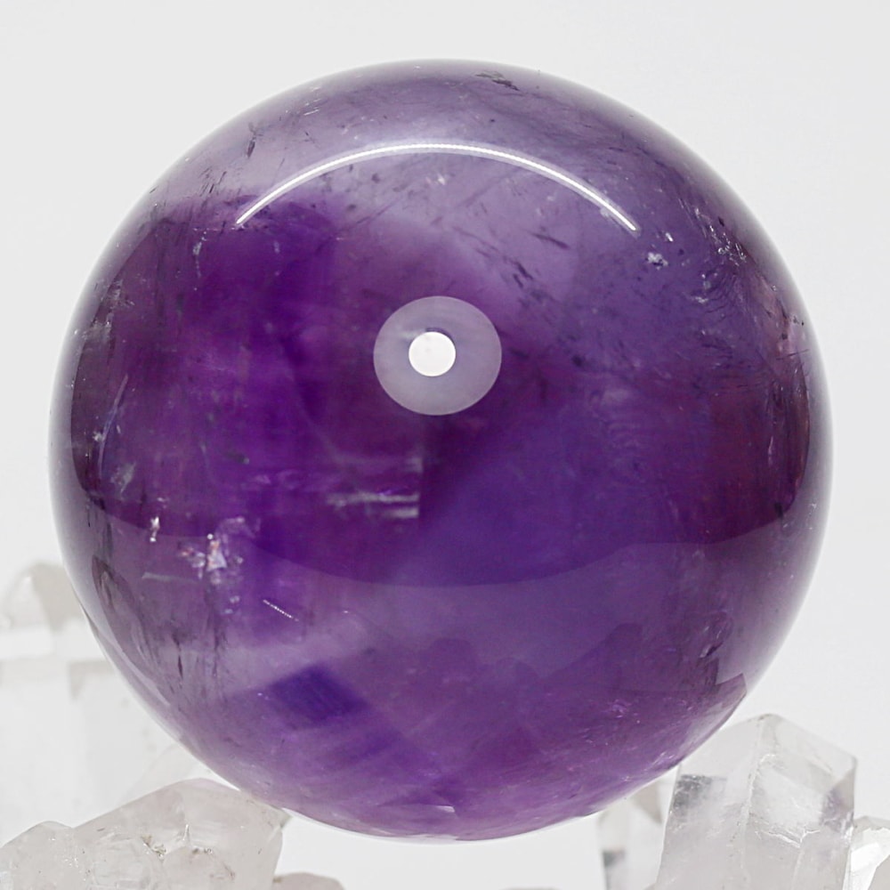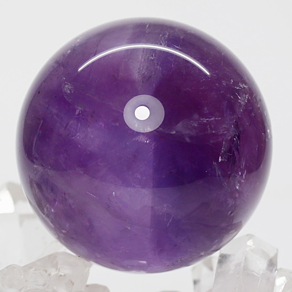 また、アメジストは癒しの水晶と云われており、紫色が持つ不安を和らげる心理的作用に加え、スピリチュアルな分野では「青」の浄化性と「赤」の陽エネルギーを併せ持つ石と伝えられています。深みある紫色の丸玉からは、そうしたアメジストならではの魅力を存分に感じていただけることでしょう。