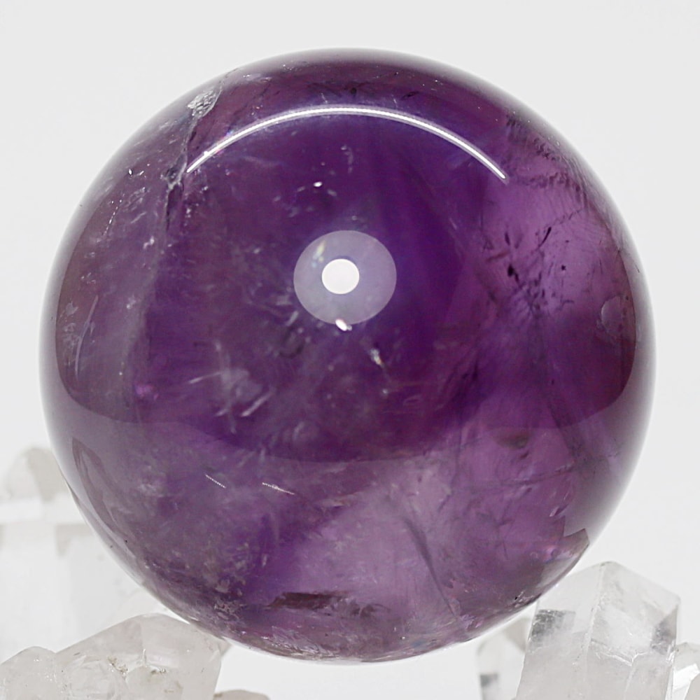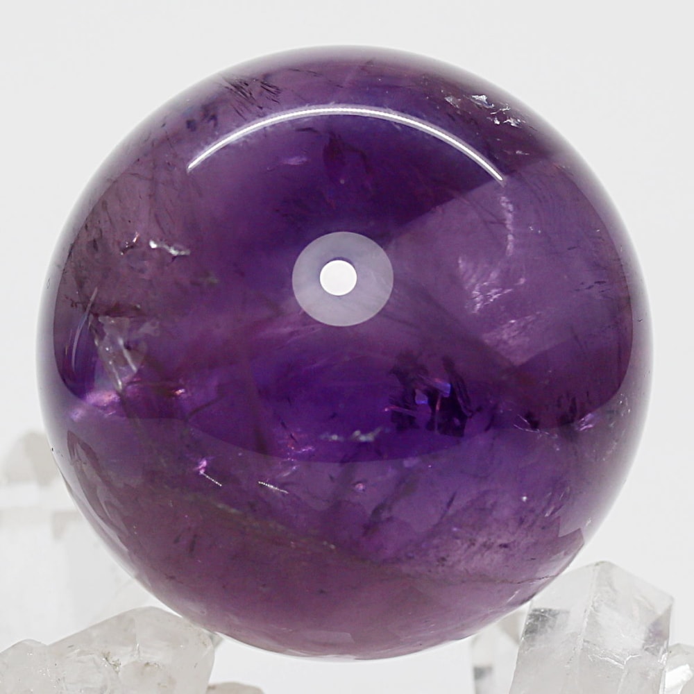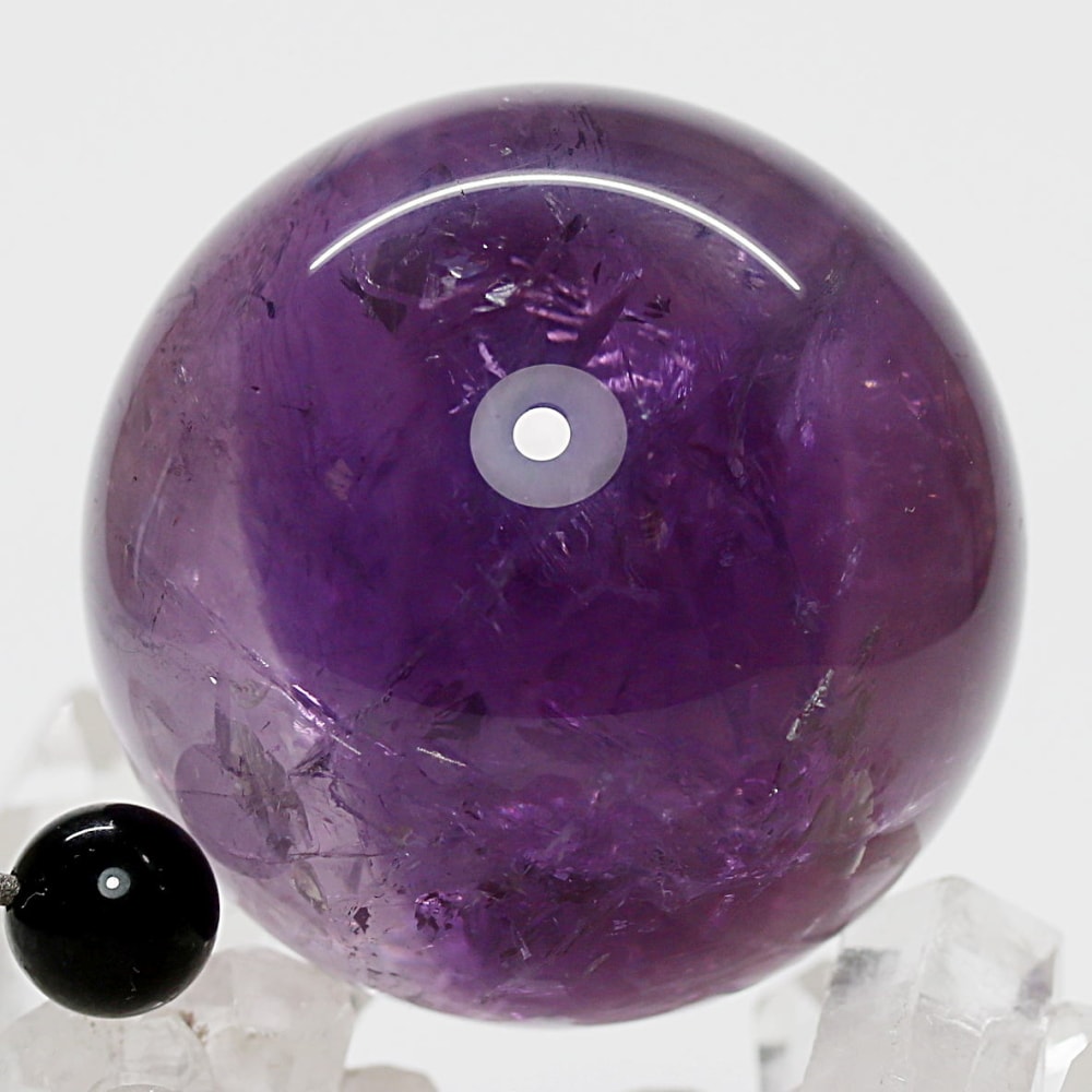 また、アメジストは癒しの水晶と云われており、紫色が持つ不安を和らげる心理的作用に加え、スピリチュアルな分野では「青」の浄化性と「赤」の陽エネルギーを併せ持つ石と伝えられています。深みある紫色の丸玉からは、そうしたアメジストならではの魅力を存分に感じていただけることでしょう。