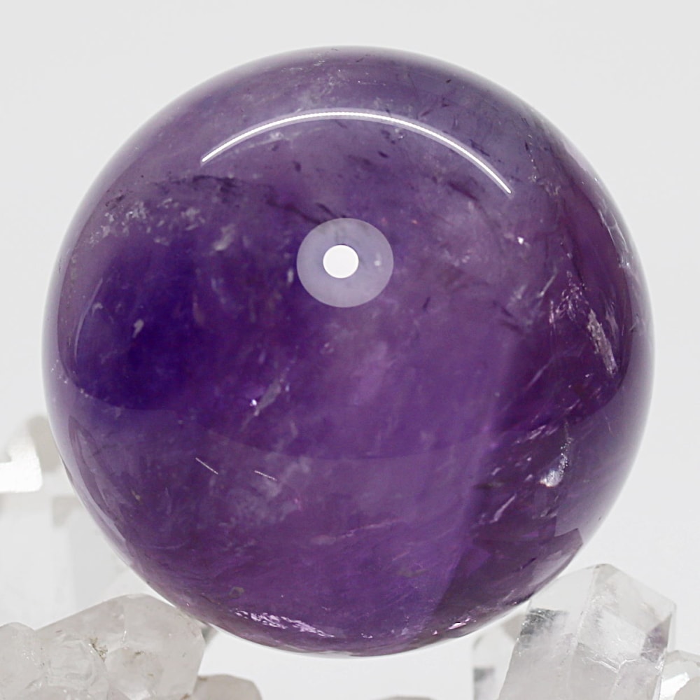 また、アメジストは癒しの水晶と云われており、紫色が持つ不安を和らげる心理的作用に加え、スピリチュアルな分野では「青」の浄化性と「赤」の陽エネルギーを併せ持つ石と伝えられています。深みある紫色の丸玉からは、そうしたアメジストならではの魅力を存分に感じていただけることでしょう。