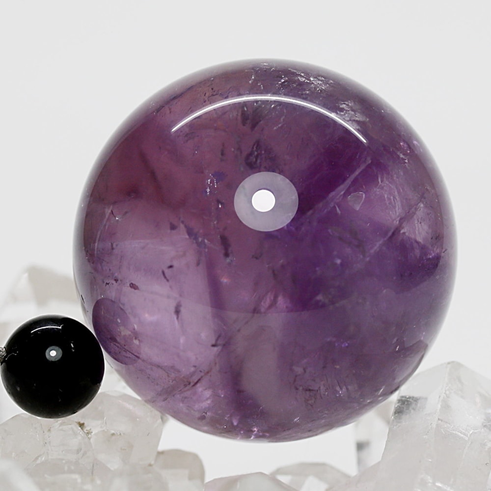 また、アメジストは癒しの水晶と云われており、紫色が持つ不安を和らげる心理的作用に加え、スピリチュアルな分野では「青」の浄化性と「赤」の陽エネルギーを併せ持つ石と伝えられています。深みある紫色の丸玉からは、そうしたアメジストならではの魅力を存分に感じていただけることでしょう。