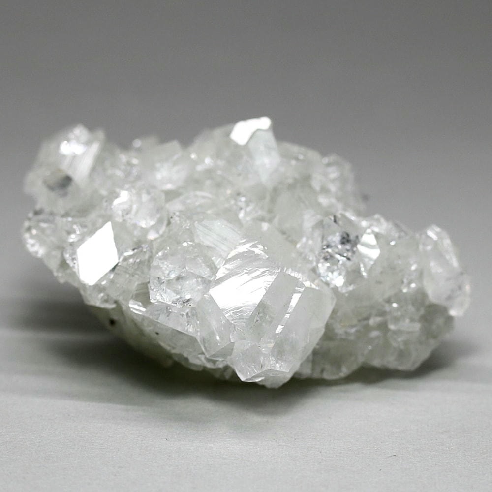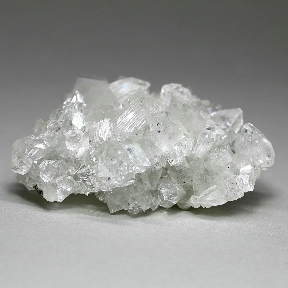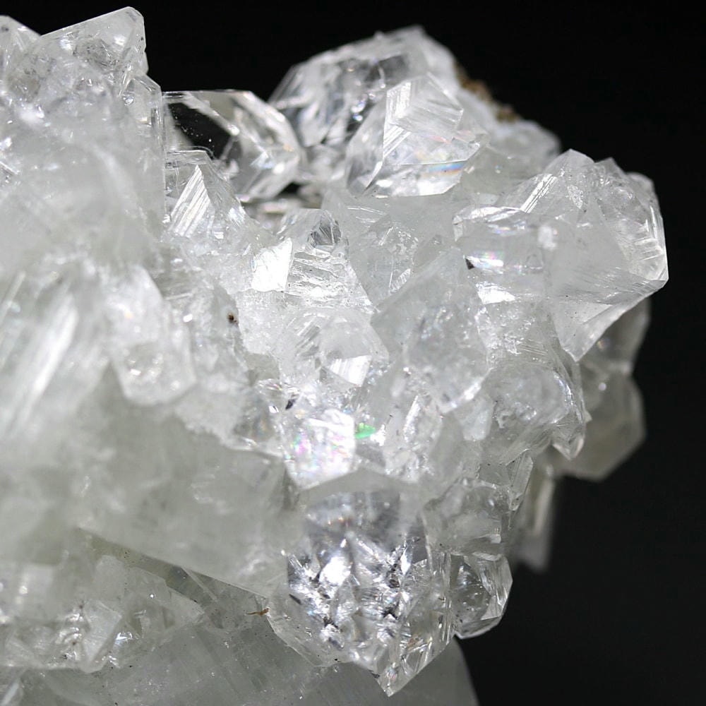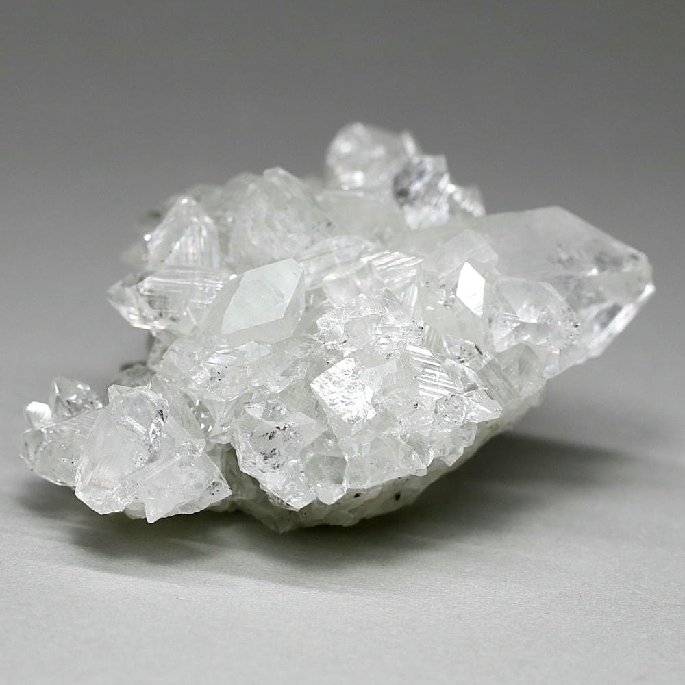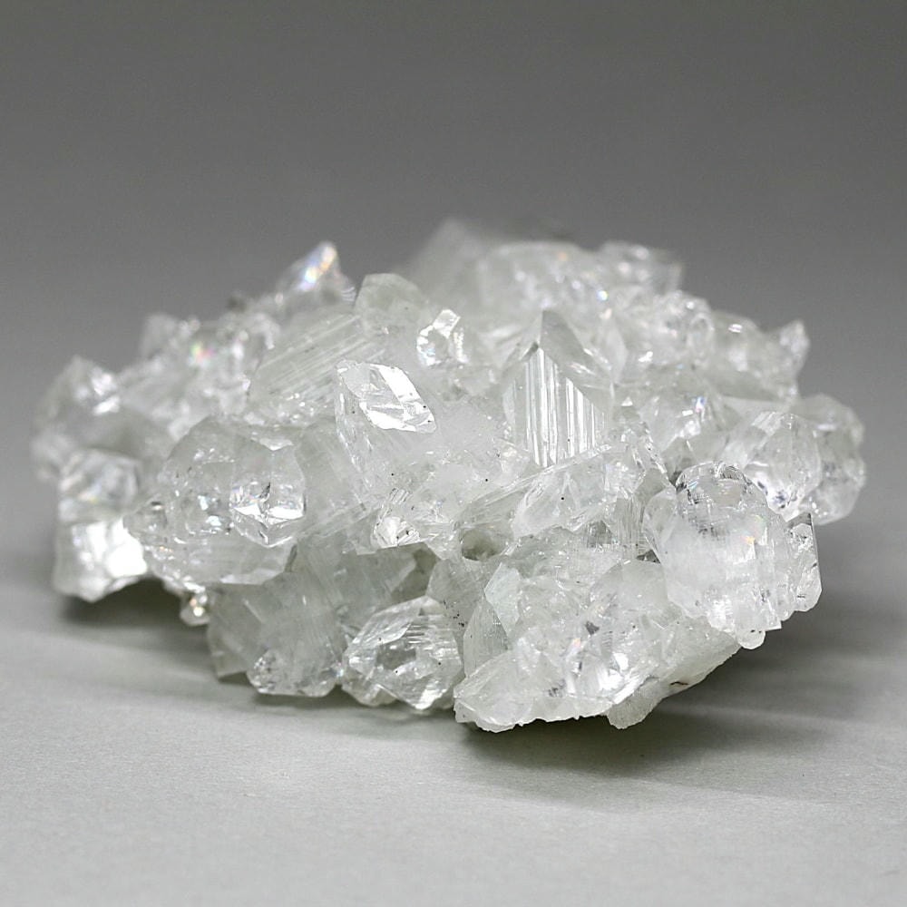 水晶が六角形(六方晶系)の結晶であるのに対し、アポフィライトは正方形(正方晶系)の結晶を成すのが特徴です。キューブ状の結晶が鏡面のように輝き、他の結晶とは一線を画す魅力をお楽しみいただけます。