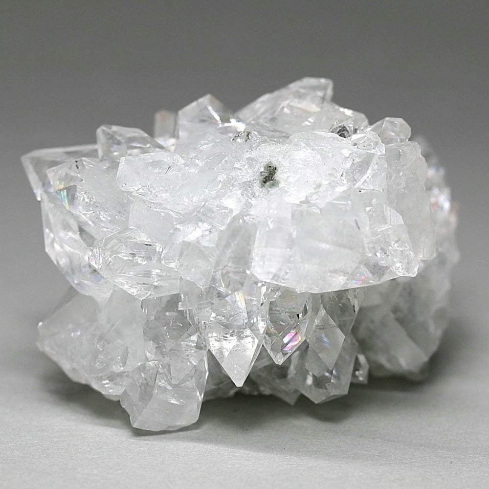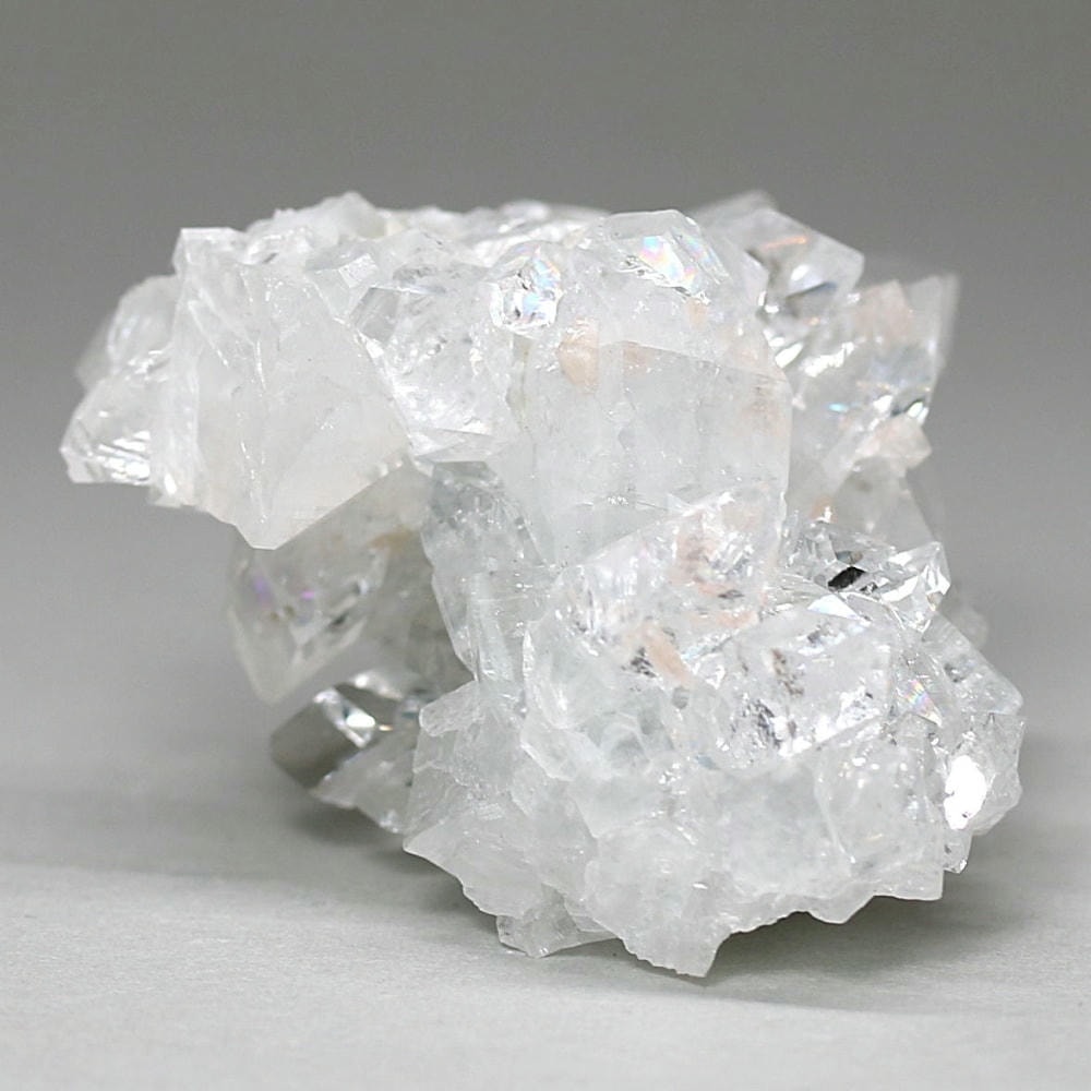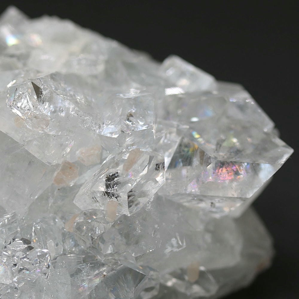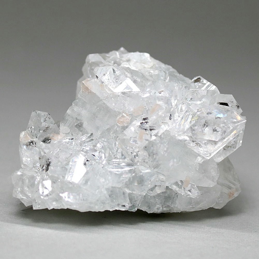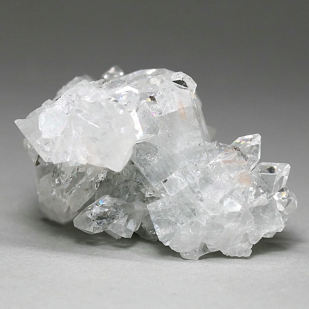 水晶が六角形(六方晶系)の結晶であるのに対し、アポフィライトは正方形(正方晶系)の結晶を成すのが特徴です。キューブ状の結晶が鏡面のように輝き、他の結晶とは一線を画す魅力をお楽しみいただけます。