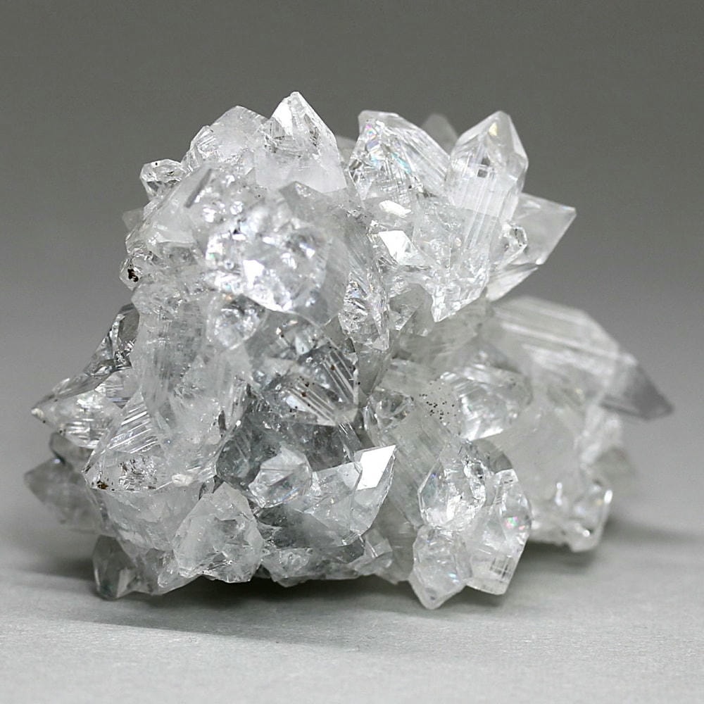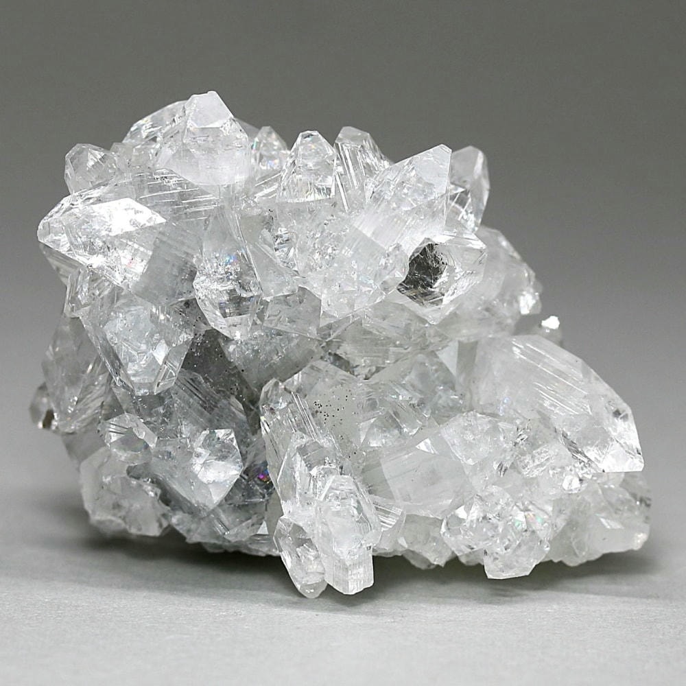 水晶が六角形(六方晶系)の結晶であるのに対し、アポフィライトは正方形(正方晶系)の結晶を成すのが特徴です。キューブ状の結晶が鏡面のように輝き、他の結晶とは一線を画す魅力をお楽しみいただけます。