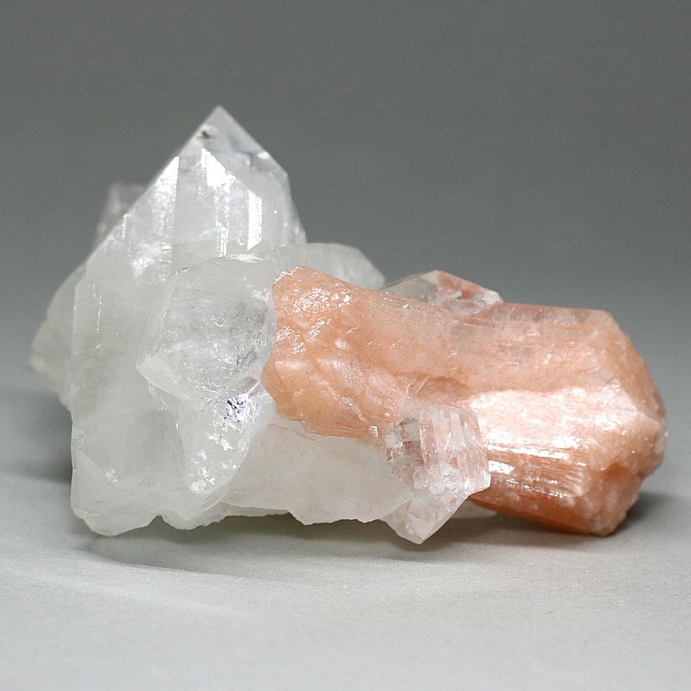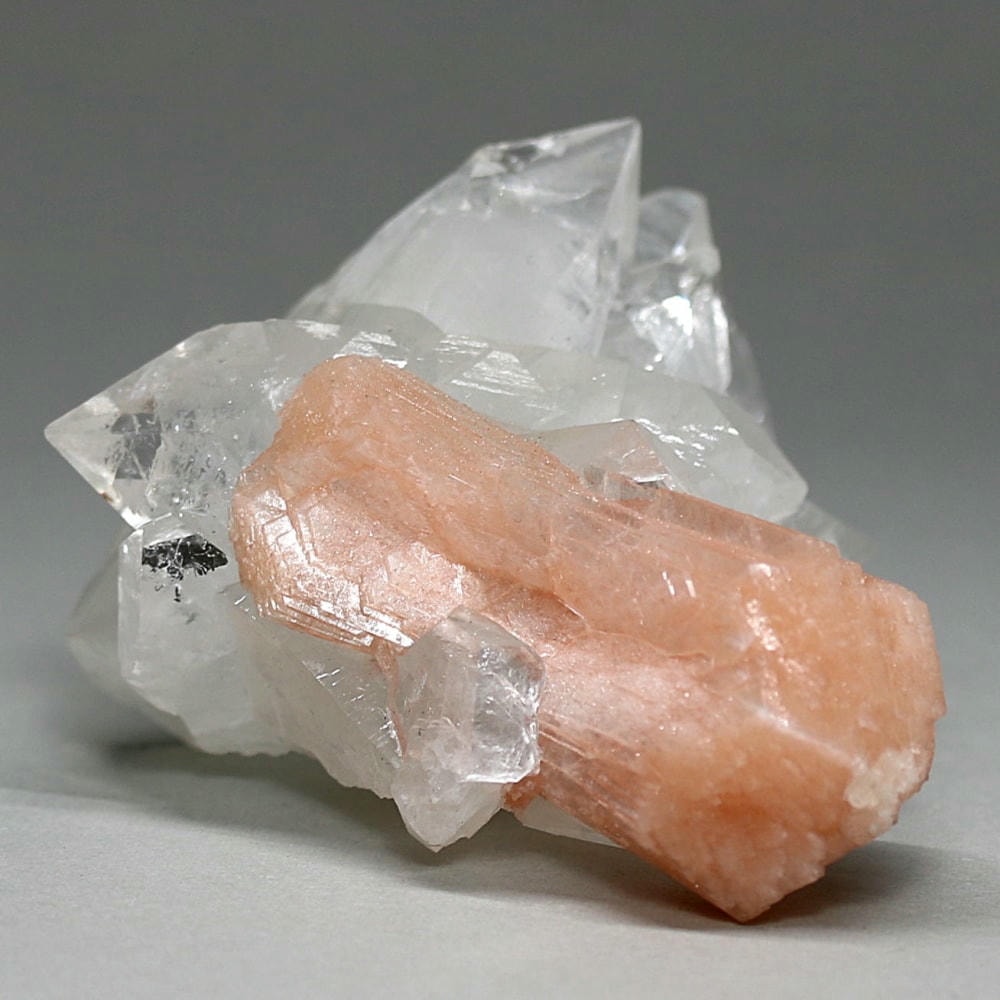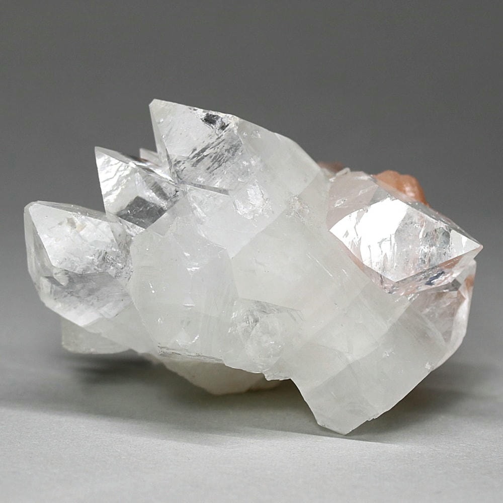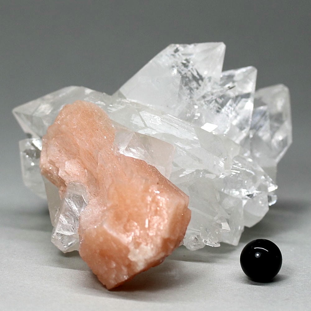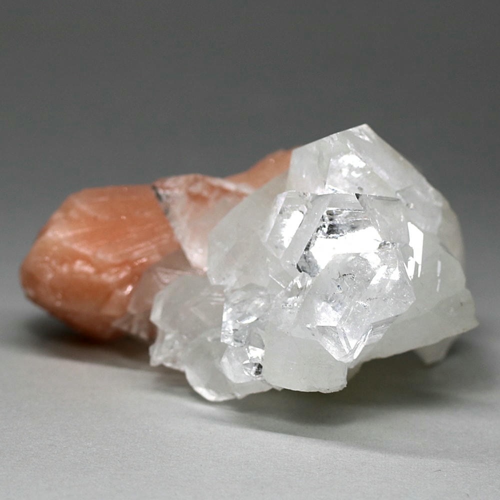 まるで透明度の高い水晶のように澄み切った結晶が、光を受けてひと際きらめく “ワンランク上のアポフィライトクラスター” をご用意。共生するコーラルカラーの大きなスティルバイトも秀逸です☆