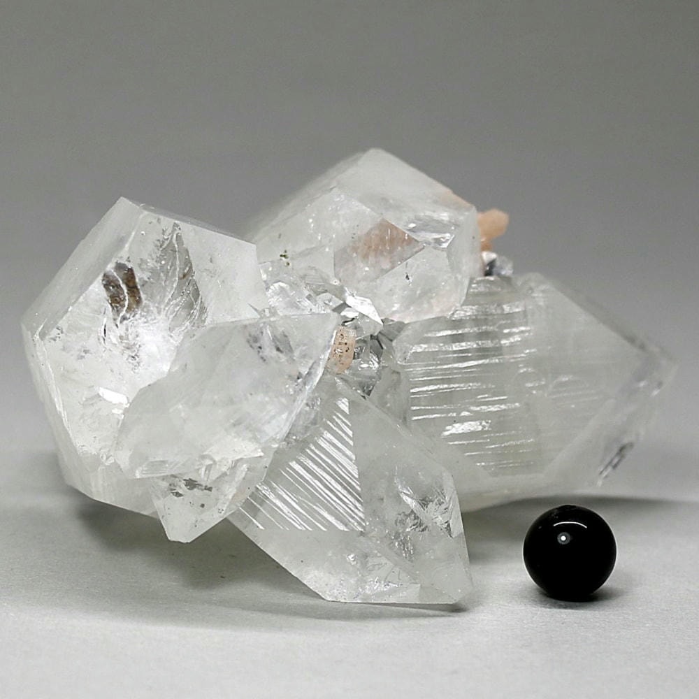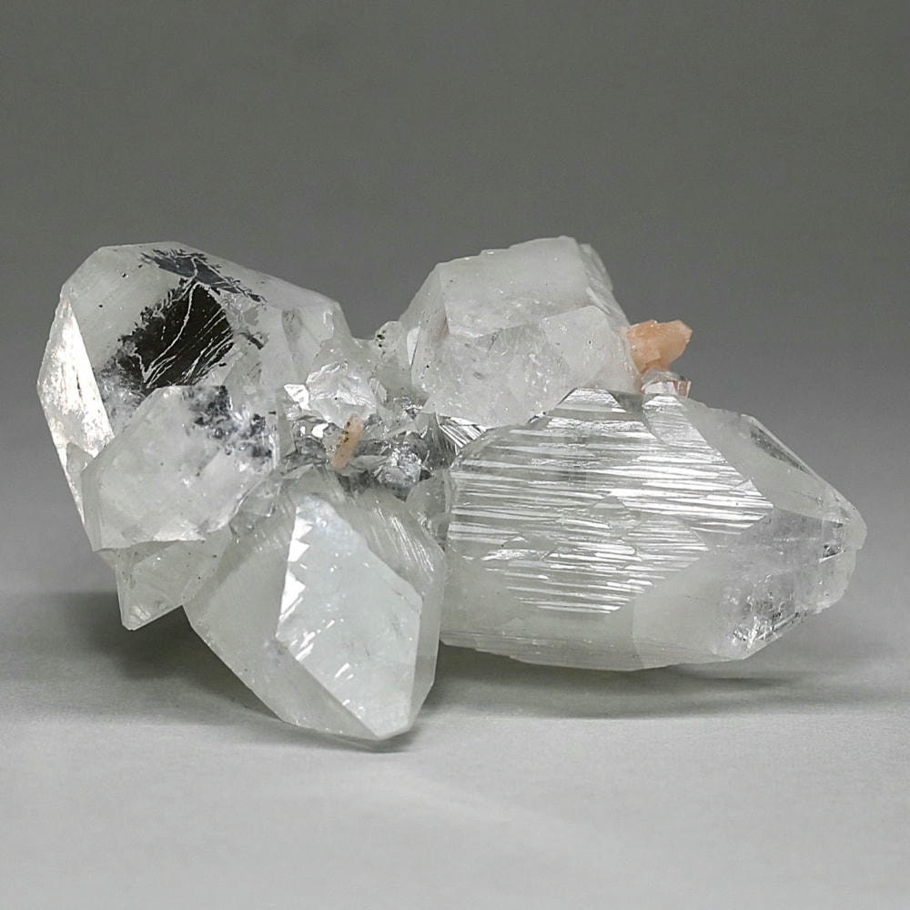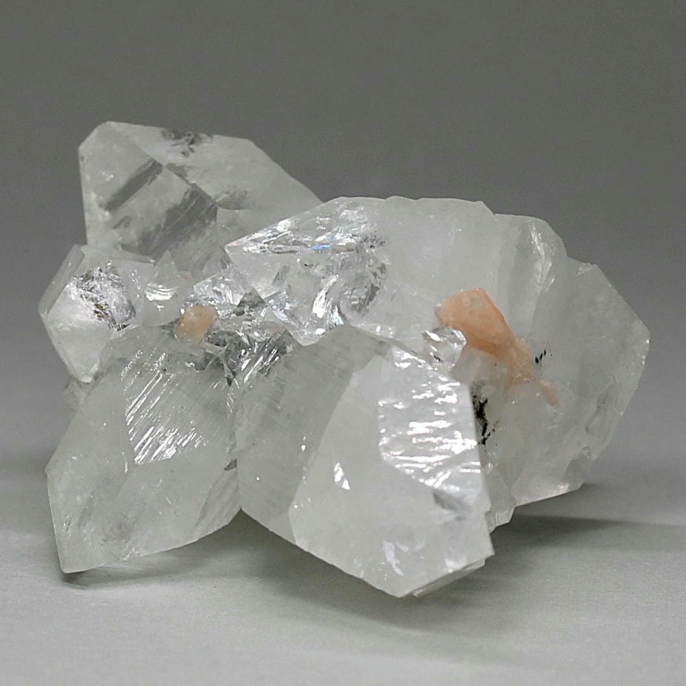 まるで透明度の高い水晶のように澄み切った結晶が、光を受けてひと際きらめく “ワンランク上のアポフィライトクラスター” をご用意。共生するコーラルカラーのスティルバイトも秀逸です☆