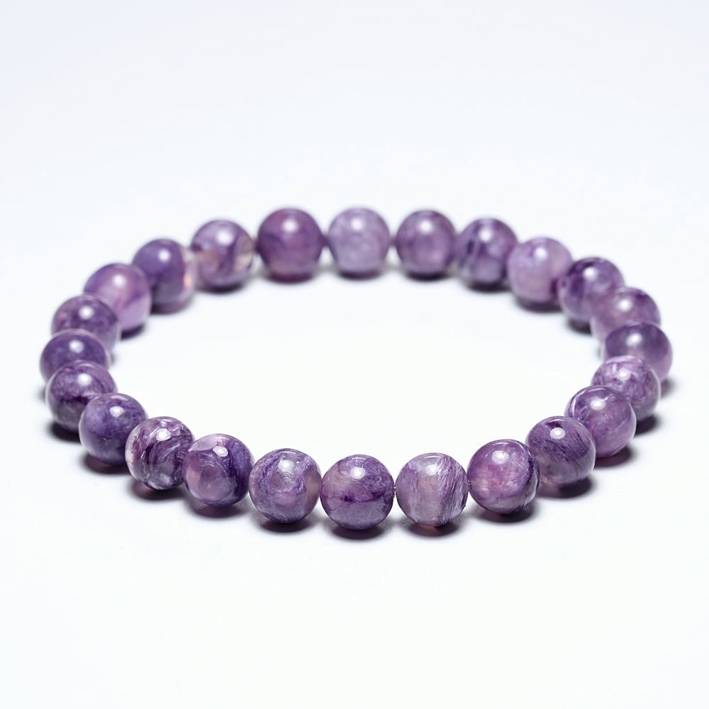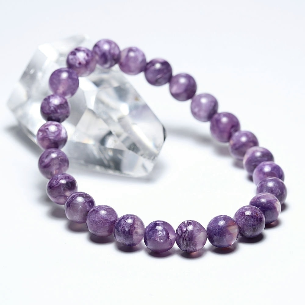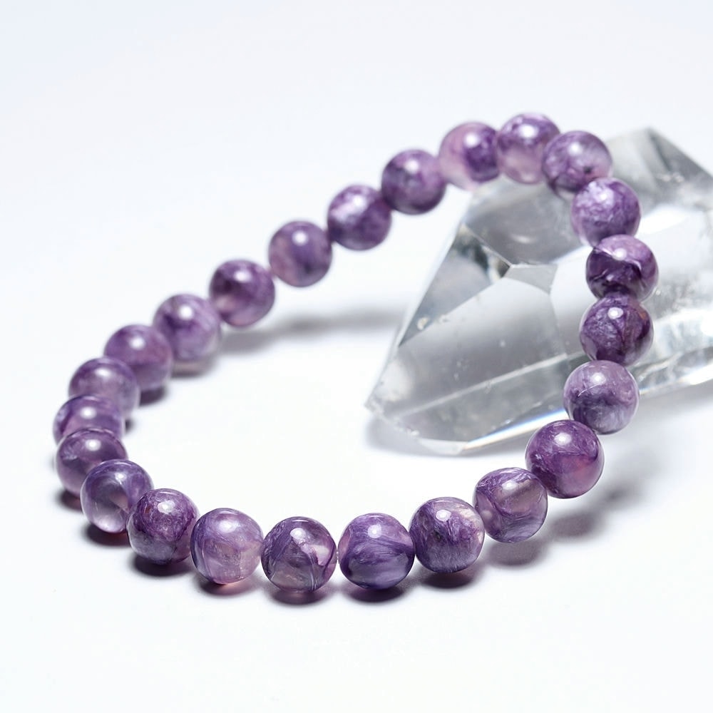 このように透明感と発色のバランスが整った良質なチャロアイトシリカは流通少なく貴重なグレードです。近年はチャロアイトブレスレットそのものが入手困難にあるため、お探しだった方にも自信をもっておすすめできる逸品といえるでしょう。