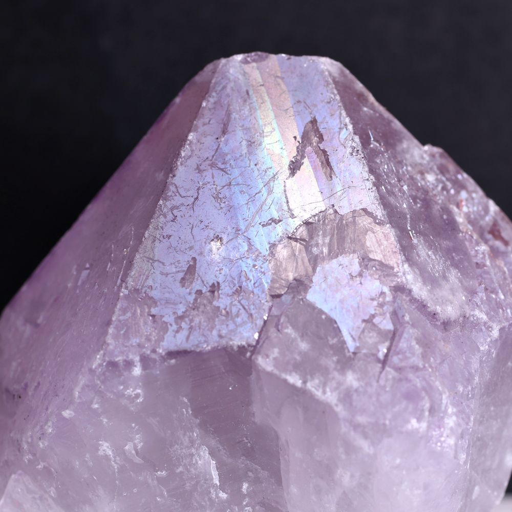 オーラアメジストとは、長い地質年代の中で、微量の金属元素(マグネシウムや鉄分など)が結晶表面の極薄層として定着し、光の干渉作用によって虹色の光沢(イリデッセンス)が現れた希少なアメジストです。