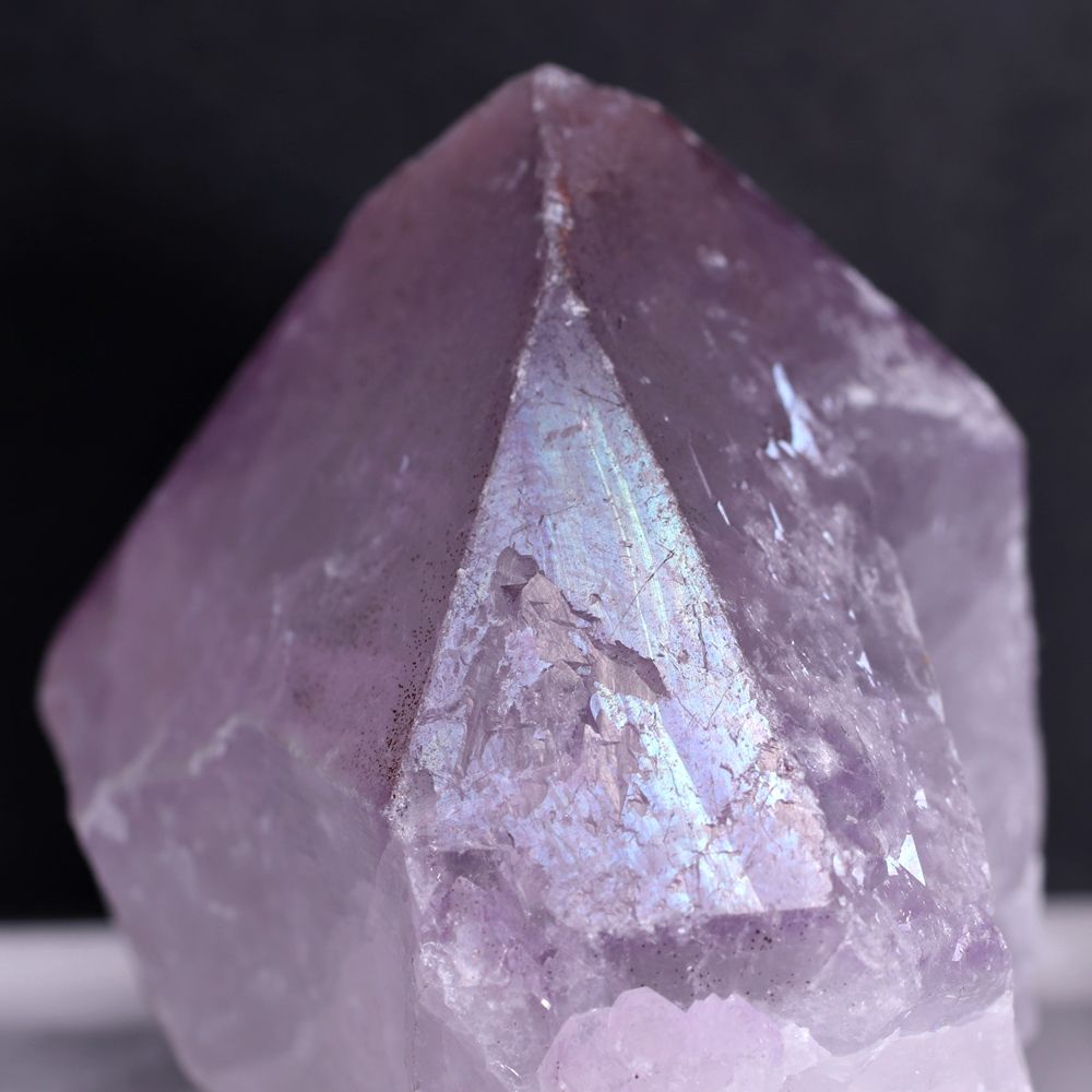 人工的な蒸着処理による「オーラ加工」とは異なり、自然環境下で生じた虹彩現象を示すアメジストは極めて限られ、とりわけ淡く優しいラベンダーパープルを呈するカルール産に現れる例は少なく、意図して入荷することが難しい“レア石”となっております。