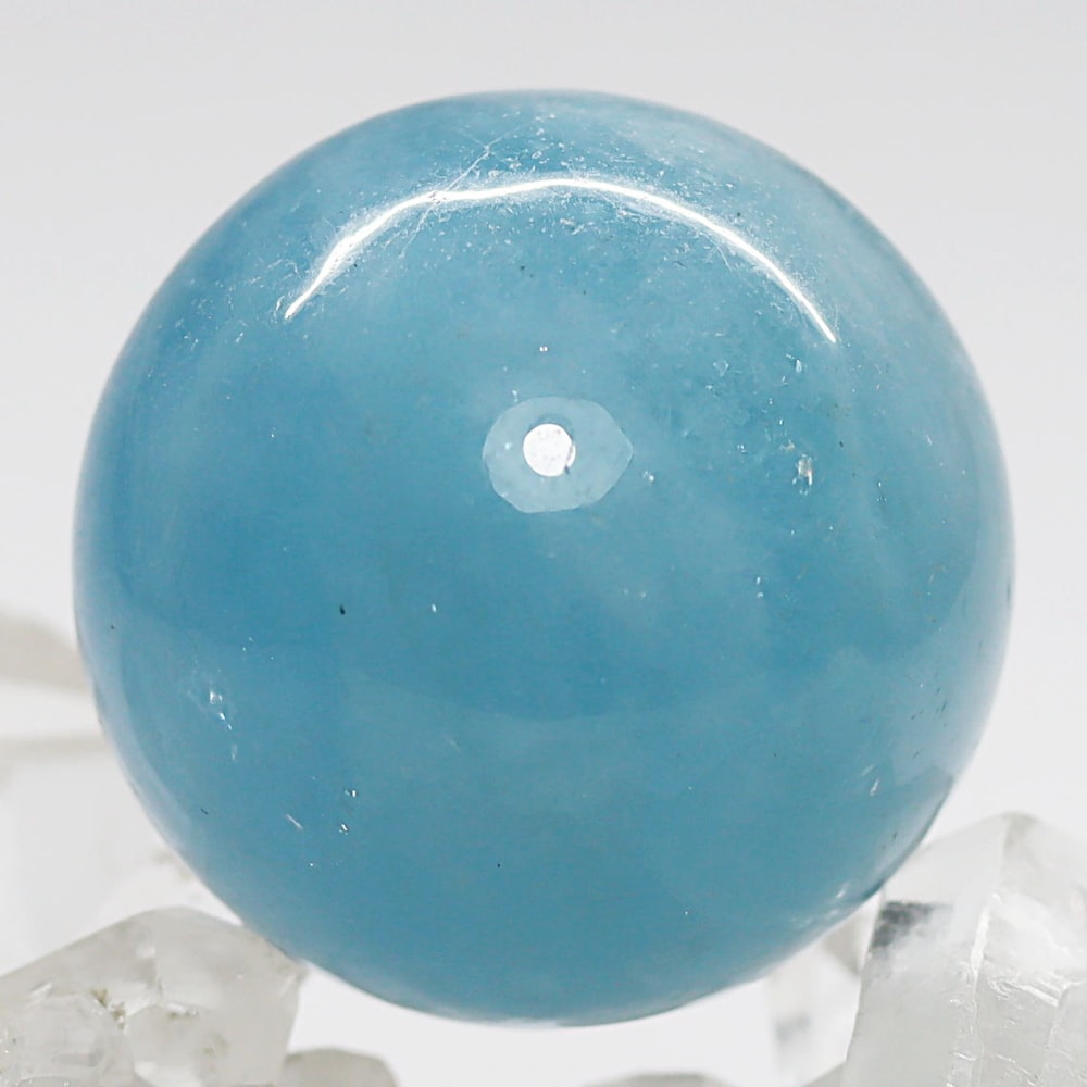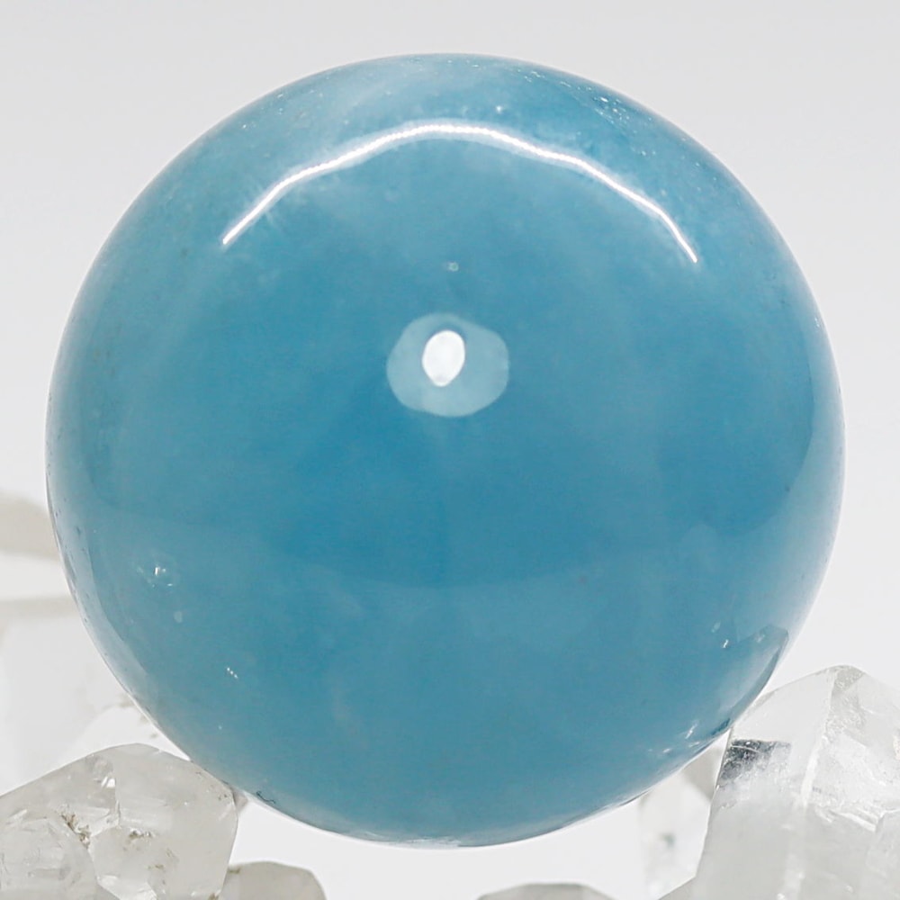 原石を多く必要とする丸玉はブレスレットに使われるアクアマリンビーズよりも品質低いものが多く出回りますが、ご覧のアクアマリン丸玉は “発色の良い鮮やかな青色が美しい高品質” です。