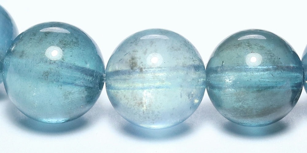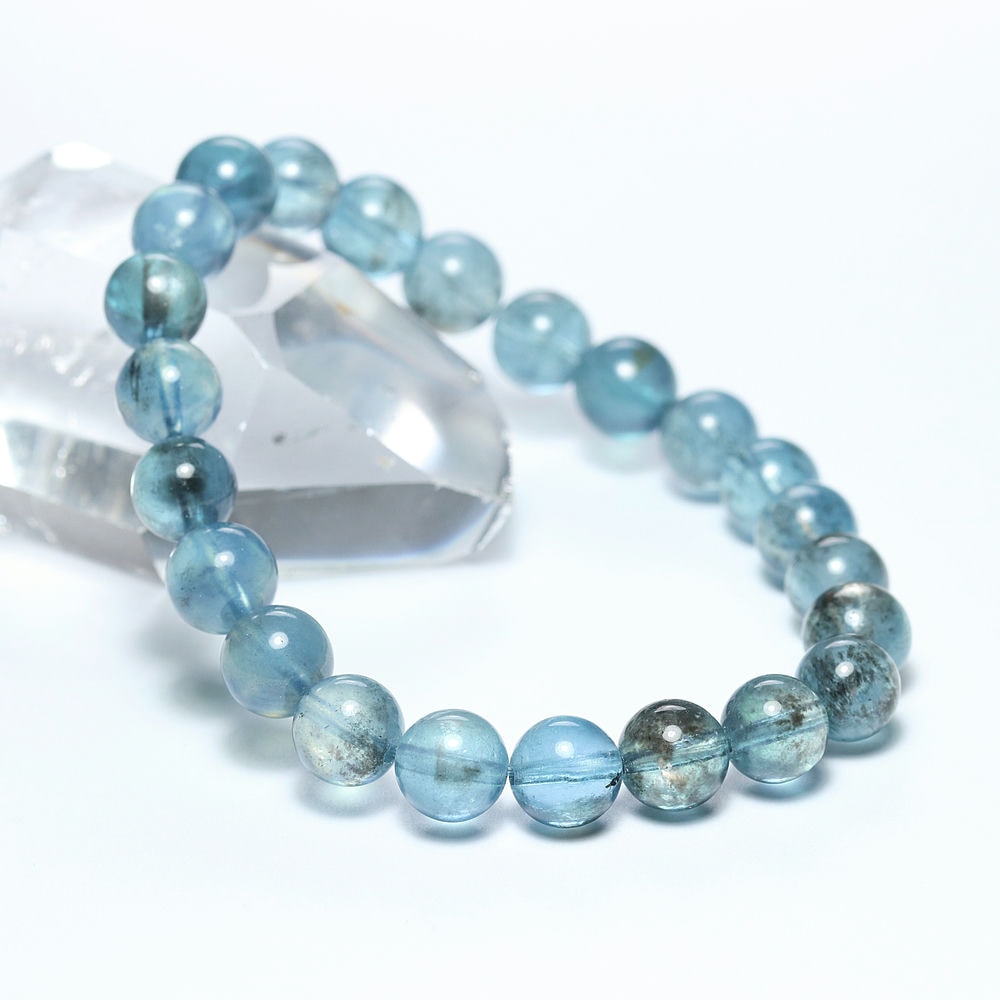 こちらの【高品質】は、透明感あるアクアマリンブルーをベースに、ダークカラーの鉱物いわゆる “モス感” がほどよく出ている粒で組み上げられております。