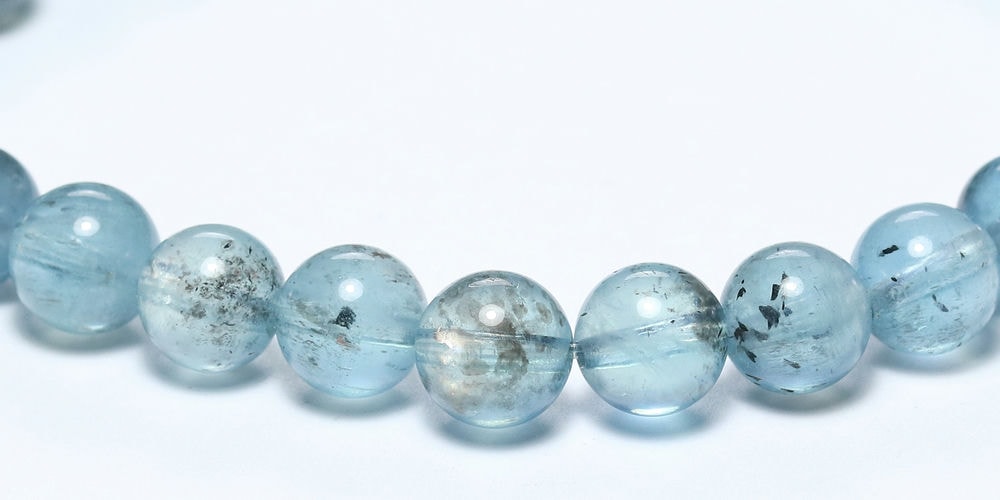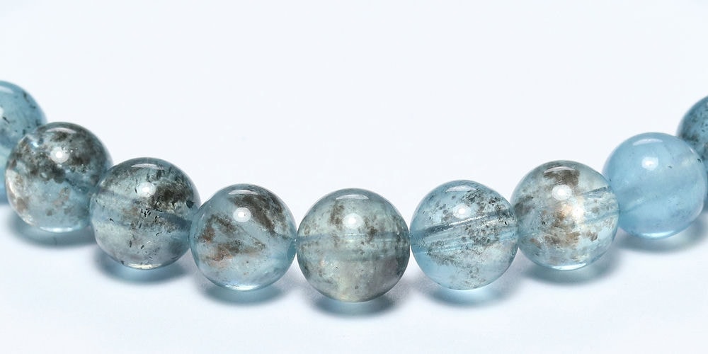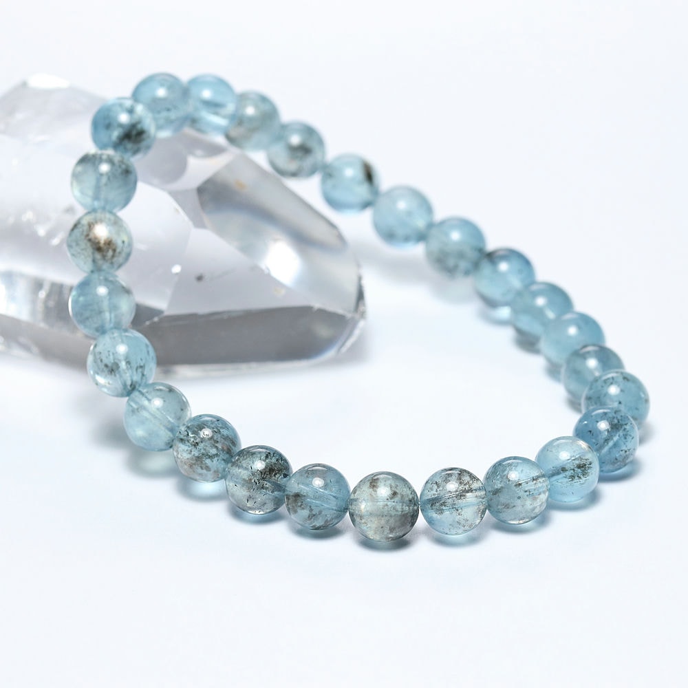アクアマリンにダークカラーの鉱物が混ざり合うスターモスアクアマリンブレスレットでございます。