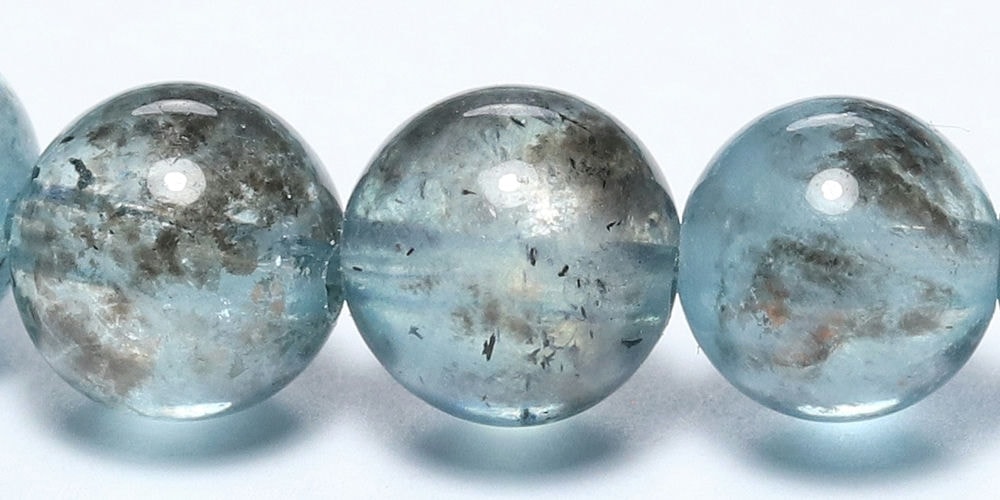 こちらの【高品質】は、透明感あるアクアマリンブルーをベースに、ダークカラーの鉱物いわゆる “モス感” がほどよく出ている粒で組み上げられております。