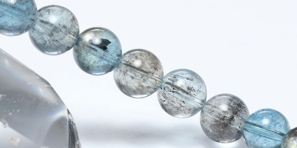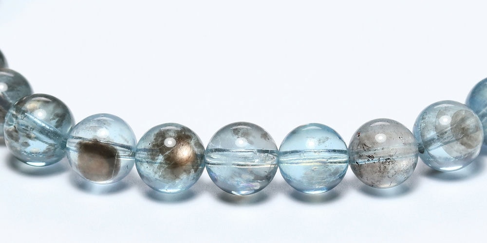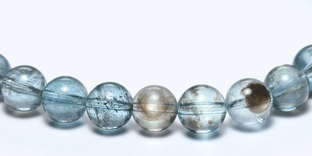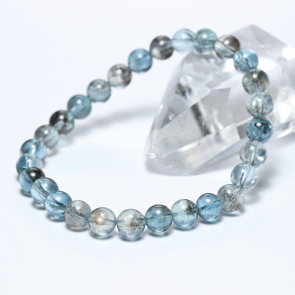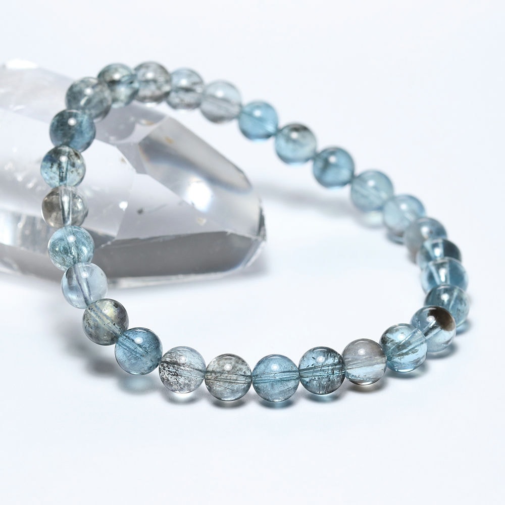 アクアマリンにダークカラーの鉱物が混ざり合うスターモスアクアマリンブレスレットでございます。