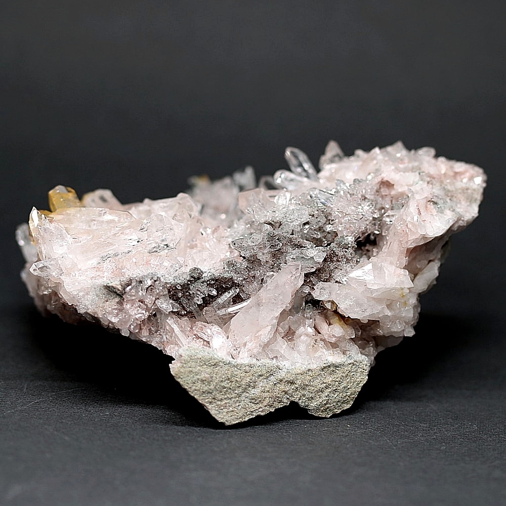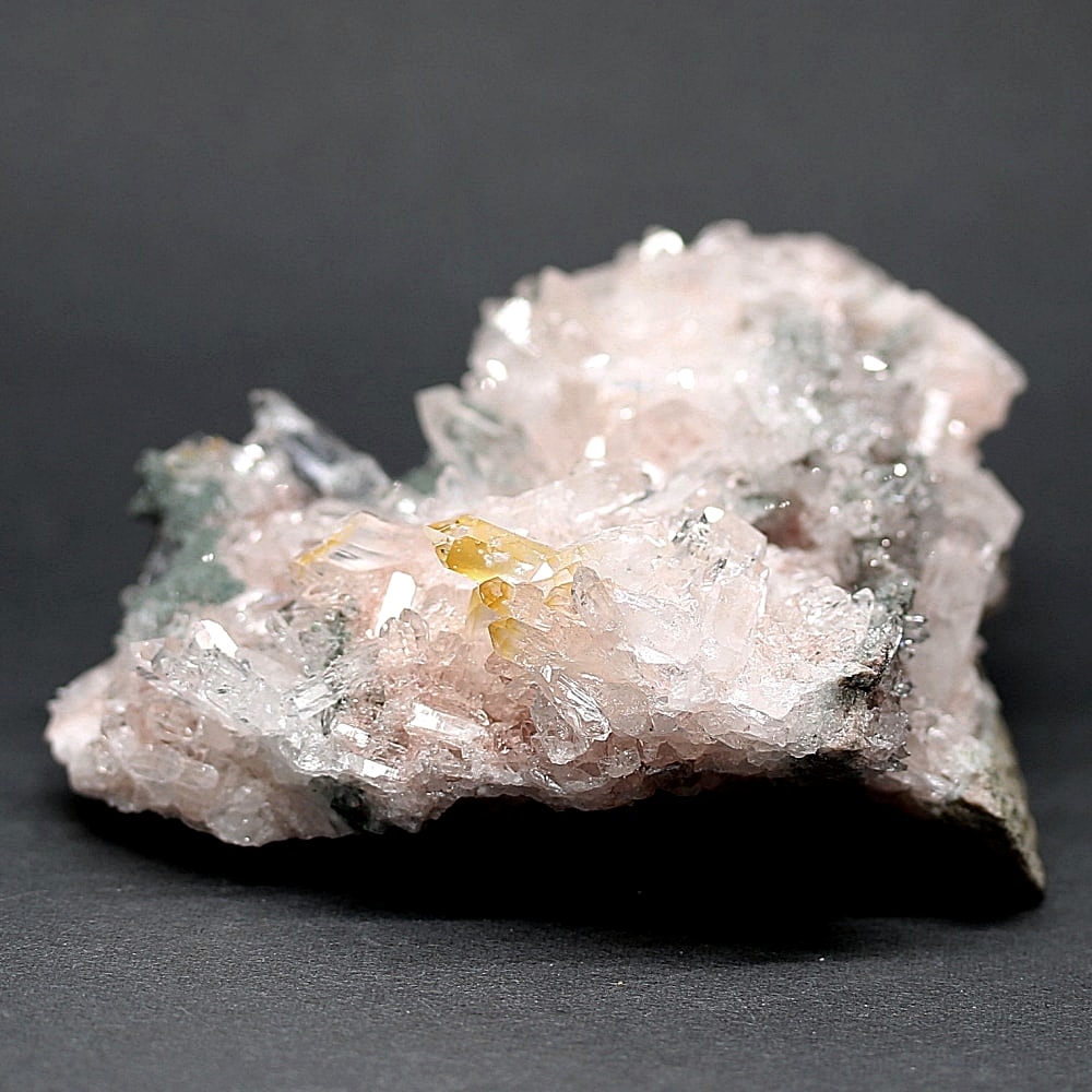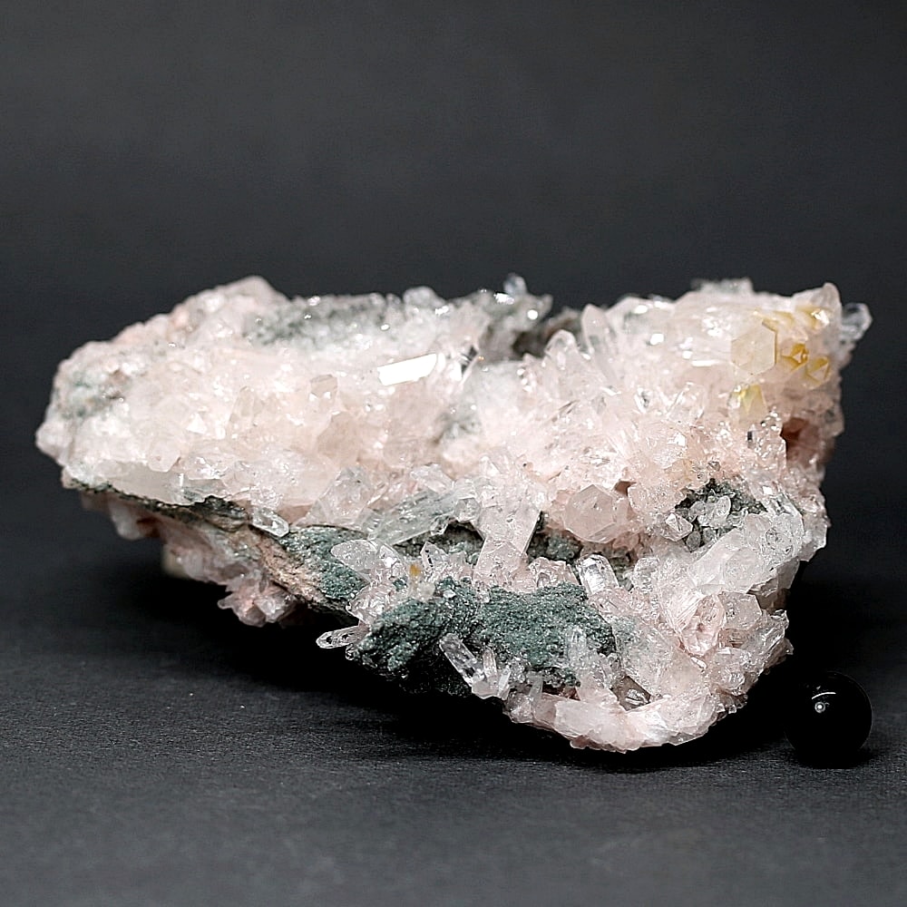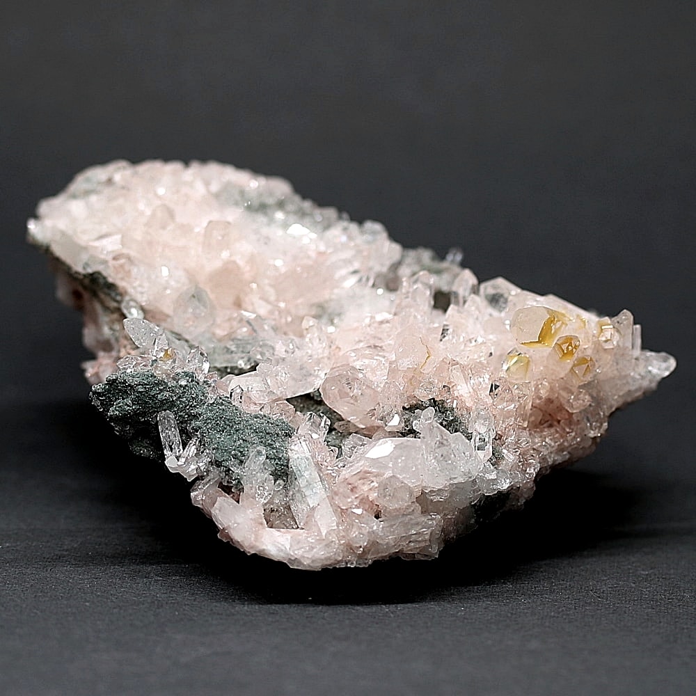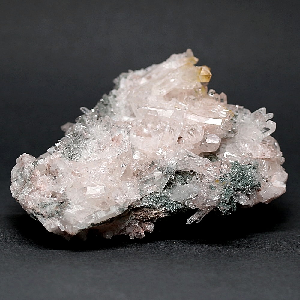 ご覧のお品は、高い透明度を保ちつつ、ほんのりピンクに色づく結晶が育っております。そこに緑泥石(クローライト)のグリーンが共生し、自然の生み出した瑞々しいコントラストを際立たせています。