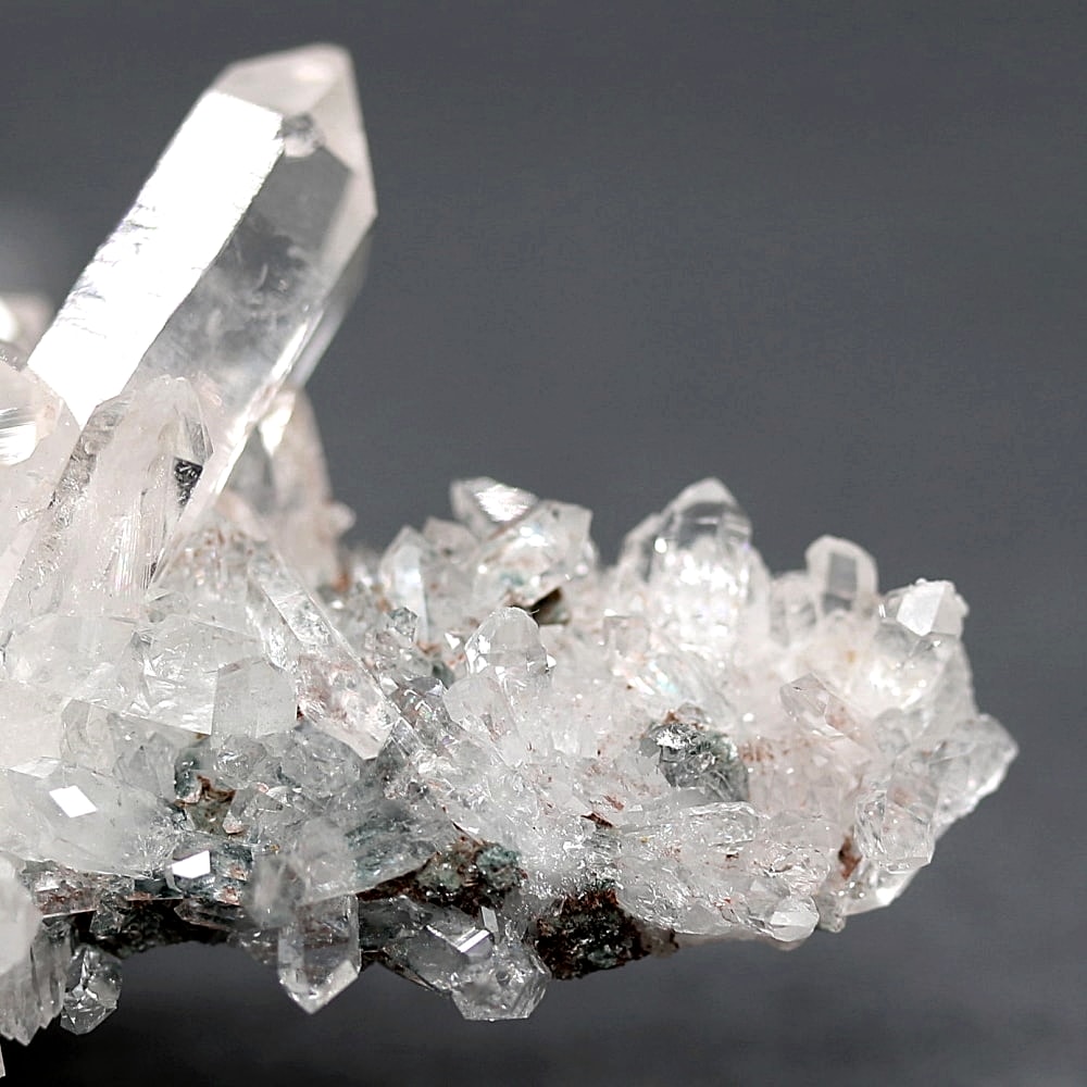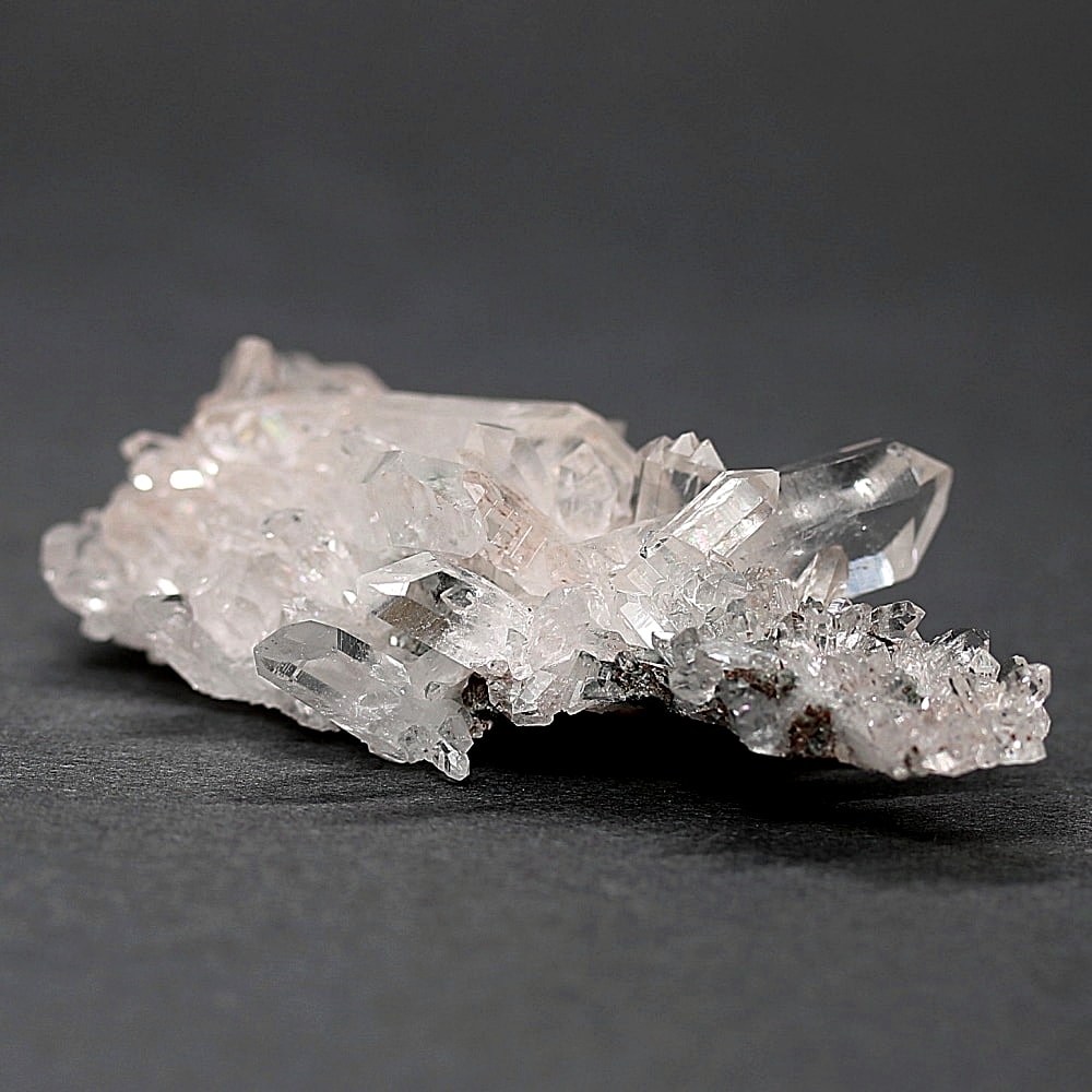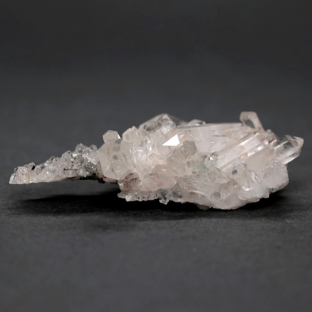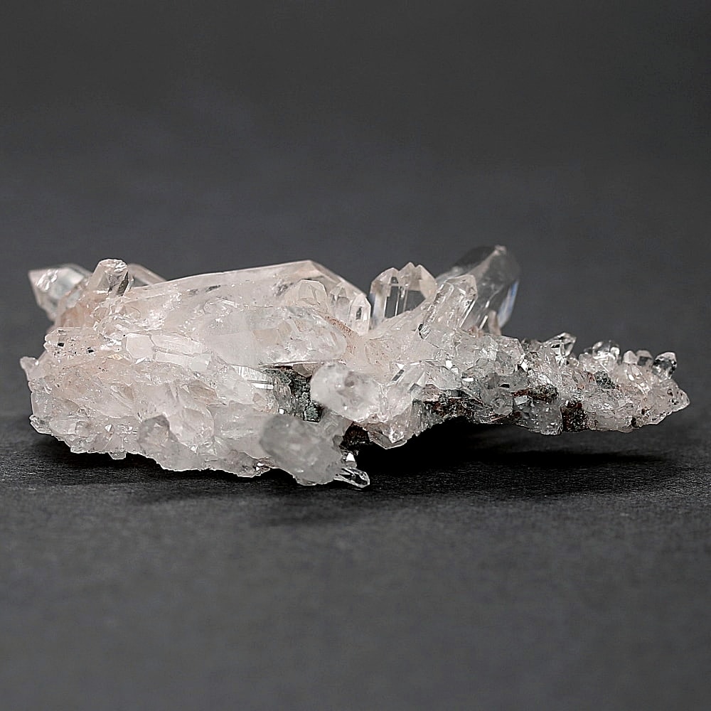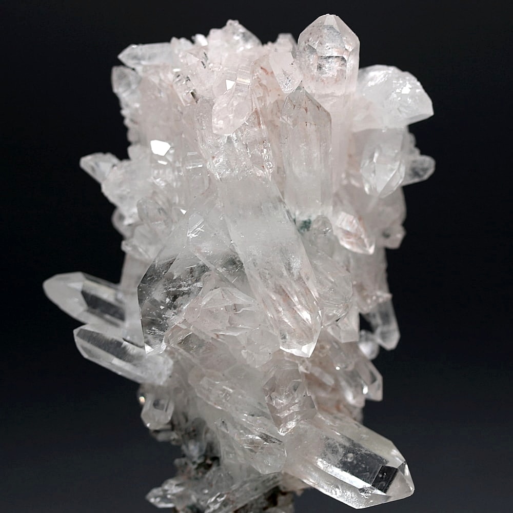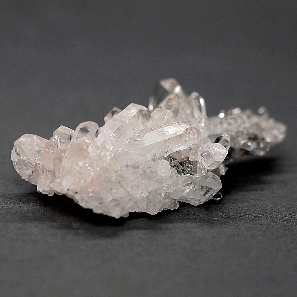 ご覧のお品は、高い透明度を保ちつつ、ほんのりピンクに色づく結晶が育っております。そこに緑泥石(クローライト)のグリーンが共生し、自然の生み出した瑞々しいコントラストを際立たせています。