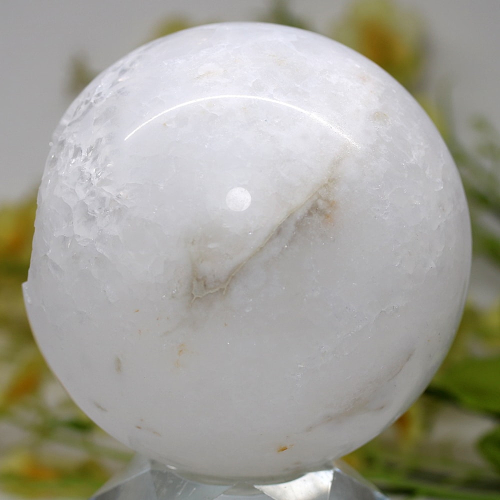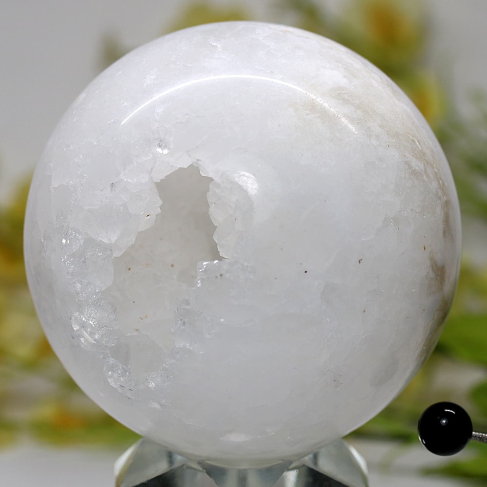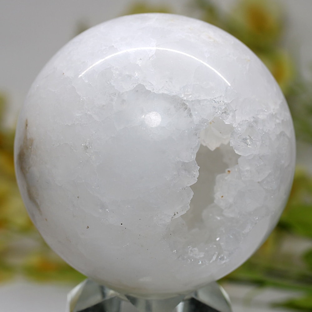 球体の一部が口を開けたように割れており、その内側に白や透明のクォーツ(水晶)の結晶がびっしりと敷き詰められています。
