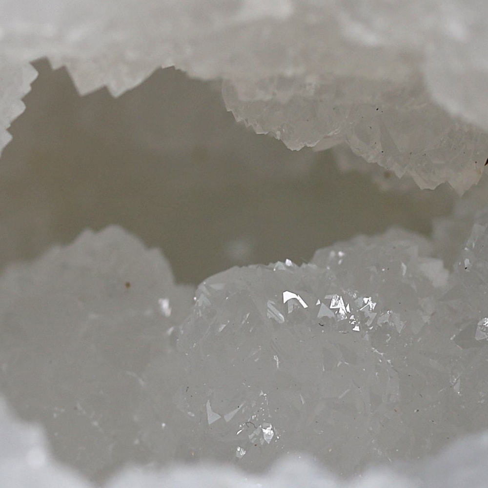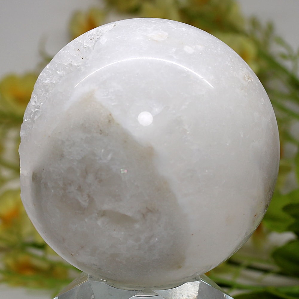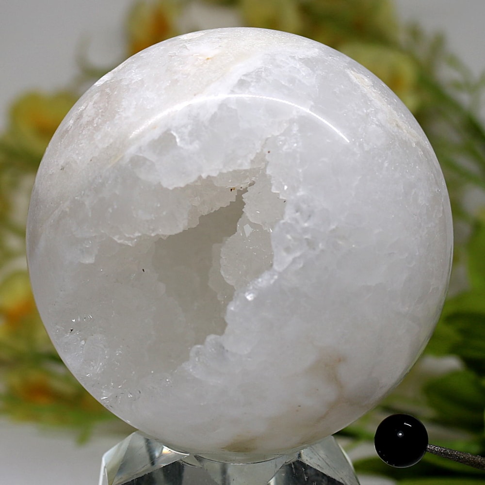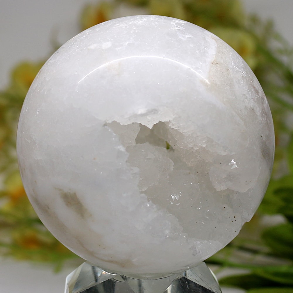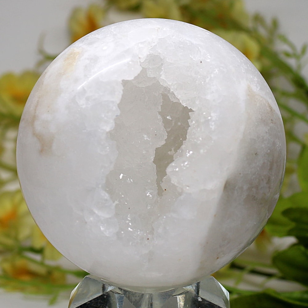 球体の一部が口を開けたように割れており、その内側に白や透明のクォーツ(水晶)の結晶がびっしりと敷き詰められています。