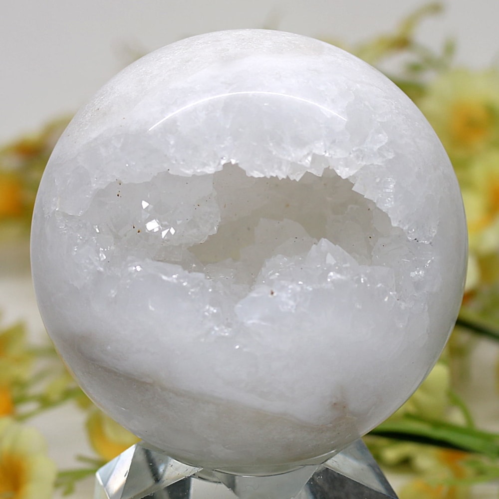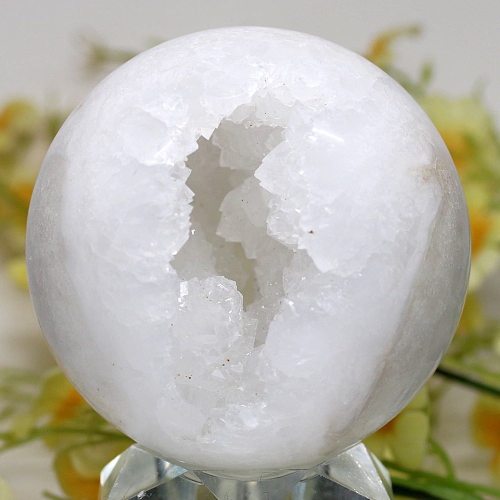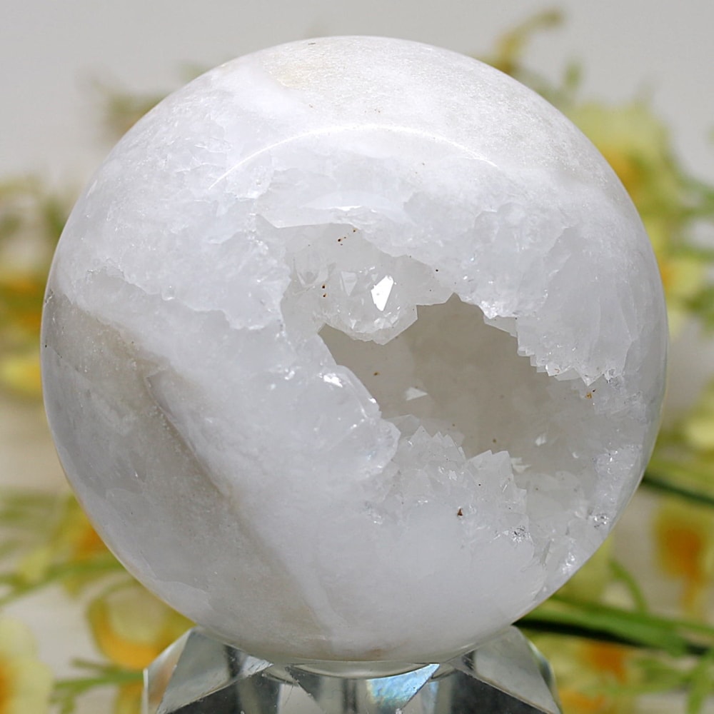 球体の一部が口を開けたように割れており、その内側に白や透明のクォーツ(水晶)の結晶がびっしりと敷き詰められています。