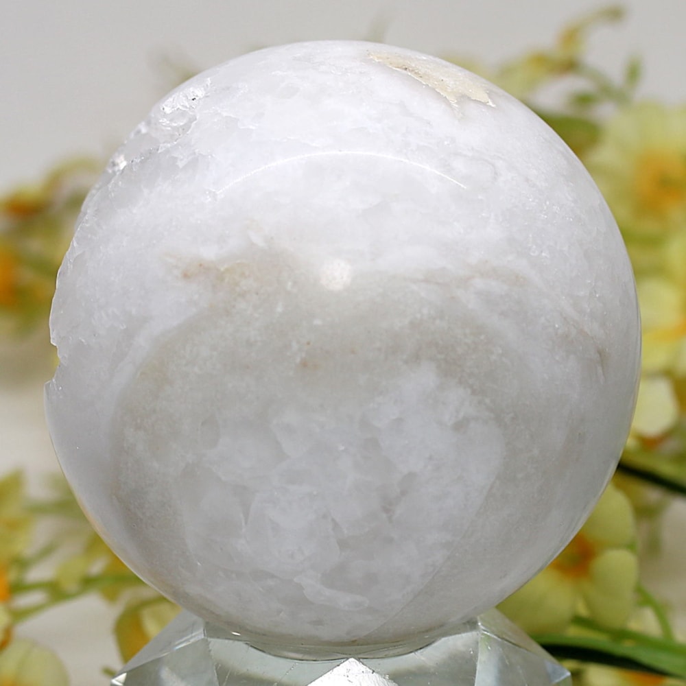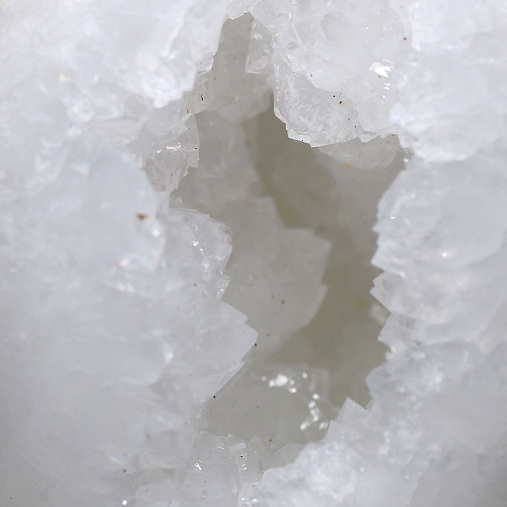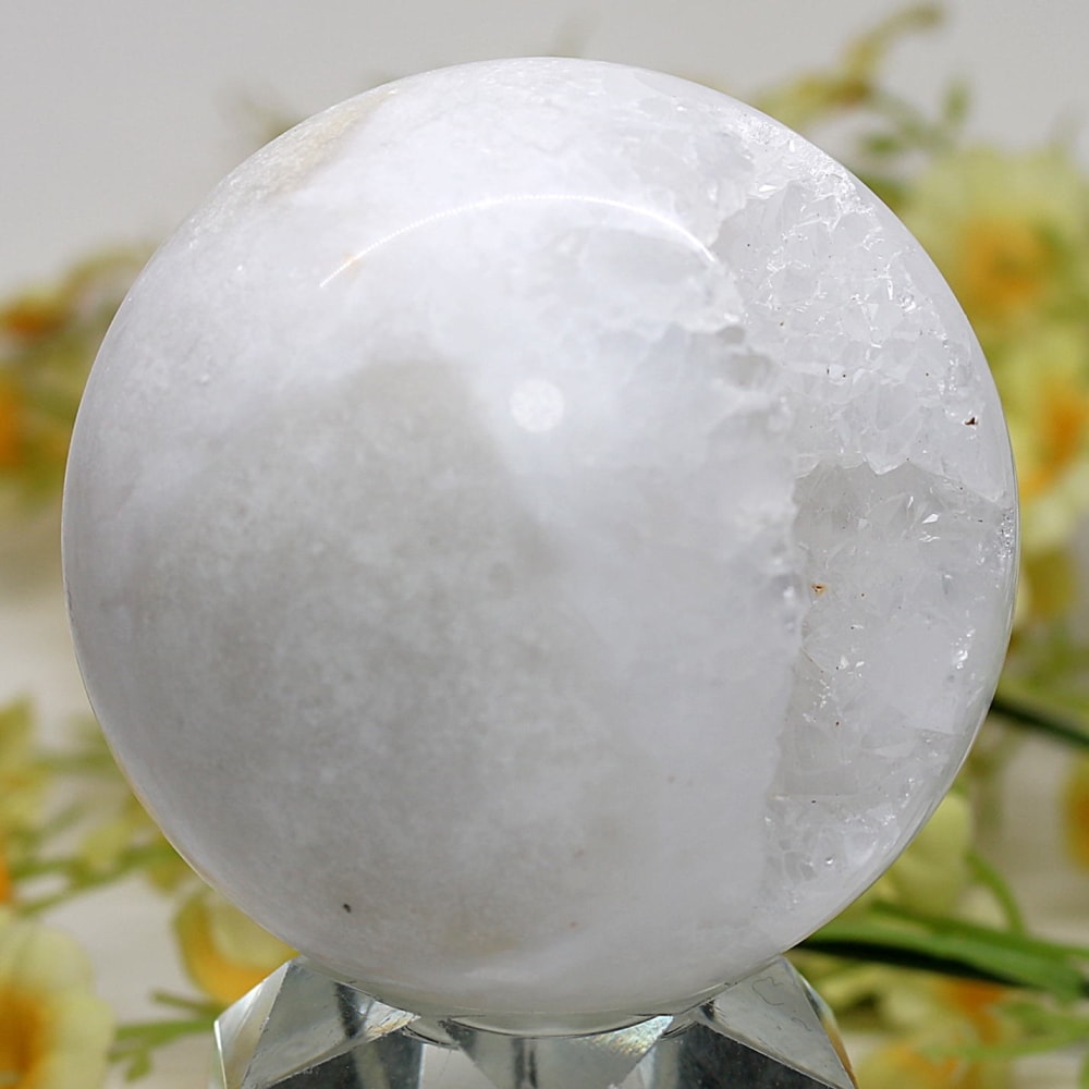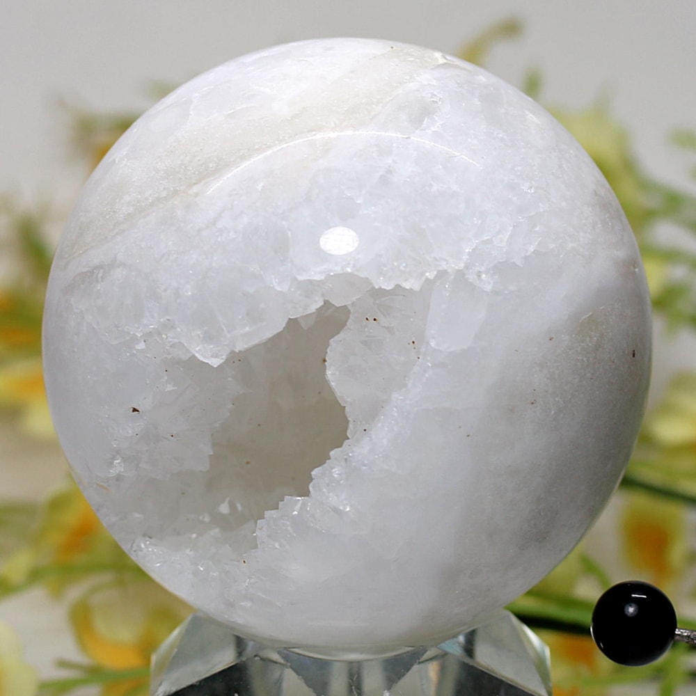 球体の一部が口を開けたように割れており、その内側に白や透明のクォーツ(水晶)の結晶がびっしりと敷き詰められています。