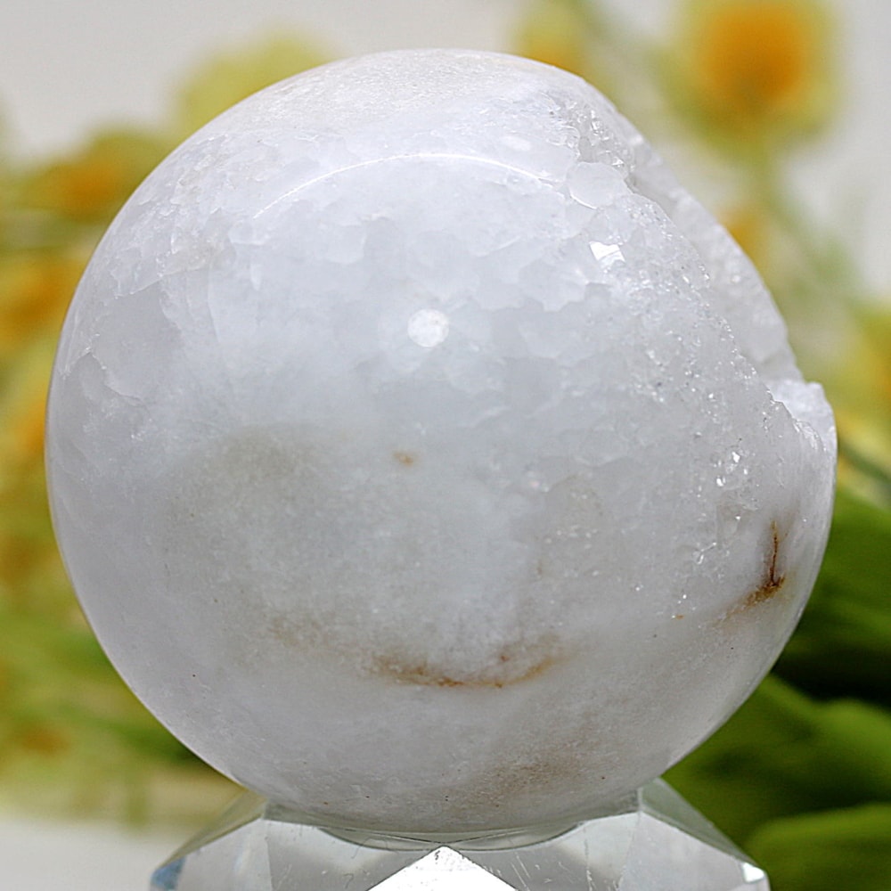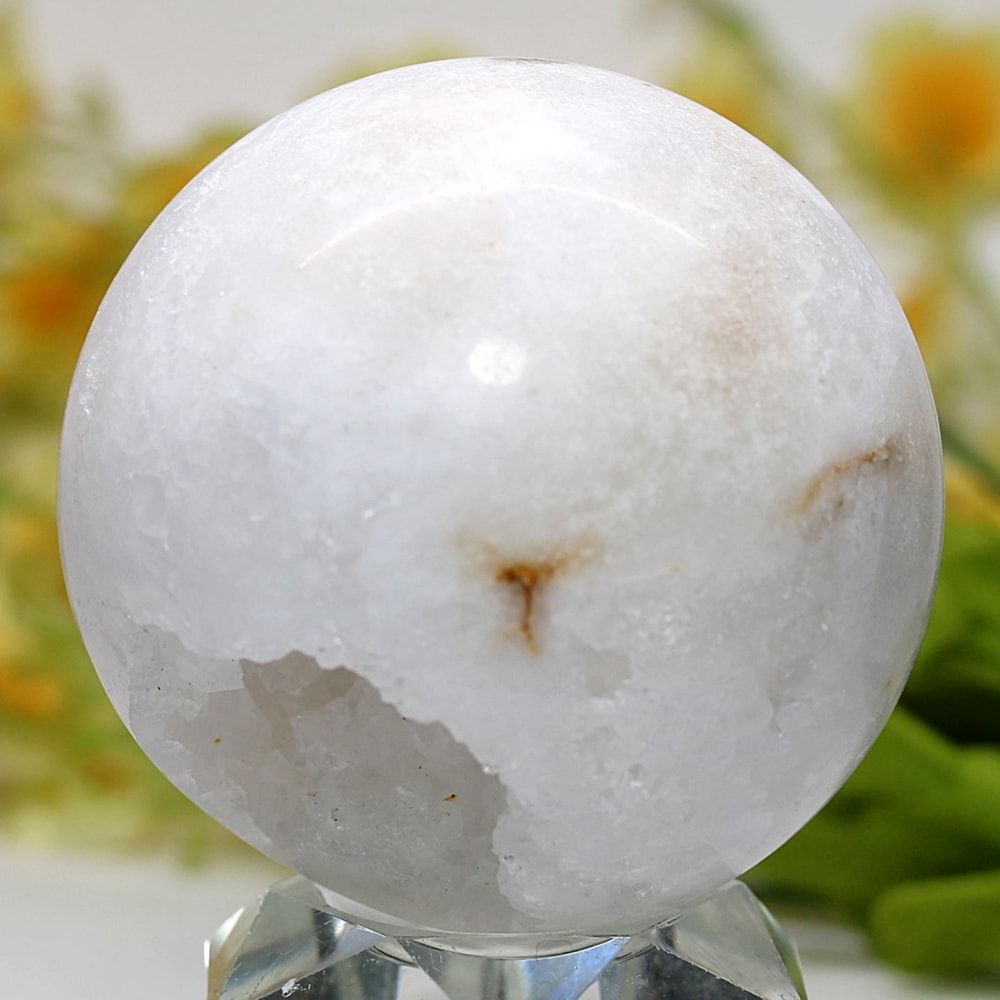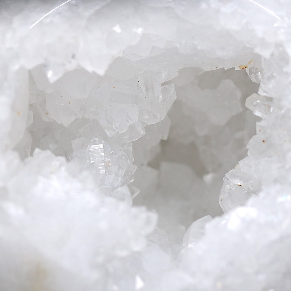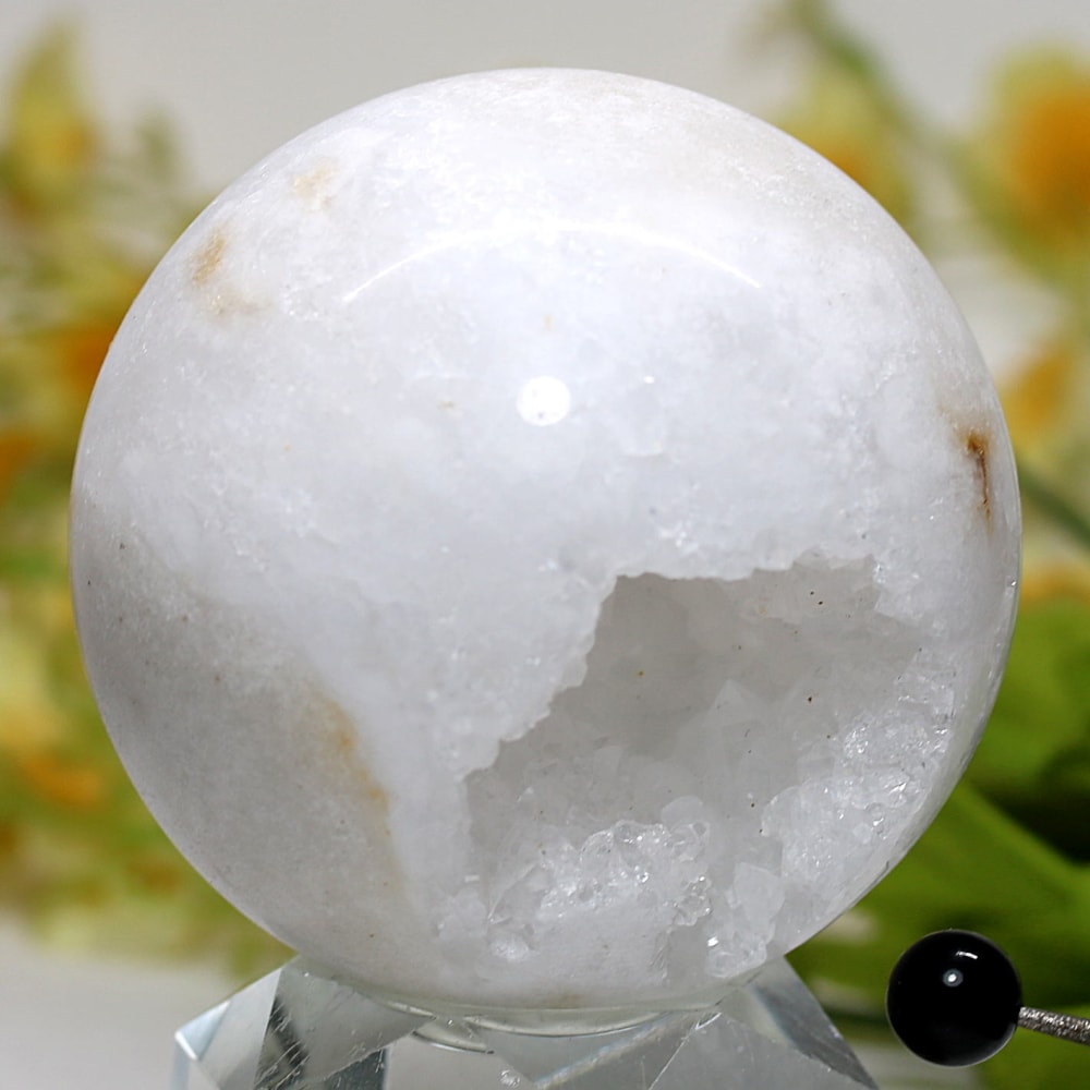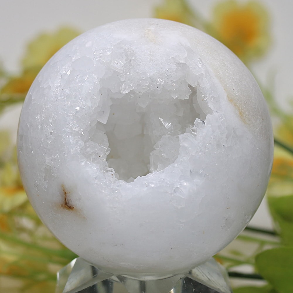 球体の一部が口を開けたように割れており、その内側に白や透明のクォーツ(水晶)の結晶がびっしりと敷き詰められています。