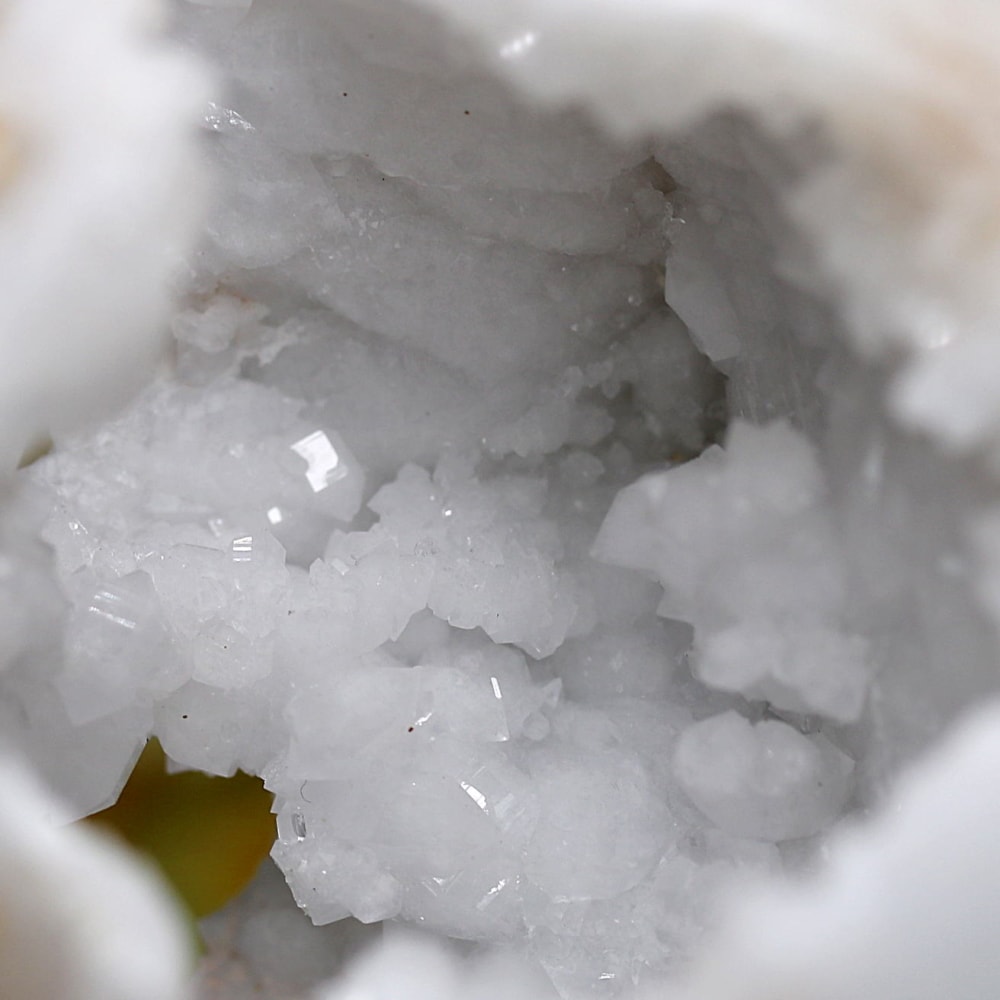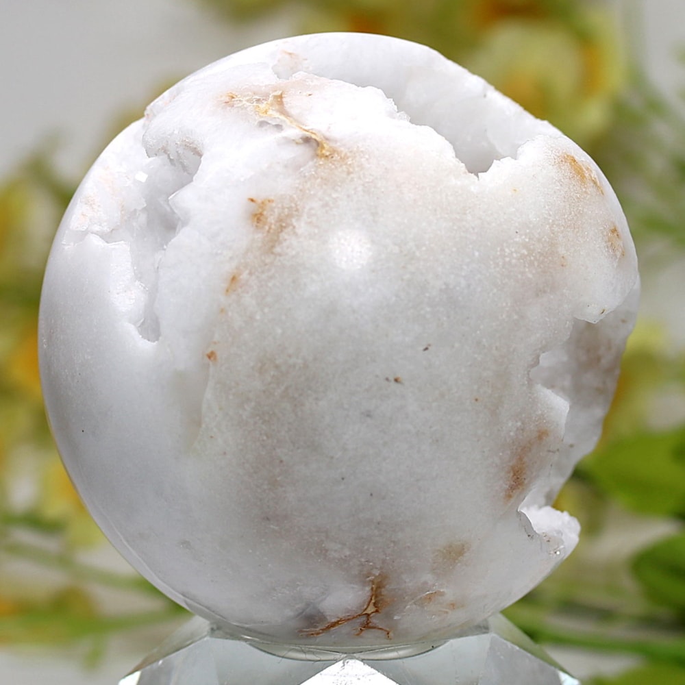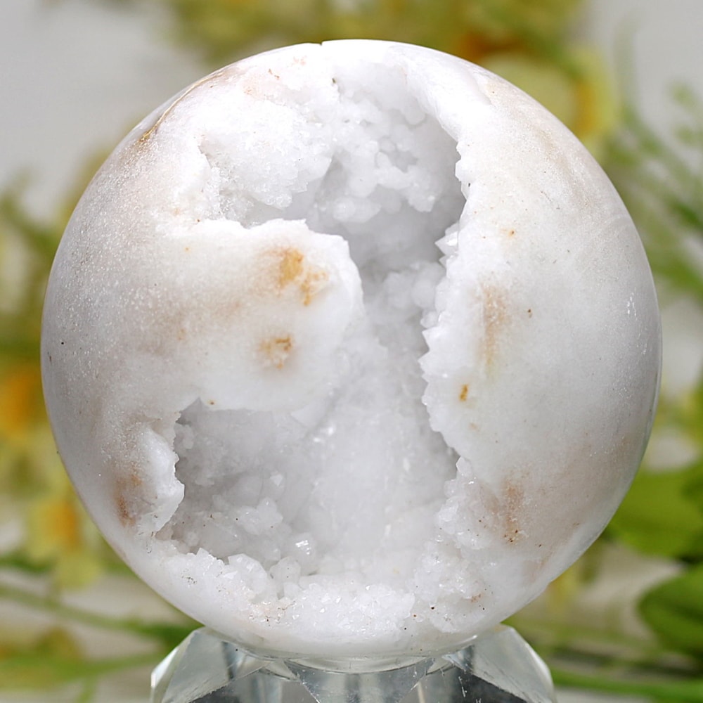 球体の一部が口を開けたように割れており、その内側に白や透明のクォーツ(水晶)の結晶がびっしりと敷き詰められています。