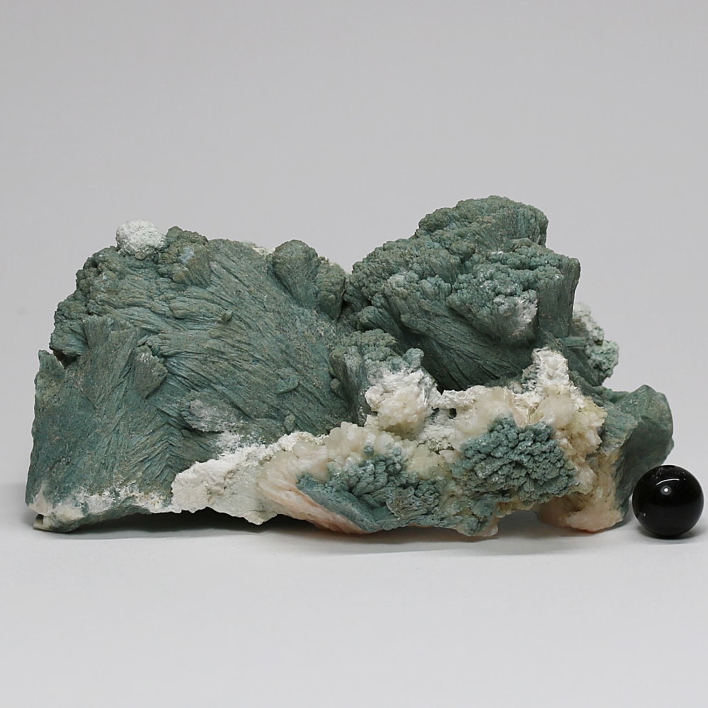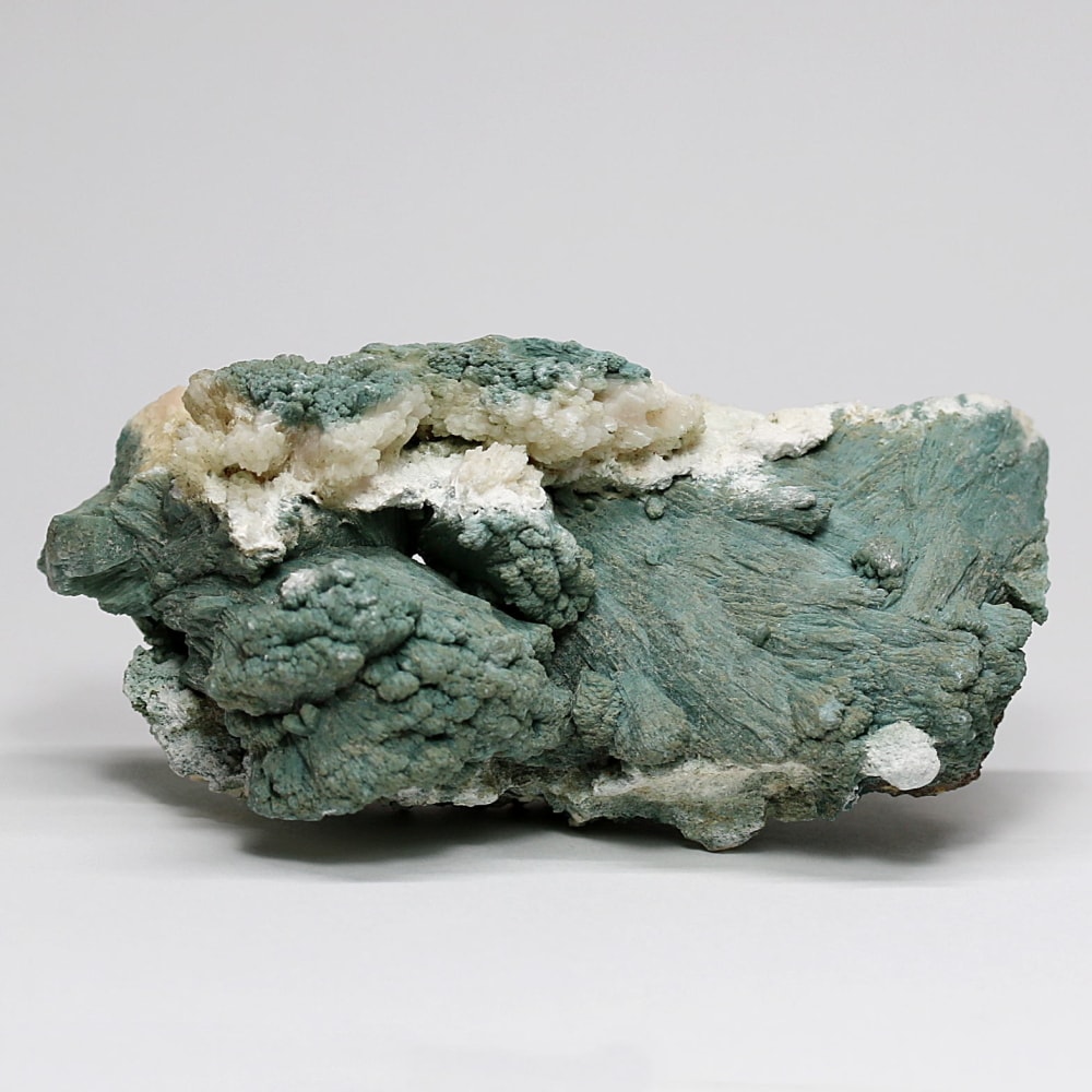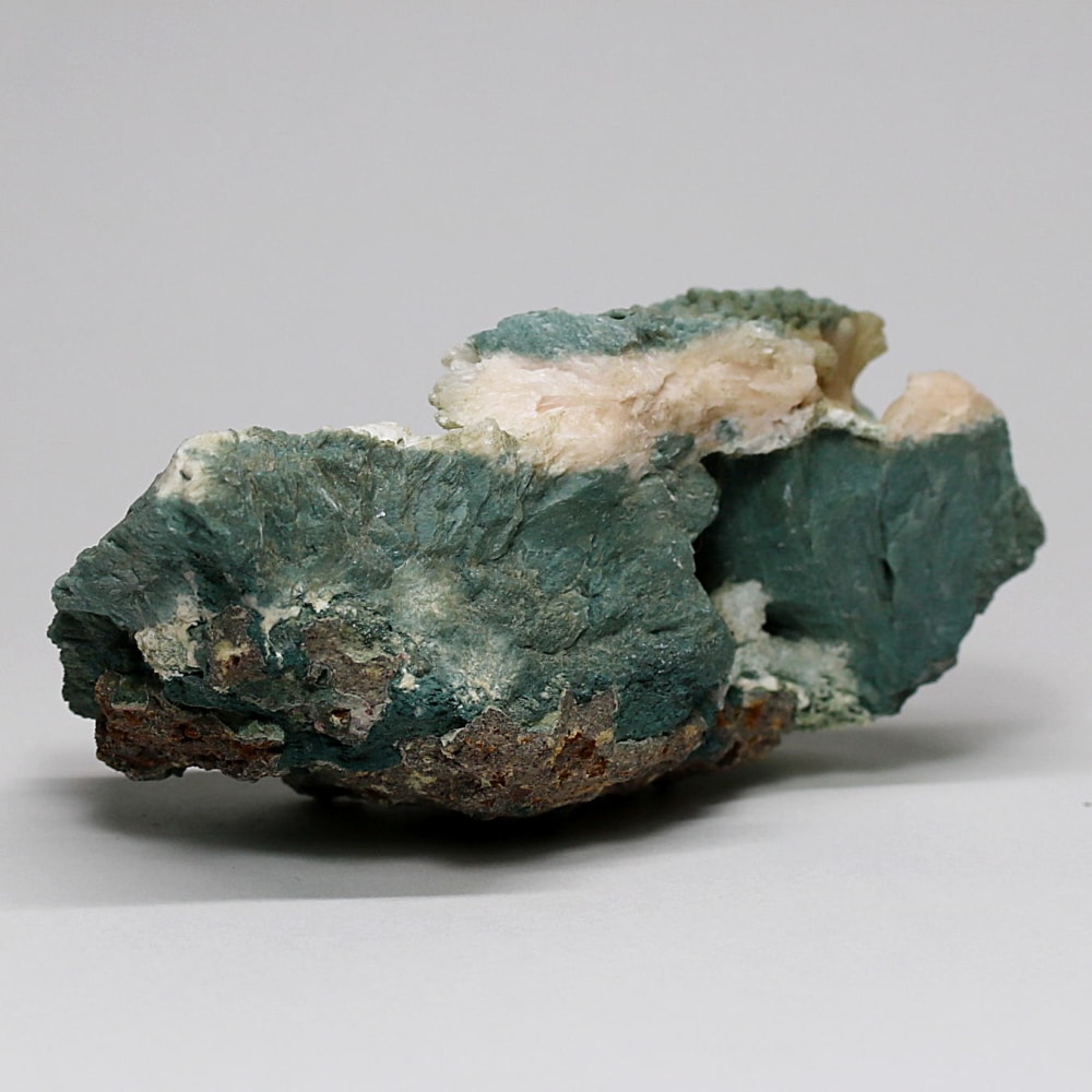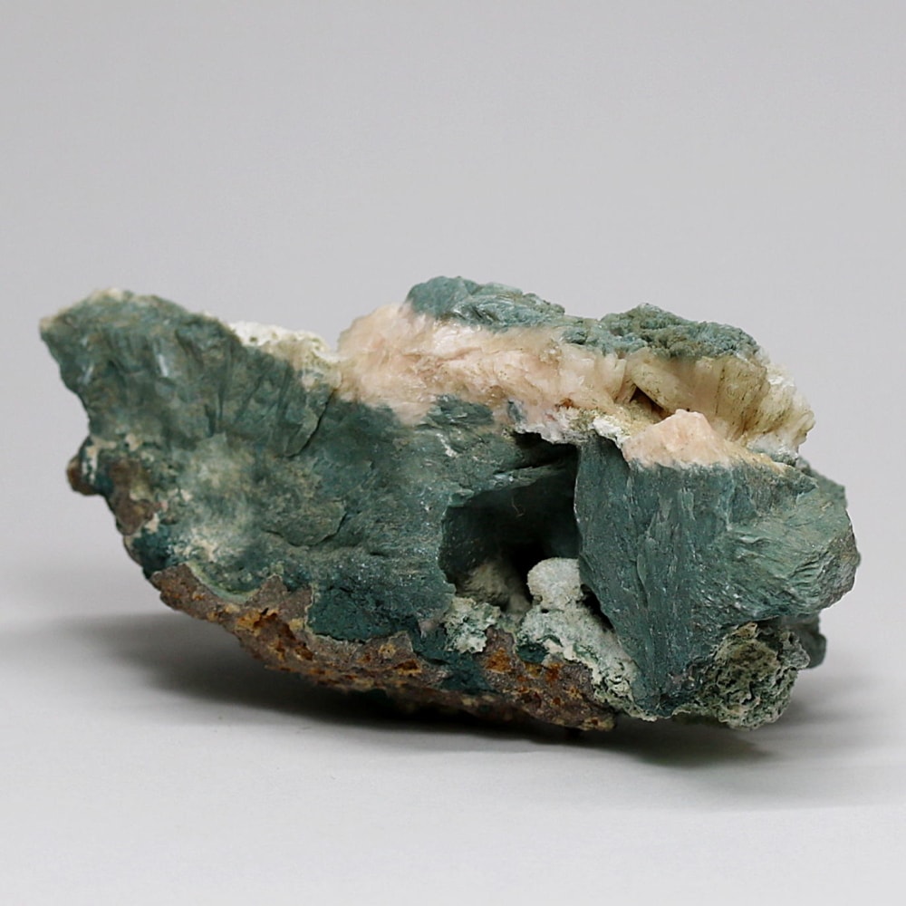 同じゼオライトグループに属しながら、それぞれ異なる結晶形を持つヒューランダイト(輝沸石)とスティルバイト(束沸石)。 その個性的な結晶を、落ち着いたフォレストグリーンが包み込むことで、鉱物標本としても非常に味わい深い景観を作り上げています。