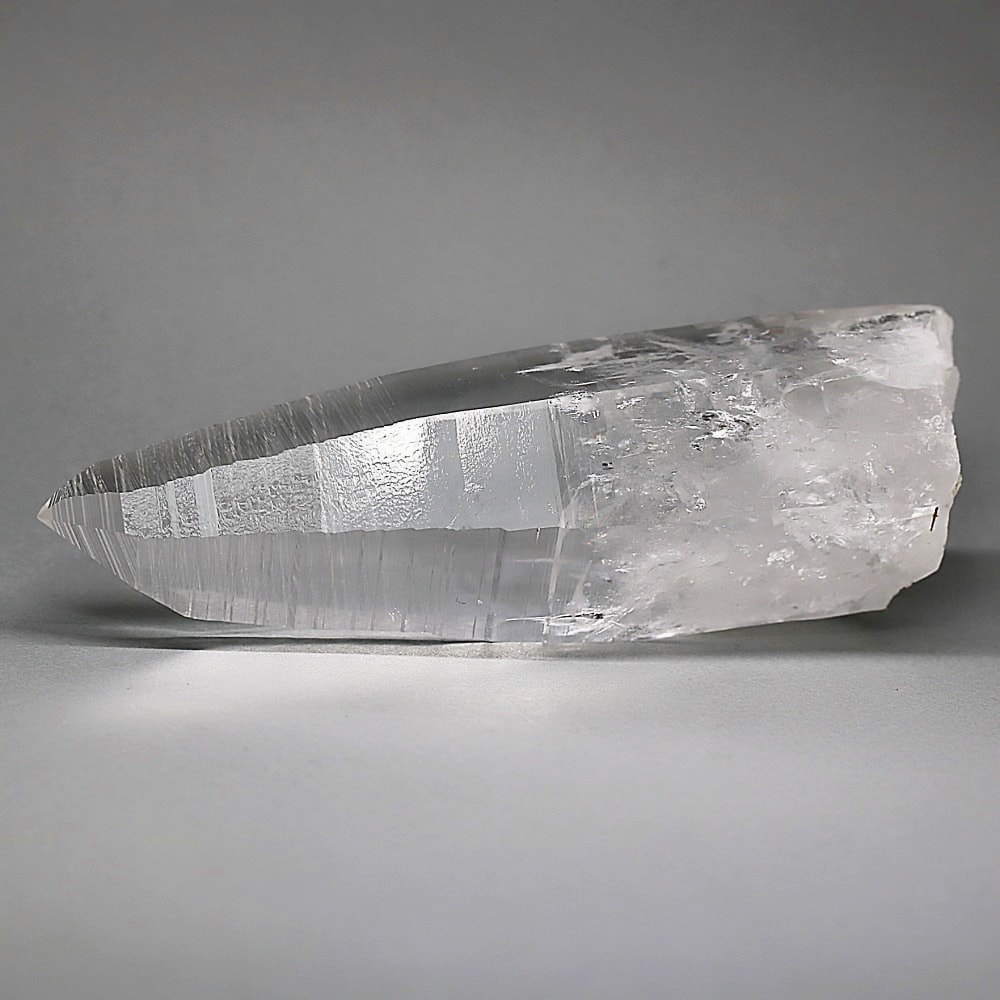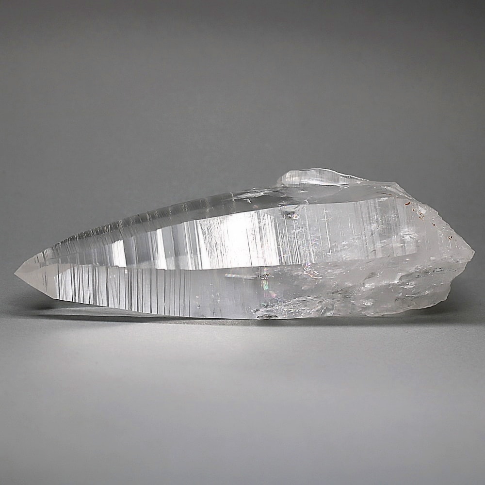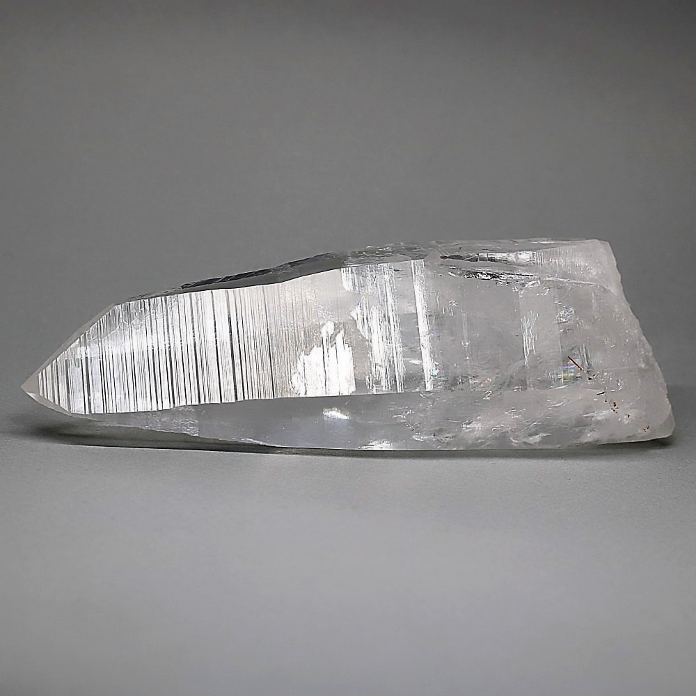 氷のように澄みきった透明度を持つ結晶は、まるで人の手で整えられたかのような端正なシルエットを備えており、ファセット欠損も極めて少ない洗練されたディテールが見事です。