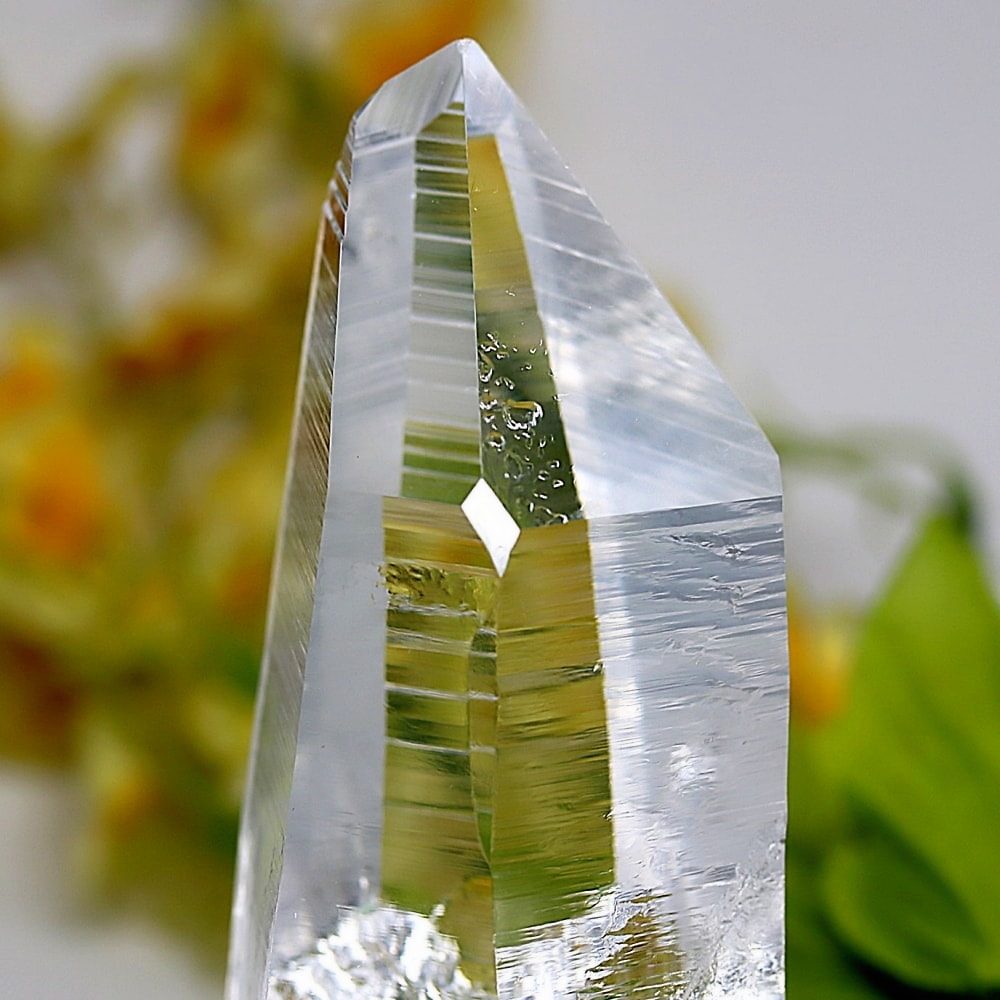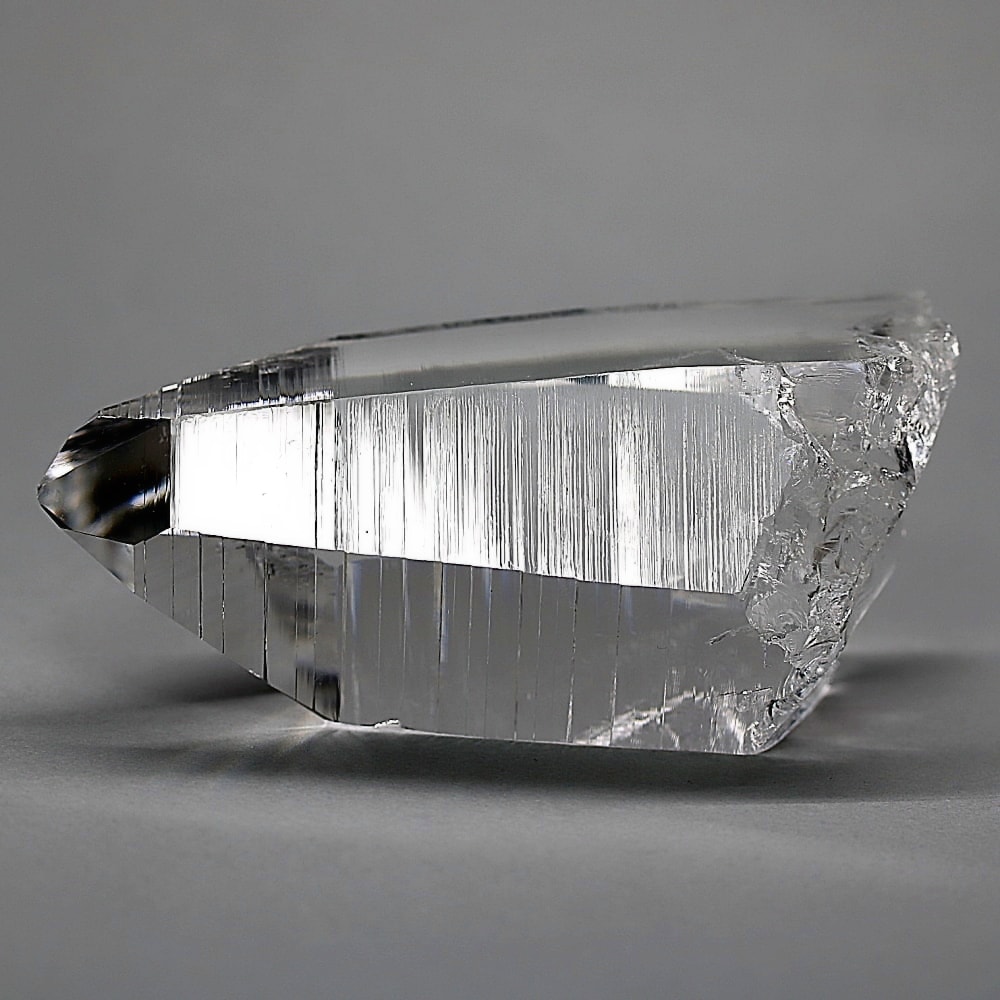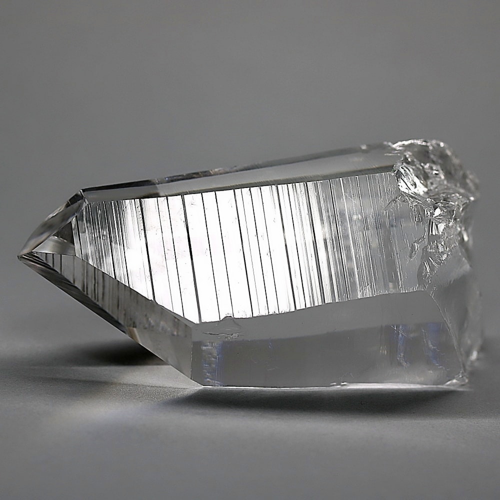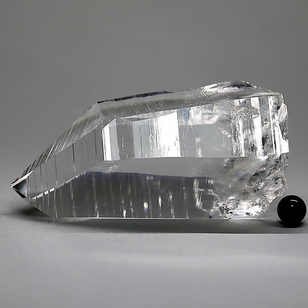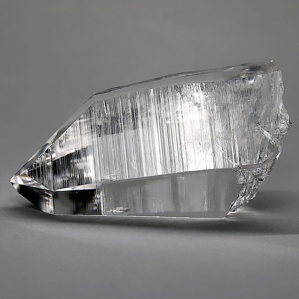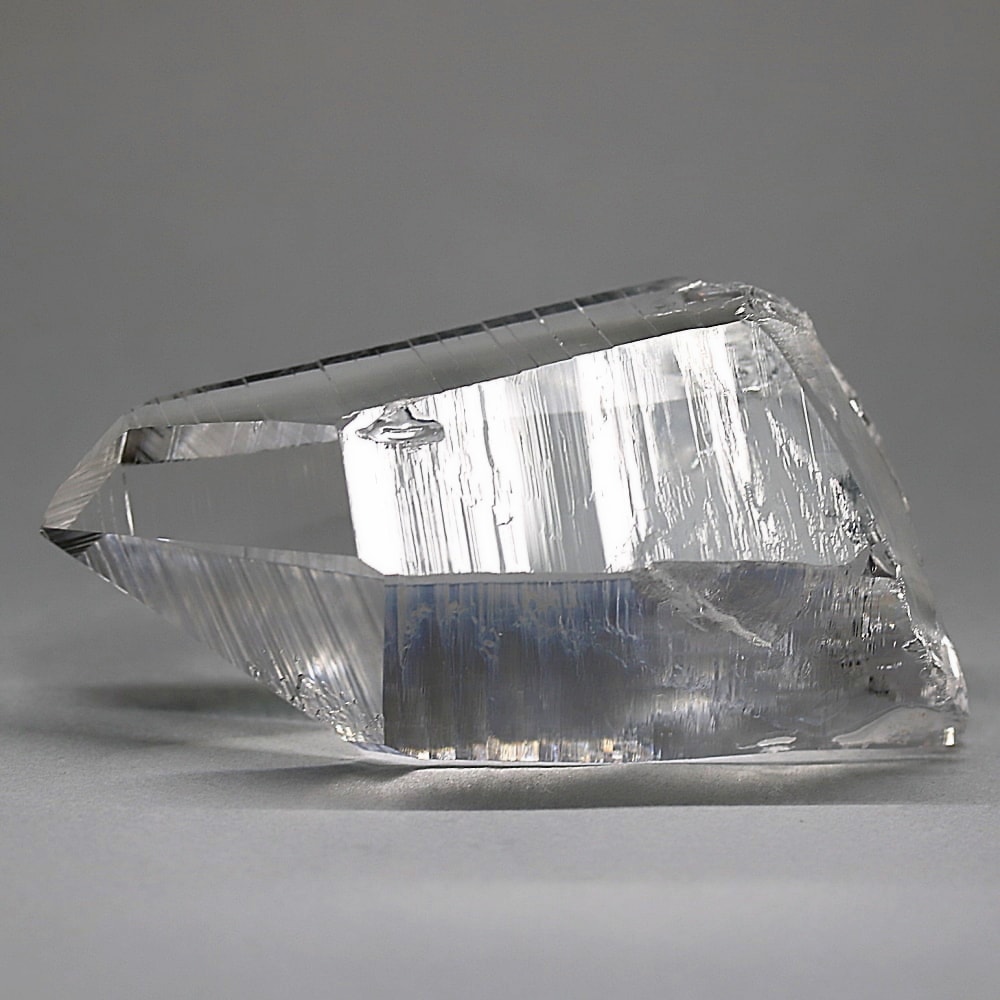 氷のように澄みきった透明度を持つ結晶は、まるで人の手で整えられたかのような端正なシルエットを備えており、ファセット欠損も極めて少ない洗練されたディテールが見事です。